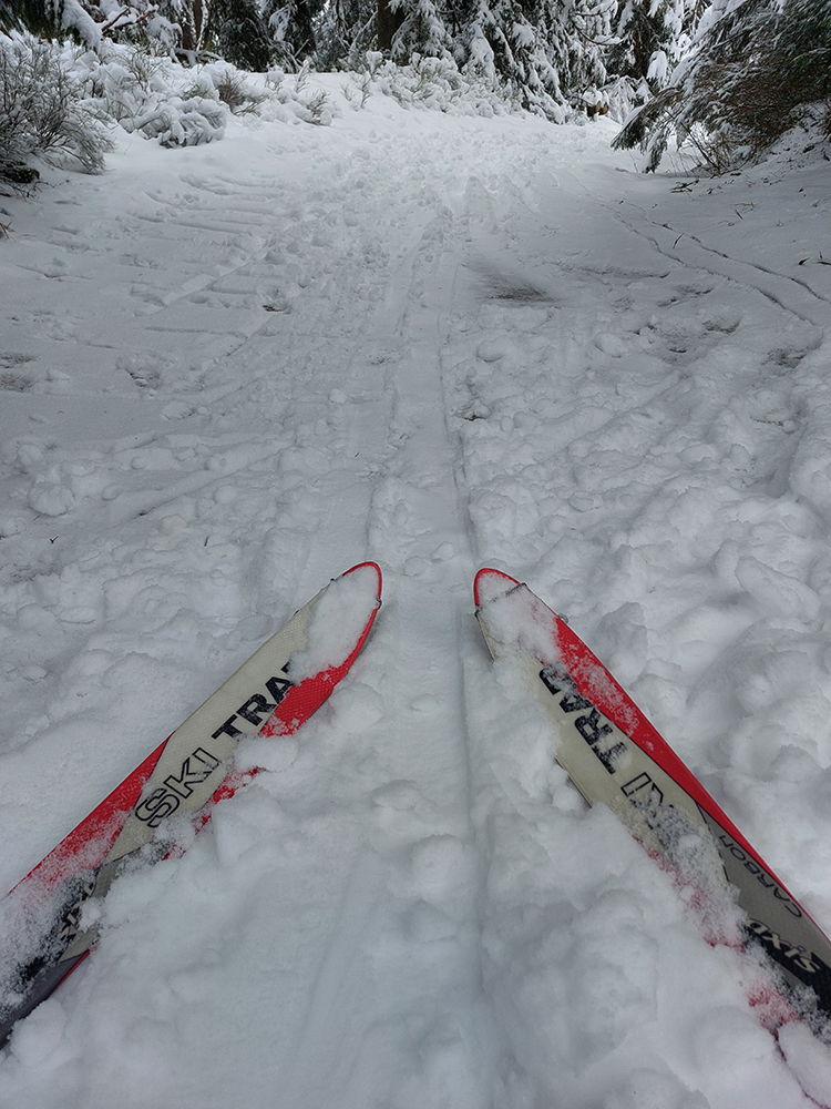 Noooo hej, napadlo – od päť do dvadsať čísiel, na žiadny základ. Alebo teda na ľadový, vo vyšších polohách. V nižších polohách možno aj posledný raz tejto zimy. Na strmých svahoch nová perina neprilepená a hrozba lavín, v nižších polohách nula snehu, tak ako sa dostať tam, kde by sa dalo aspoň poprechádzať? Nájdu sa isto aj miesta, kde sa dá dobre polyžovať, ale treba vychádzať z reálnych možností. Takže požiadavka znela: nenosiť a neprenášať dlho a najlepšie ani často pásy neodliepať. Preto vlakom do Rybárpoľa a po 20 minútach pešovania lyže na sneh - na umelý, zjazdovkový, široko – ďaleko jediný, ako inak. O siedmej ráno, nech potom nezavadziam. A samozrejme som nebol jediný ani prvý. Niektorí ranostaji už tam po výšľape balili kšeft. Vzal som kameňáky a aj pásy som nahodil tie najstaršie, lebo som tušil, že na ľadovom menčestri budú stačiť a vyššie v lesoch im poukrývané zákernosti nebudú až tak vadiť. Dole sviežich vari mínus päť, cez deň vraj o 10 viac, hore malo byť cez deň mierne pod nulou.