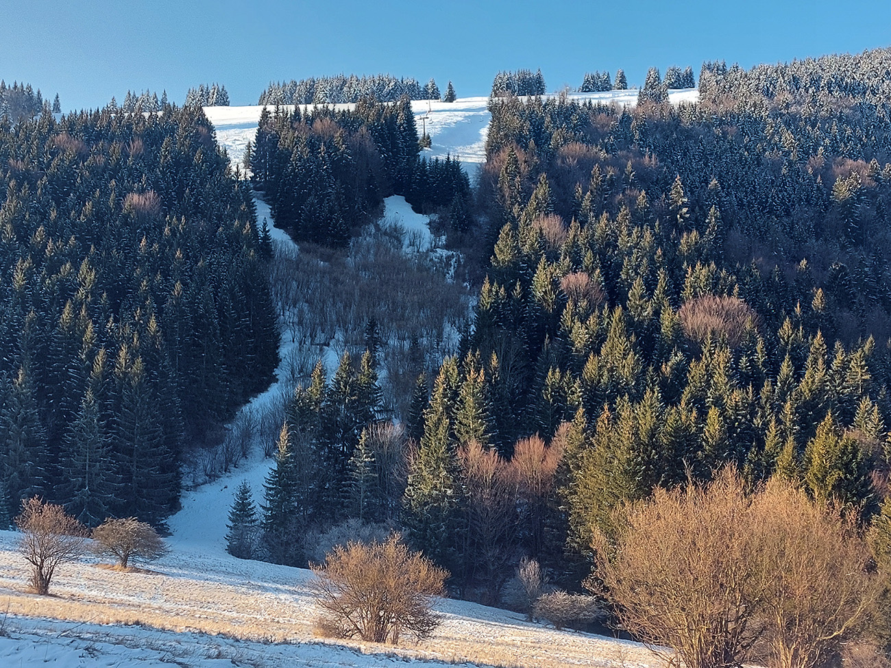 Pista prázdna, hore z jej konca pohľad do „pretekárskeho“ výseku ukázal tiež prázdno. Snehu tam vyzerá, že medzi lieskami by aj bolo na výstup, ale kto by sa tam drel v nejakej ľadovej stope, že?