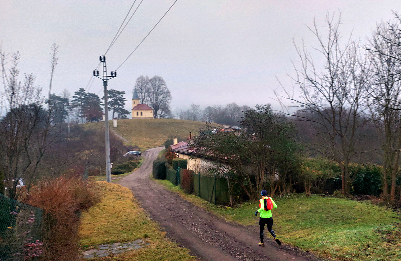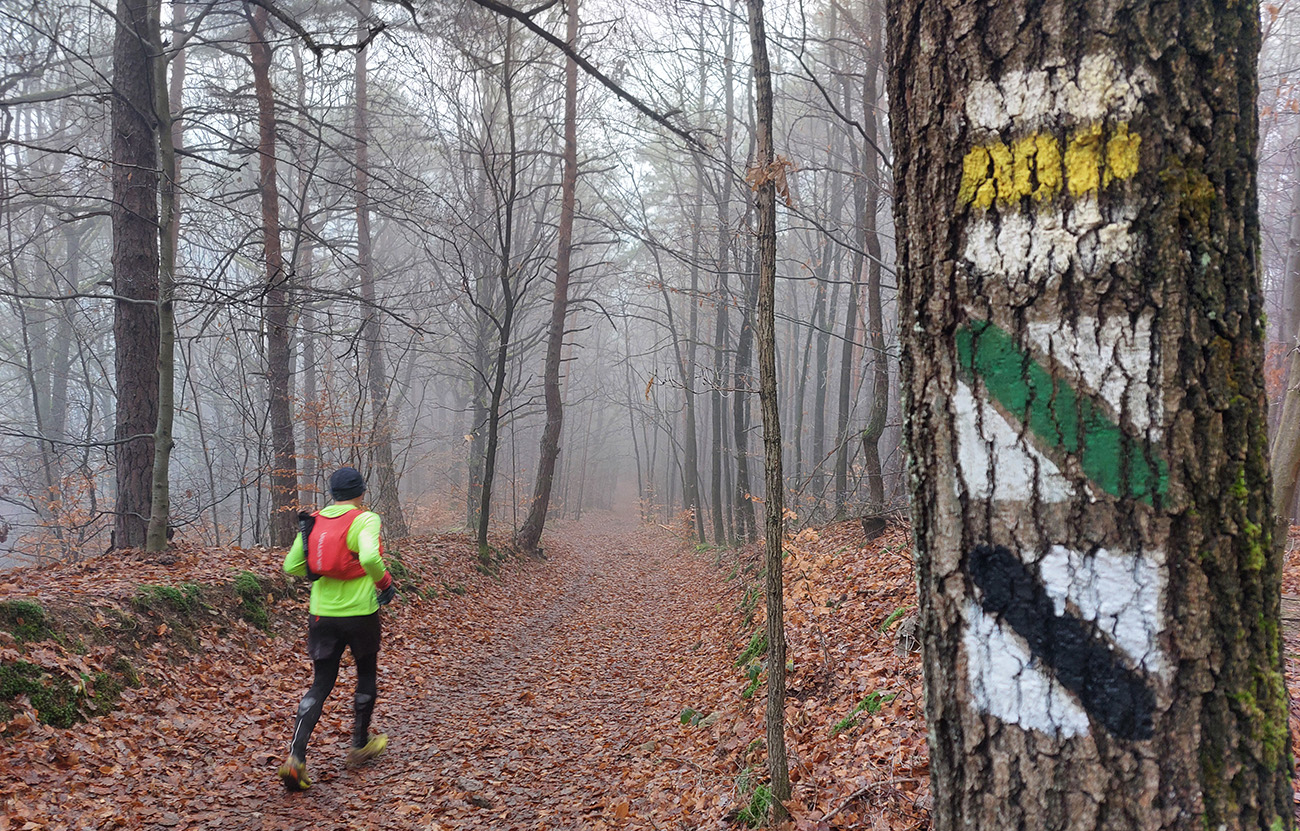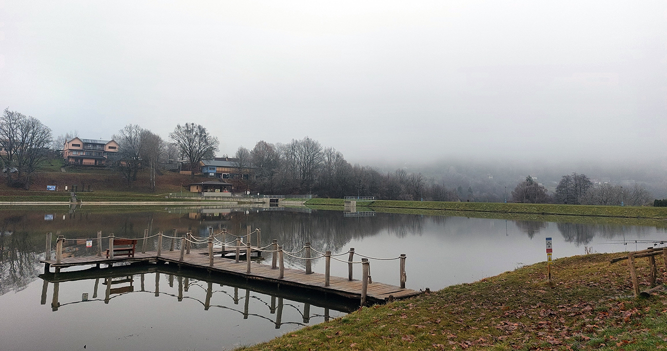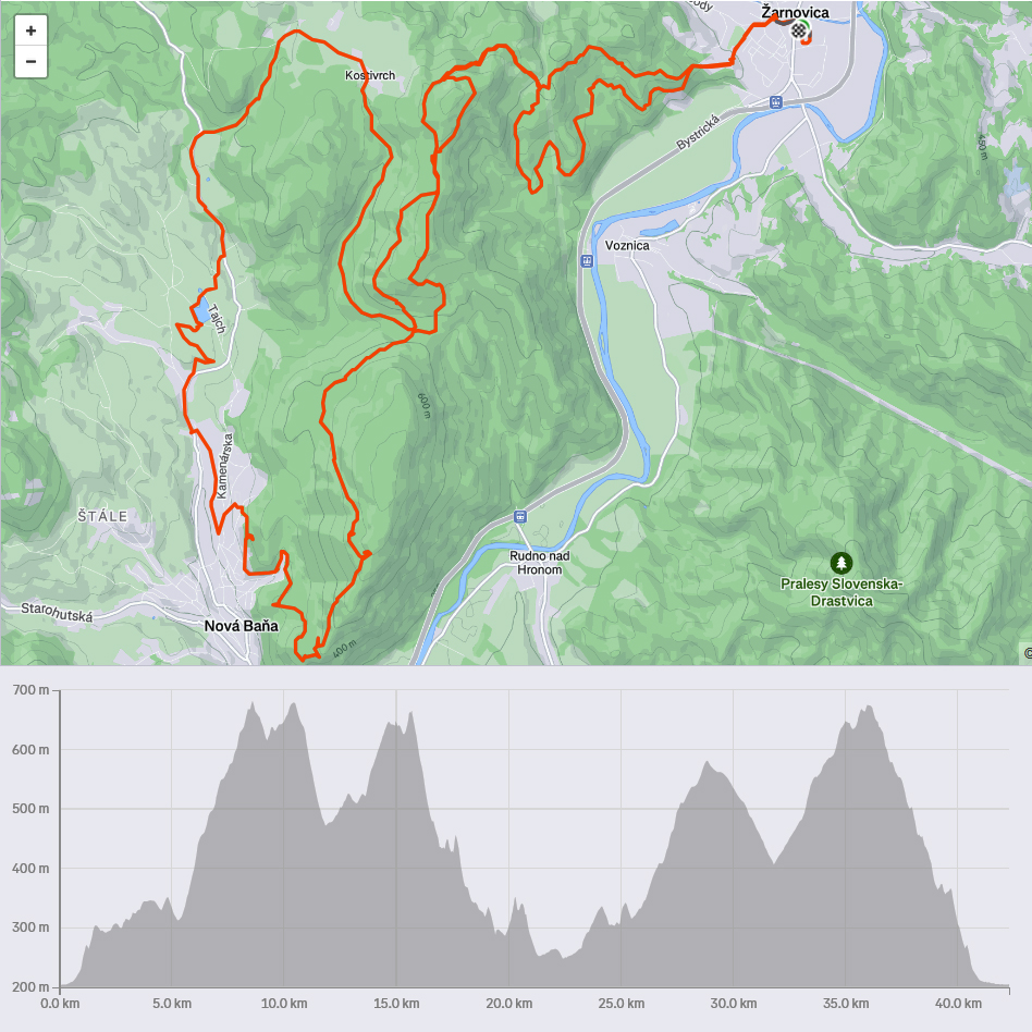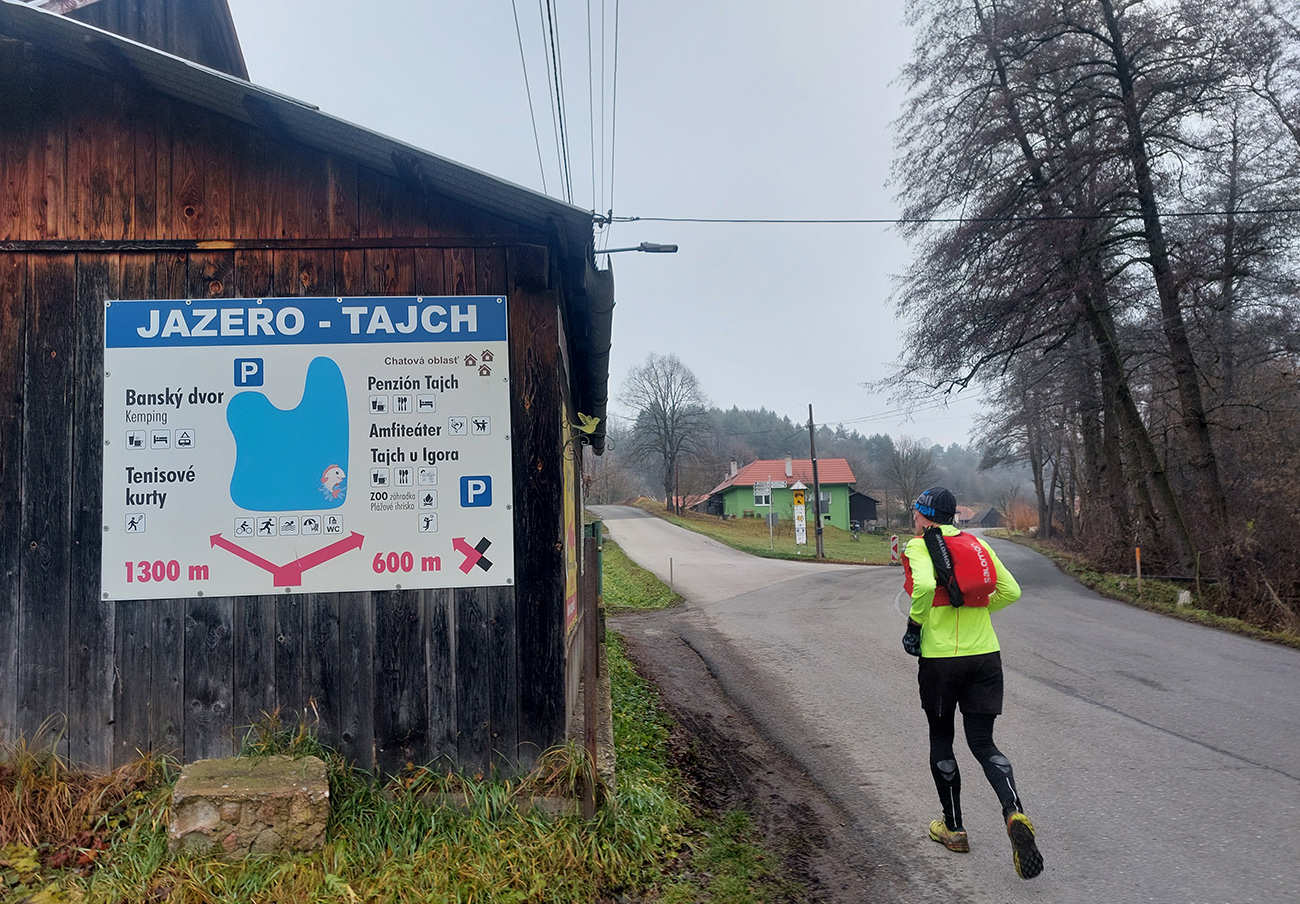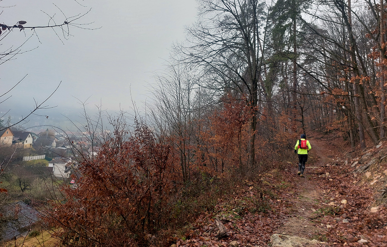Sychravá jeseň s inverziami v polke decembra? Ozaj výhra! A ešte keď aj to málo snehu sa už takmer stratilo. Tak sa išlo behať. Voľba padla na okruh po lesoch, štáloch a (prevažne) banských pamiatkach najjužnejšieho juhu pohoria Vtáčnik, so štartom a cieľom v Žarnovici a otočkou v Novej Bani. Len dva kusy sme sa do auta nazbierali, ale exkluzívne parkovanie pri žarnovickej plochej dráhe vybavené. Začiatok a koniec po poriadne hrboľatej modrej, aj s niekoľkými obchádzkami, aby sme nešli tam aj nazad to isté. Potom poznávací výlet po novobanských náučných chodníkoch cez Háj, Havraniu skalu, Gúpňu a Zvoničku až k Tajchu. Od neho zachádzkou po cyklotrasách okolo Pastierskej (657 m) a cez štál Kostivrch nazad na tú modrú pod chatou Šarvíz. Nejakých 40+ kilákov a 1800 výškových. Takto: