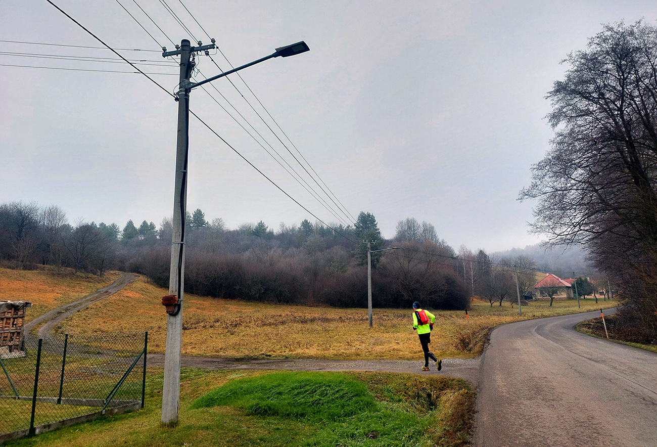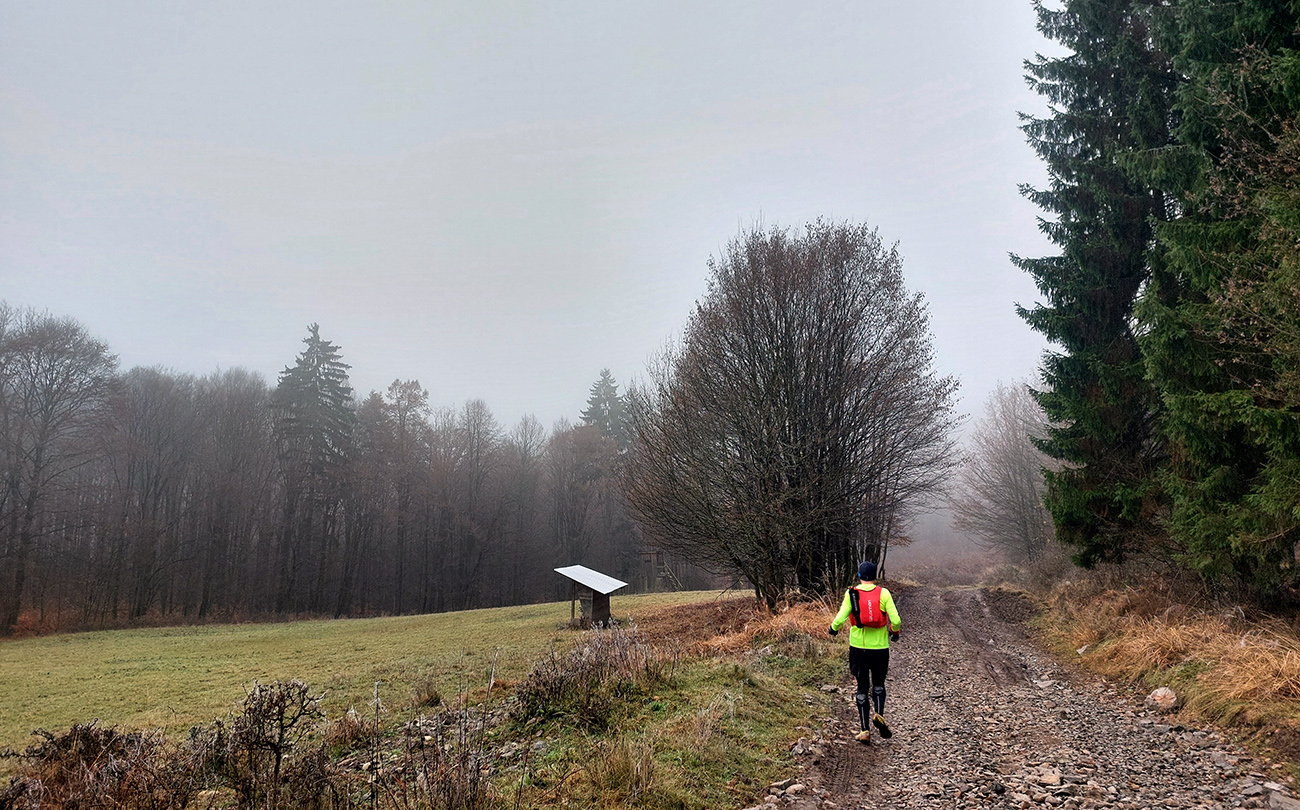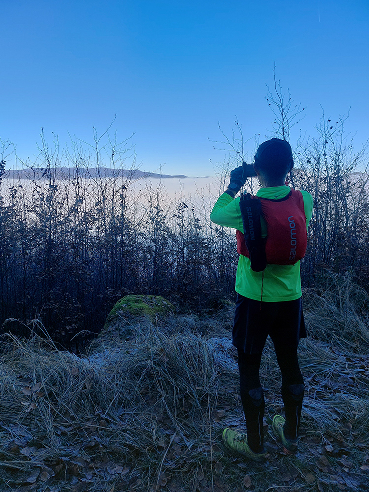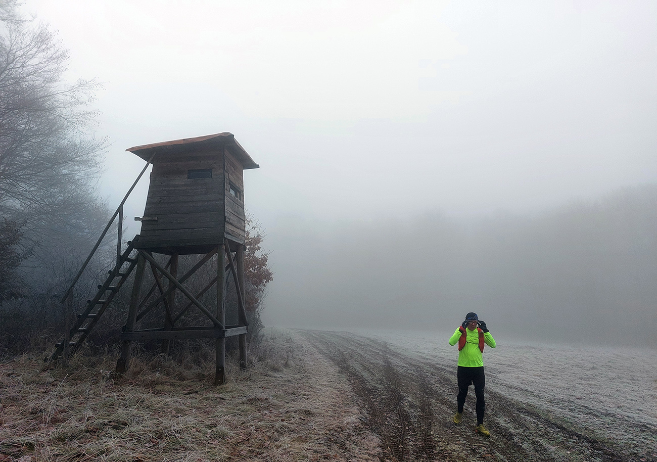 Takže na úvod blatnatá zvážnica ponorená do mlieka, a keď nie blato, tak lístím prikryté voľné kamene, no jeden úžas, ako nám miestami členky vykrúcalo. Len vo väčšej výške, kde to bolo za jasnej noci nad hmlou, sa vyskytol mierne chrumkavý podklad. Tam ale zato čistomodrá obloha, na šľaktrafenie: