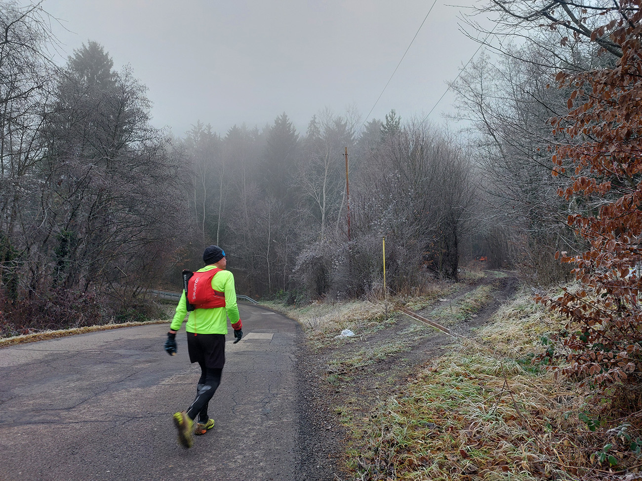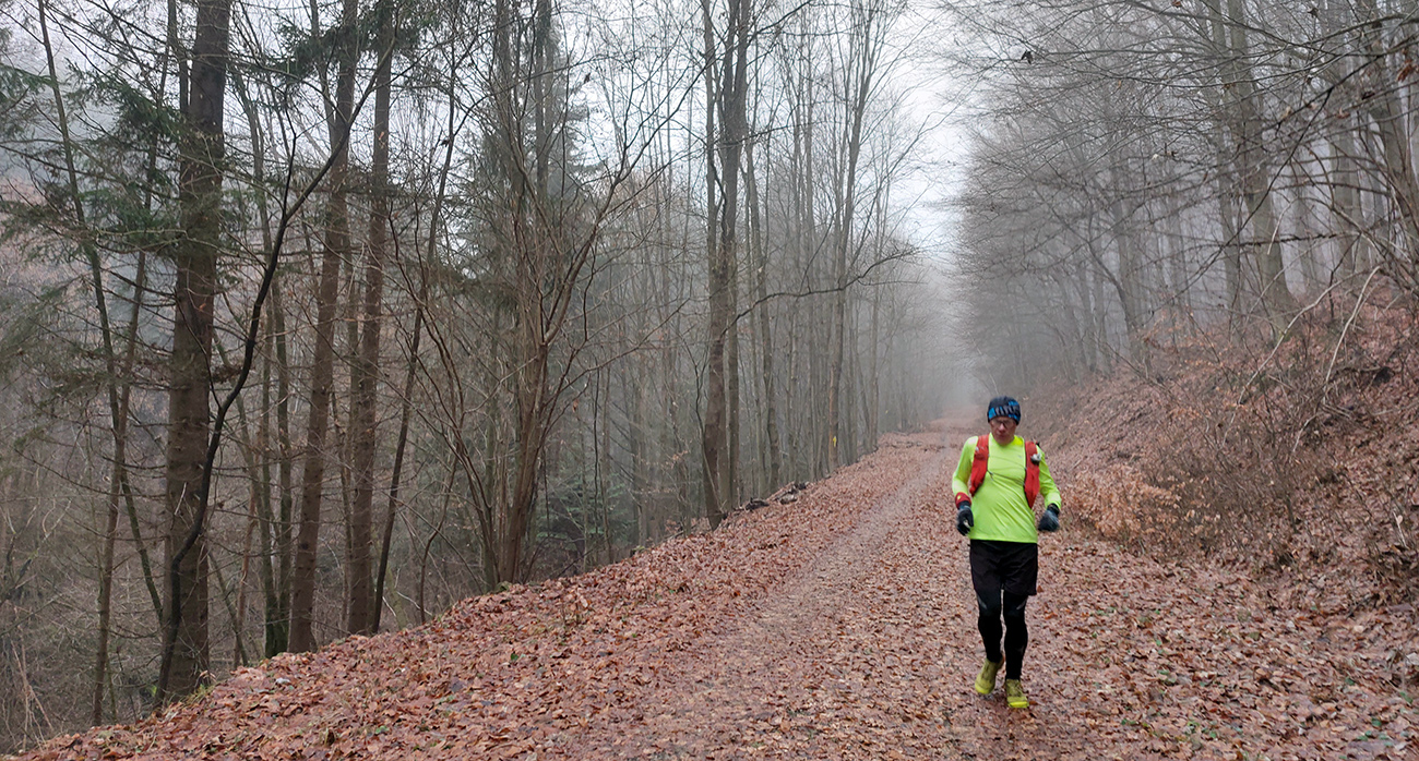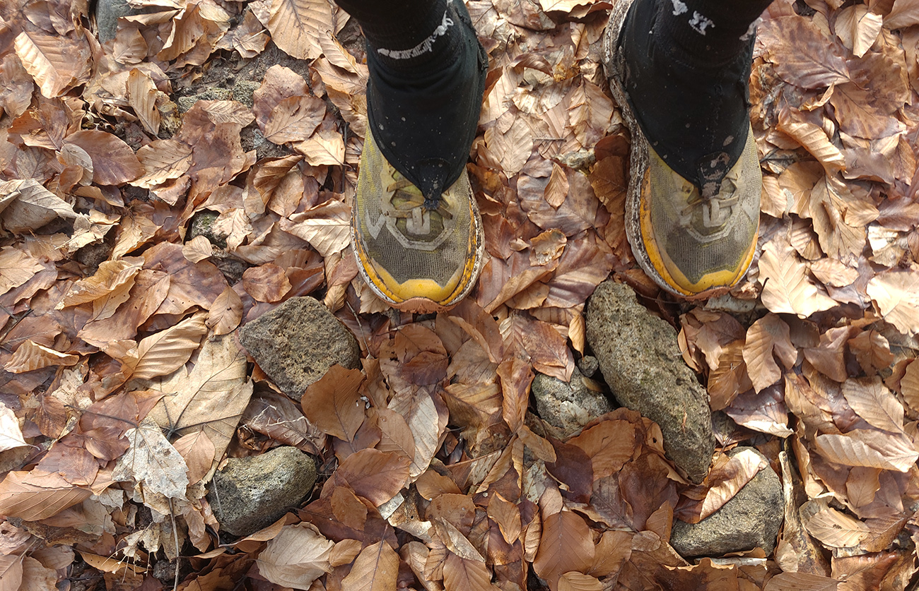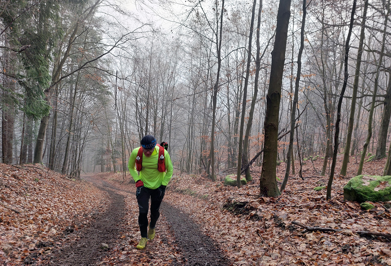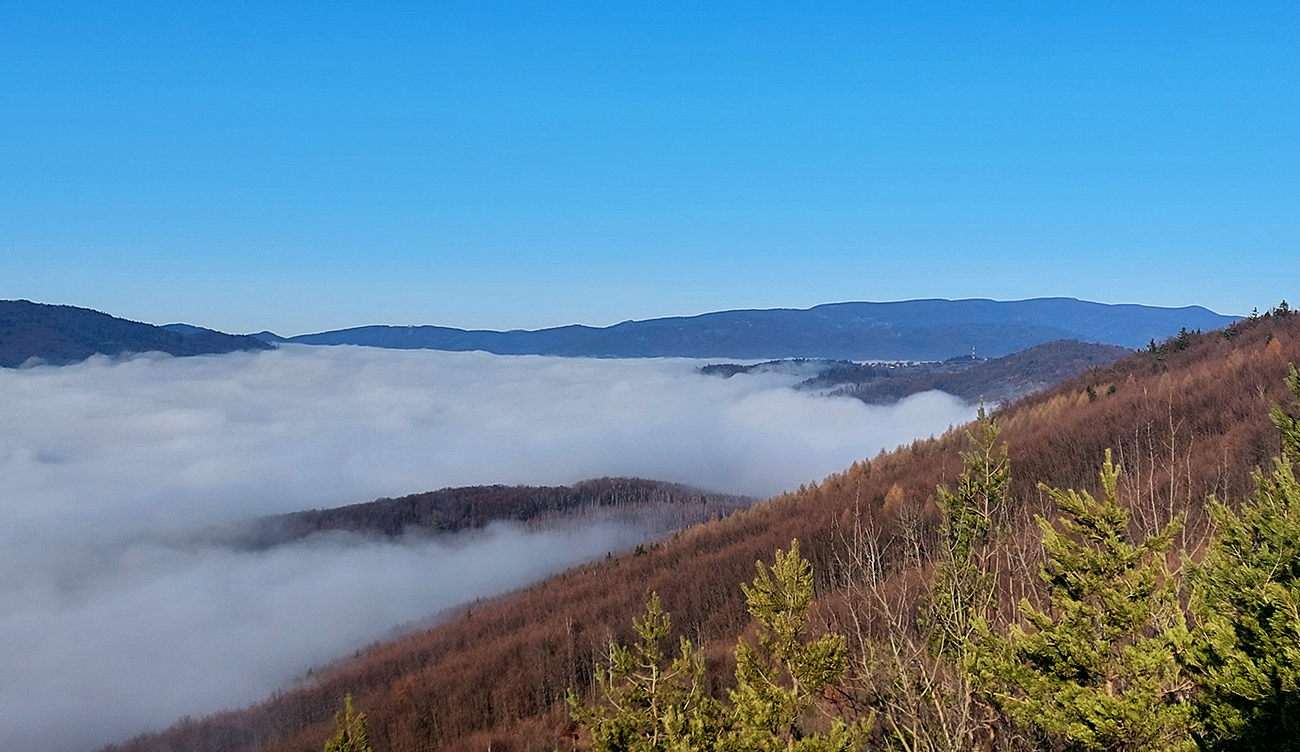 Takže na úvod blatnatá zvážnica ponorená do mlieka, a keď nie blato, tak lístím prikryté voľné kamene, no jeden úžas, ako nám miestami členky vykrúcalo. Len vo väčšej výške, kde to bolo za jasnej noci nad hmlou, sa vyskytol mierne chrumkavý podklad. Tam ale zato čistomodrá obloha, na šľaktrafenie:
