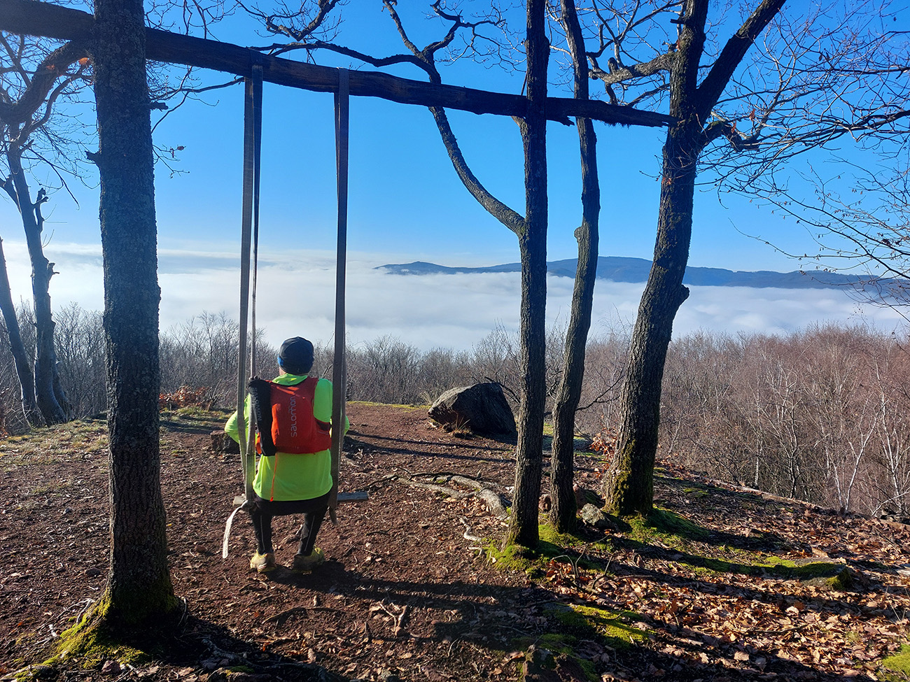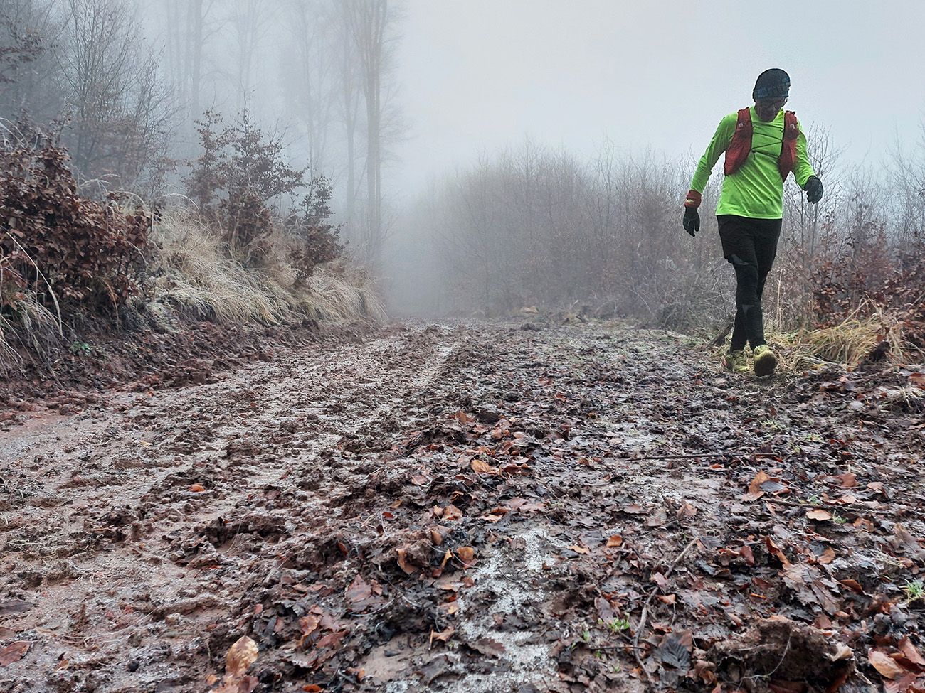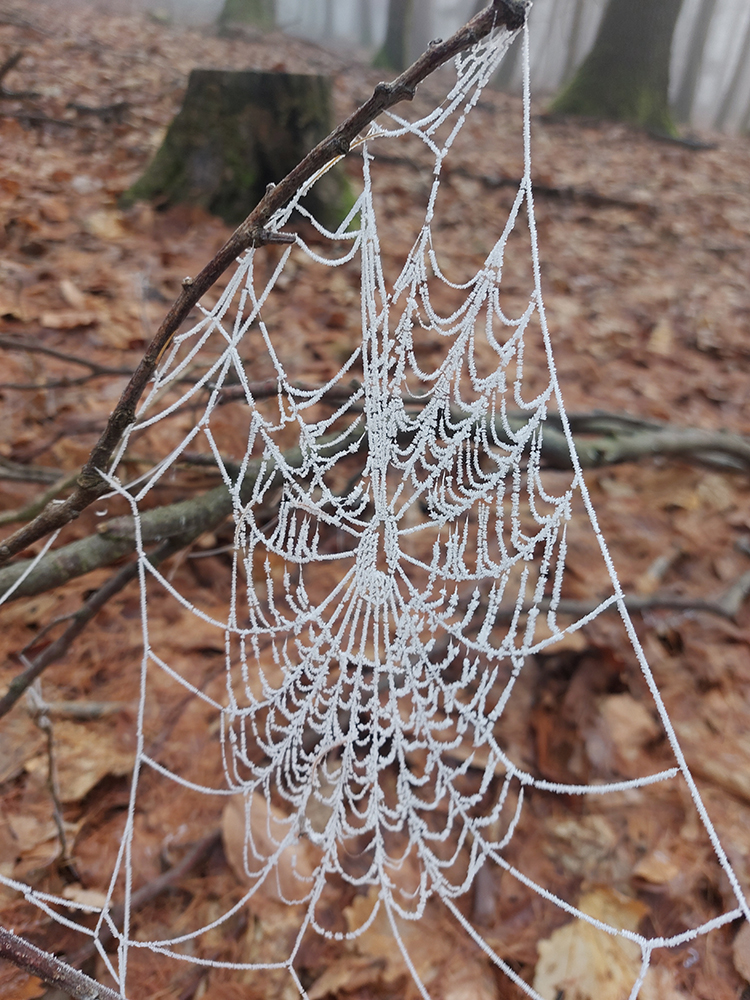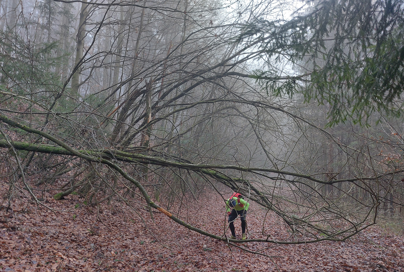 Takže na úvod blatnatá zvážnica ponorená do mlieka, a keď nie blato, tak lístím prikryté voľné kamene, no jeden úžas, ako nám miestami členky vykrúcalo. Len vo väčšej výške, kde to bolo za jasnej noci nad hmlou, sa vyskytol mierne chrumkavý podklad. Tam ale zato čistomodrá obloha, na šľaktrafenie: