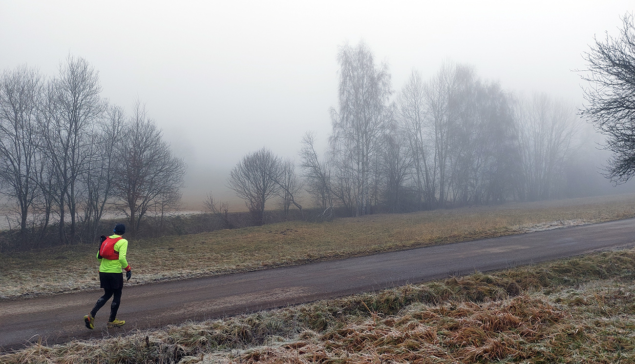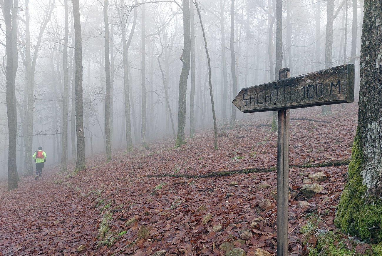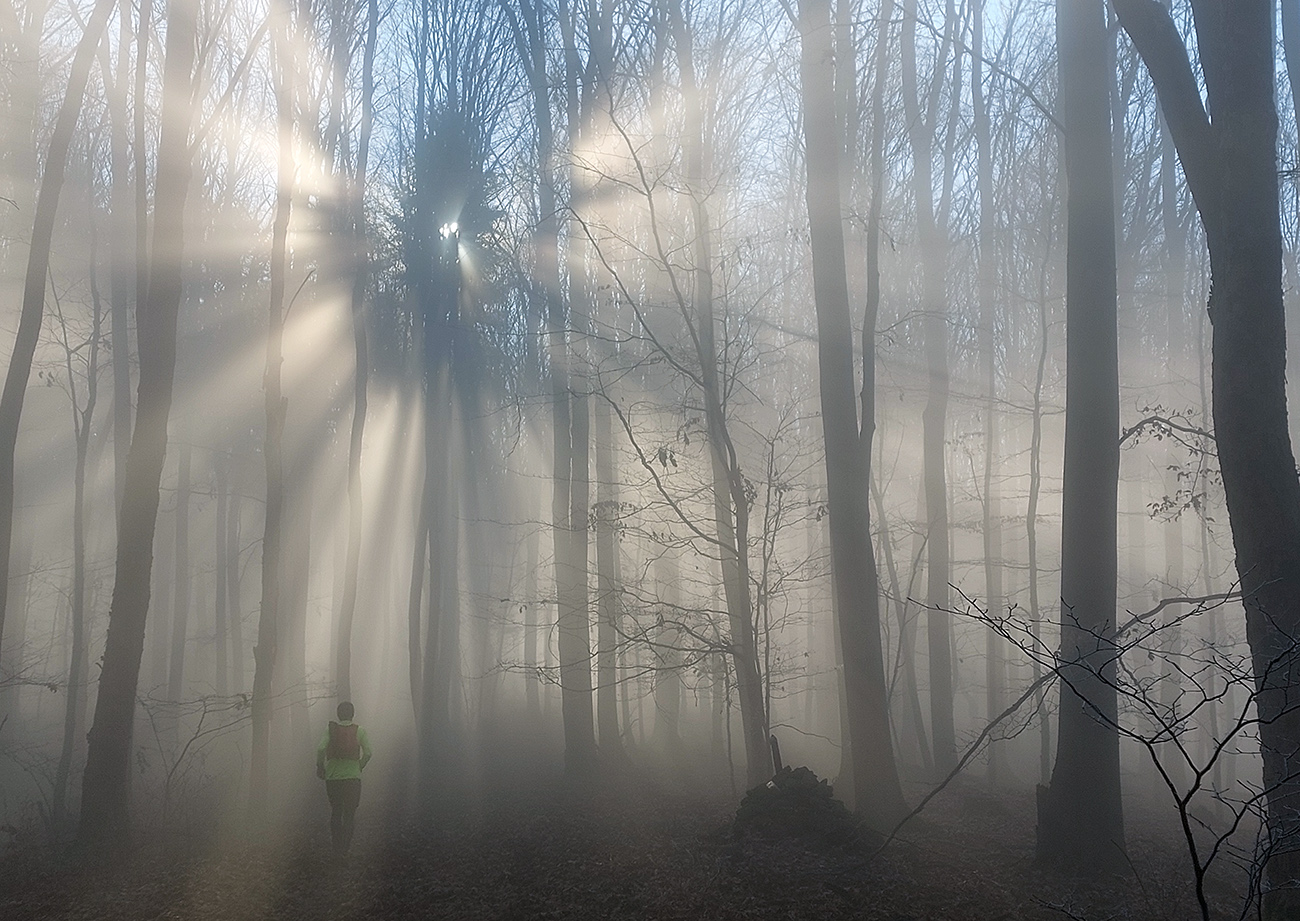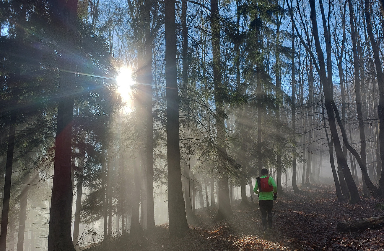Horná hranica hmly sa vlnila niekde medzi 500 - 600 metrami, tak medzi Johanom a Hájom sme sa predierali stroboskopickými disco-efektami, lebo navyše slnko sme mali priamo pred sebou. Nebehalo sa po tých hrboľatých cestičkách jednoducho, ale svetelné efekty stáli za to: