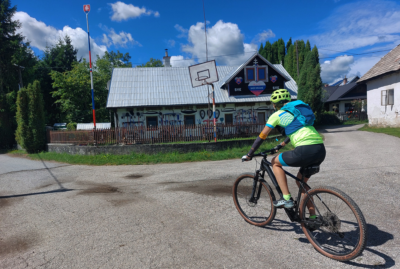 Z Valčianskej sme jednoducho cez nízky, lúčnatý horizont predriftovali do Slovianskej. Popri valčianskej obecnej „párty zóne“ a cez Sloviansky potok. Tam sa netreba zľaknúť – kto nechce brodiť, kúsok vyššie je most, len ho moc v kríkoch nevidno z tej zákruty pri dome.