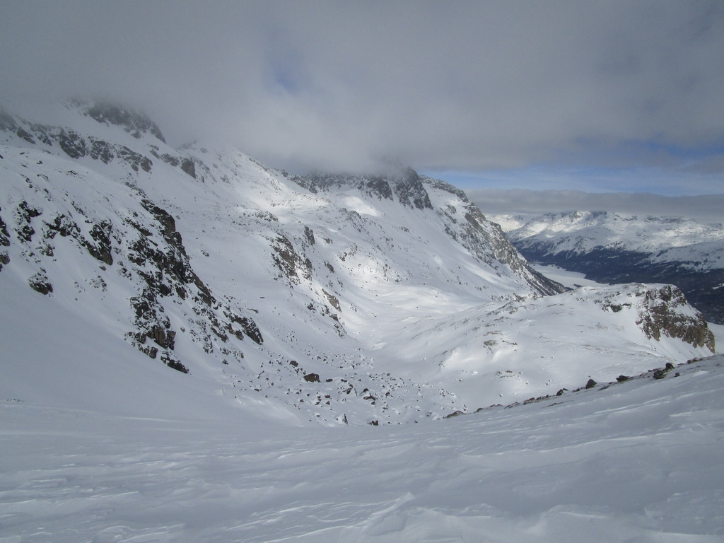 Pri návrate máme možnosť predĺžiť si túru ku sedielku smerom na Piz Lungin. Pásy nalepíme po zlyžovaní spomínaného strmého miesta a krásnou dolinkou na úpätí Grevasalvasu sa dostaneme do sedielka z ktorého je výhľad na Piz Lungin. Skialpová mapa hovorí, že by sa dalo pokračovať až na vrchol.