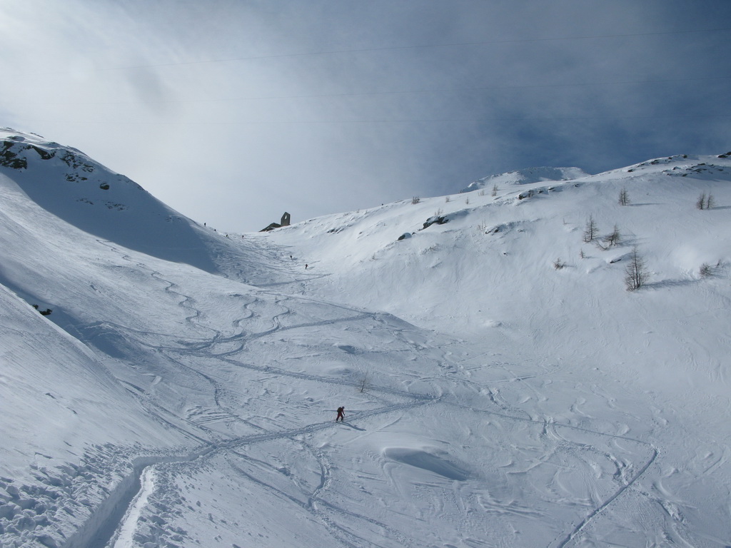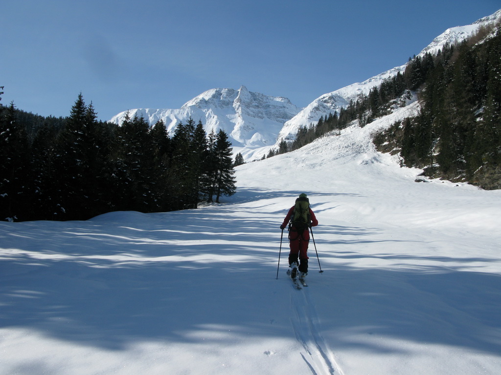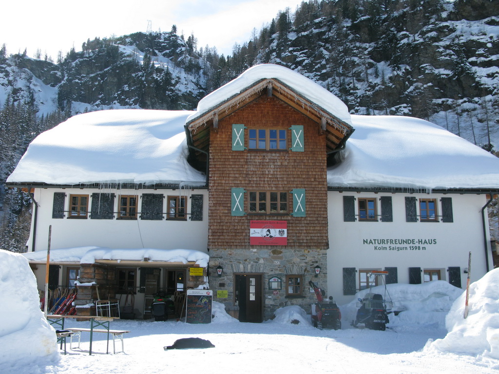Boli sme tu omrknúť terén už minulý rok, vtedy bolo ale málo snehu, tak sme využili možnosť a nechali sme sa vyviezť na chatu Kolm Saigurn vo výške 1586m. Dnes prechádzame s lyžami v ruke ráno po ôsmej okolo rampy. Na chatára a jeho terénne auto tu čaká už početná skupinka skialpinistov. Je krásny deň a je sobota. Tí, ktorí to nestihli včera na chatu, sa na ňu nechávajú vyviezť ráno a od nej vyrážajú na vrchol.