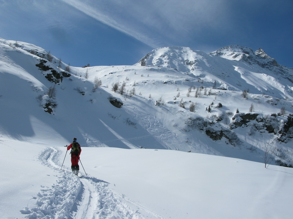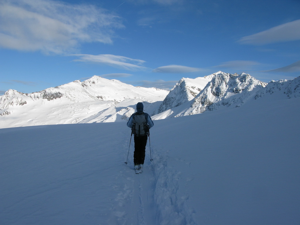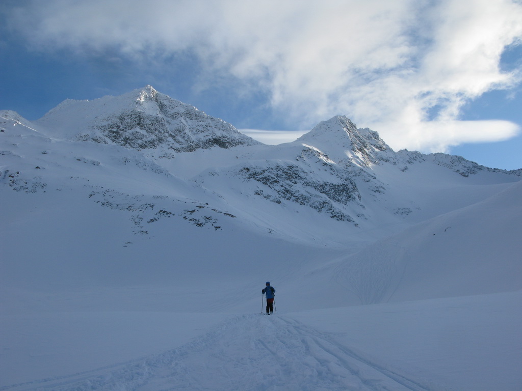 Zastavujeme na vyvýšenine v strede doliny. Všade naokolo je na čo pozerať. Spoza hrebeňa vykukuje trojtisícovka Schareck aj so svojim lyžiarskym strediskom. Prístup k nemu je z juhu. Na vrchol by sa však dalo vystúpiť po prekonaní hrebeňa aj odtiaľto - a máme ďalší projekt do budúcnosti :)