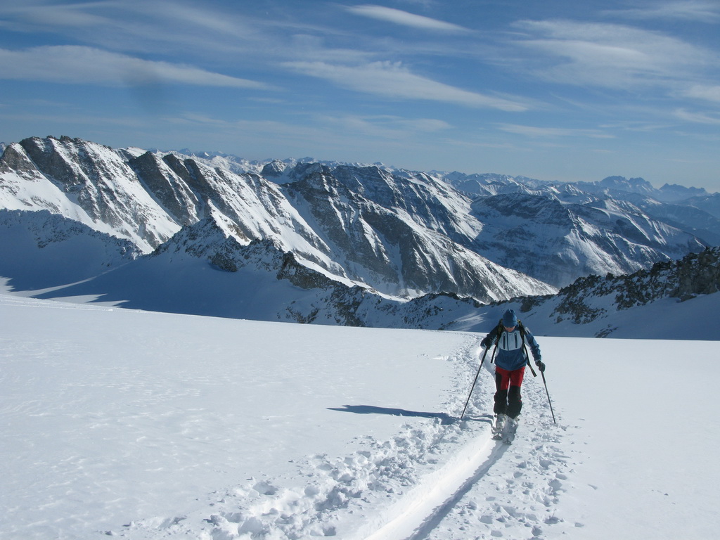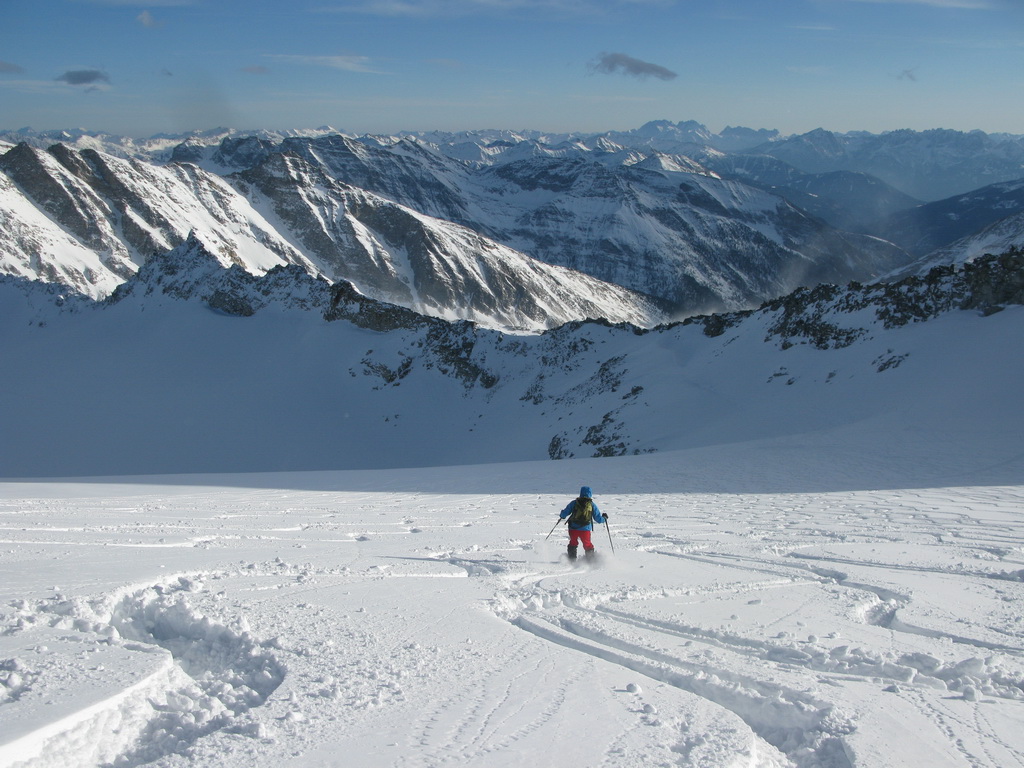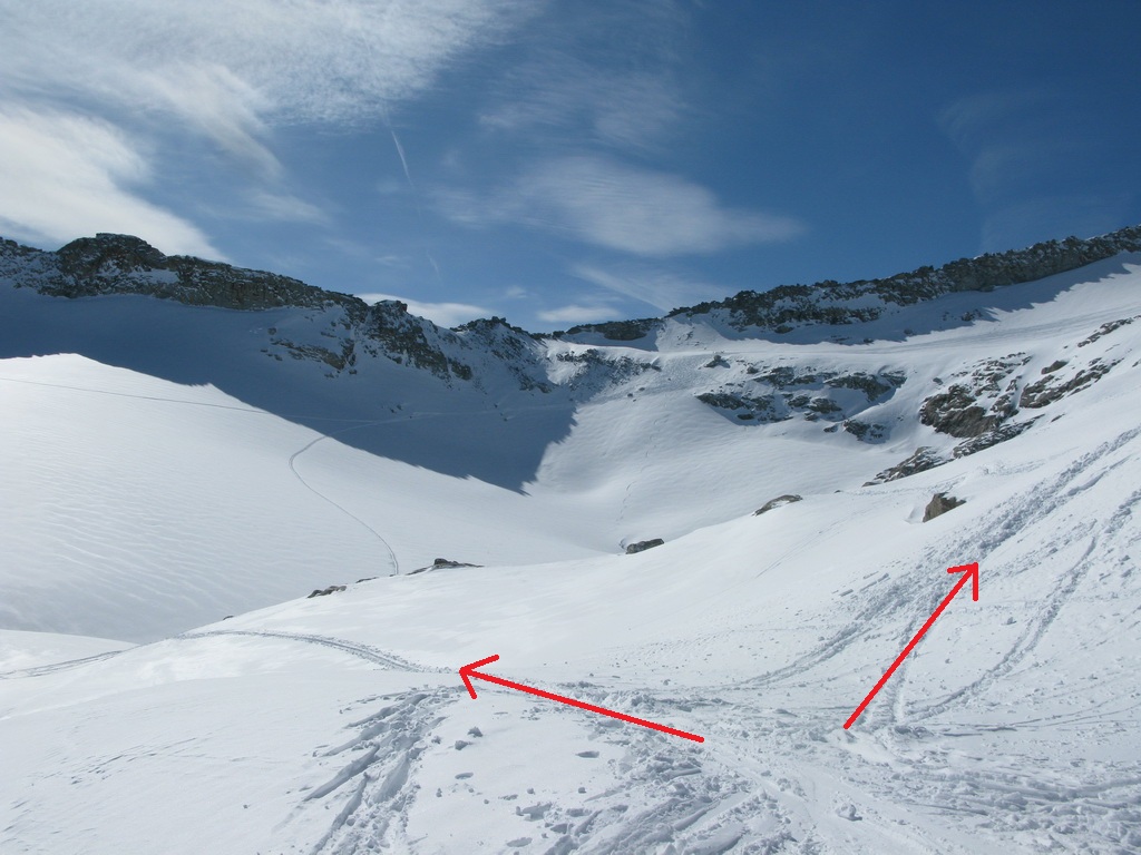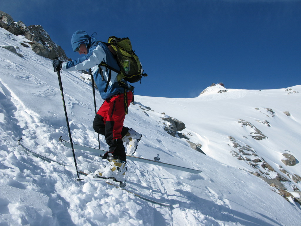 Počas celého nášho výstupu sme stretávali skialpinistov, lyžujúcich dole. Tesne pod vrcholom stretávame ešte jednu skupinku, púšťajúcu sa práve do zjazdu.