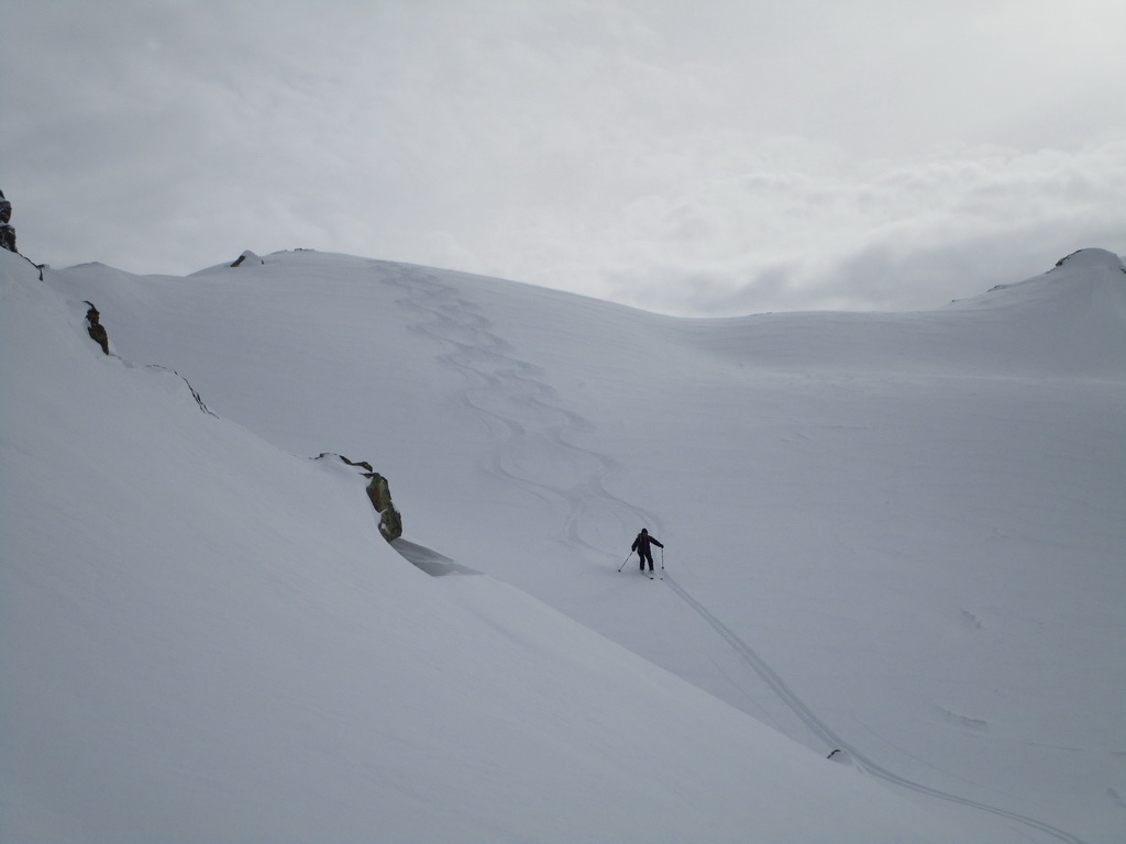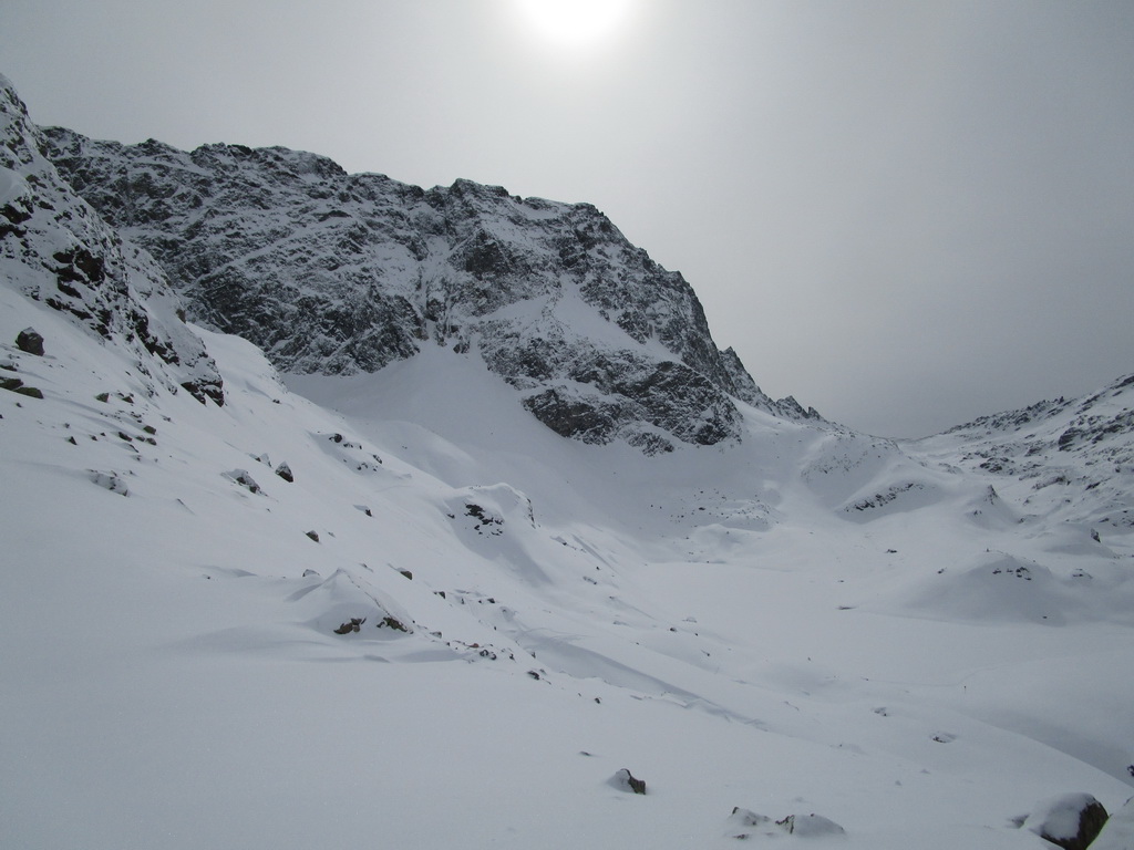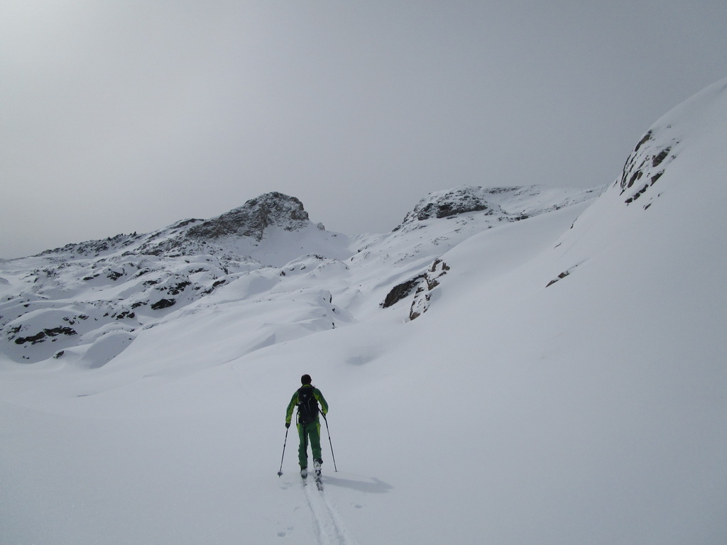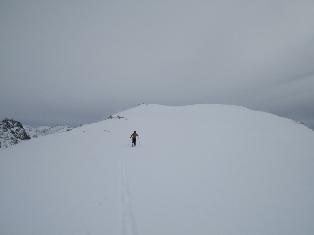 Od jazera hore členitým terénom. Podklad je tu vápencový. Pripomína Dolomity. Prešlapávame stopu a snažíme sa viesť ju čo najmiernejším terénom. Žlabom vystupujeme na vrcholový hrebeň. Chvíľu ideme aj napešo s lyžami na chrbte. Na hrebeni už postupujeme bez problémov až na vrchol. Je treba dávať akurát pozor na preveje a neísť moc vpravo. Vrcholové plato je rozľahlé a človek ani nemá pociť, že ho ohraničujú strmé steny.