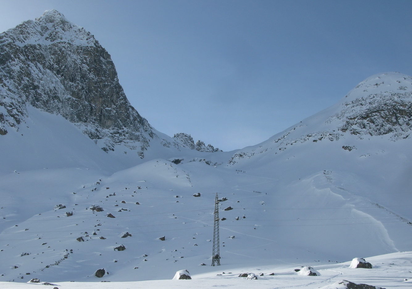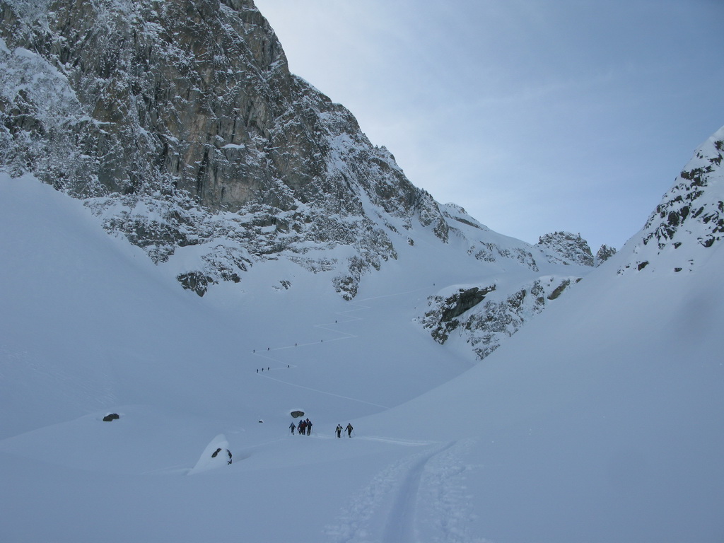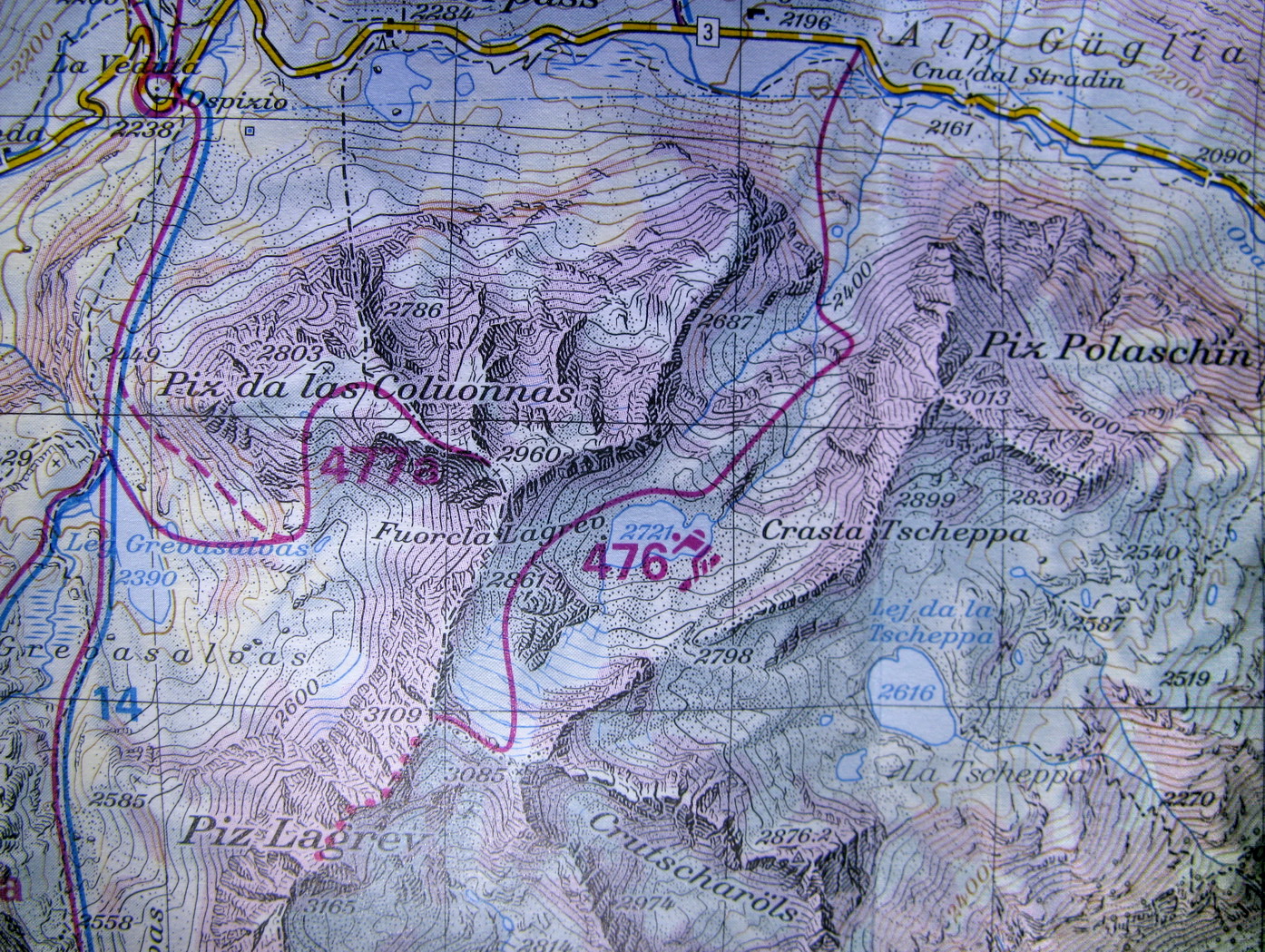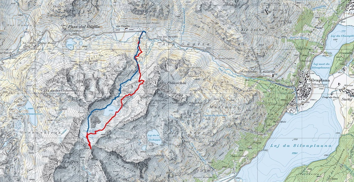 Hneď od parkoviska na mieste zvanom Alp Guglia sa začína terén dvíhať a stopa vedie popri veľkých balvanoch svahom hore. Nasleduje traverz vľavo, až prídete na úpätie Piz Polaschin a tu sa serpentínami stopa tlačí doprava hore. Pokračuje sa miernym chrbtom hore, až sa ocitnete v prostriedku kotlovitej doliny. Niečo tu chýba... Áno, z ľadovca už veľa neostalo, ale aj tak ten zvyšok tvorí prírodne chladenú zjazdovku, po ktorej sa dostanete až do sedla k malej meteorologickej stanici. Tu pre mnohých túra končí. Za dobrých podmienok sa dá pod sedielkom ísť viac vpravo na hrebeň a po ňom na vrchol. Aj podľa sprievodcu tu lyžiarska túra zvykne končiť. Po hrebeni sa však dá pokračovať ďalej. Pozor ale, všade sú nebezpečné preveje. Západná stena je vysoká a kolmá!