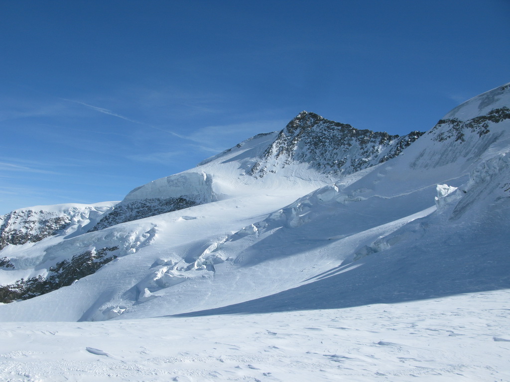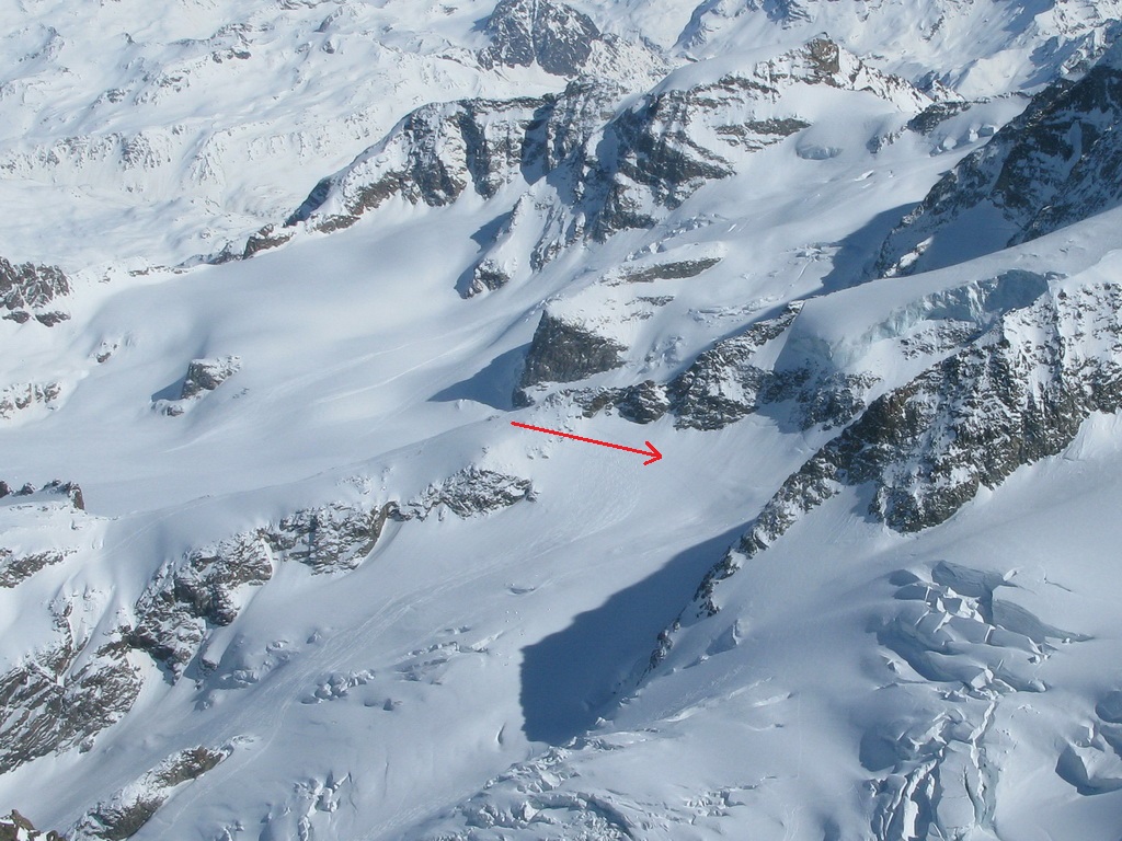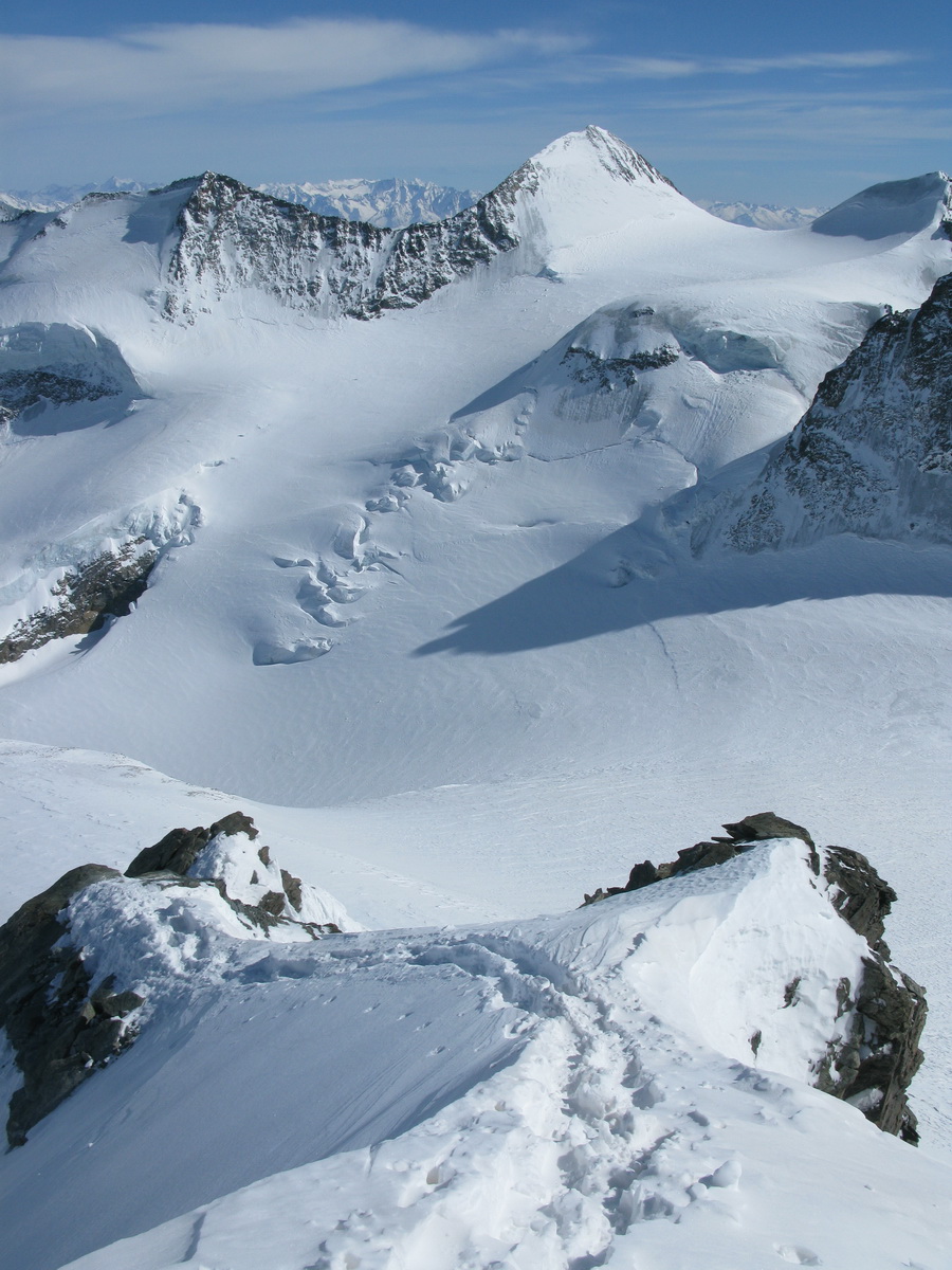 Pokračujem ďalej po hrebeni, až po skalný hrebeň. V lete sa postupuje ním, obtiažnosť cca 2+. Stopy pod skalami však odbočujú doprava - strmým traverzom a zjazdom na pásoch sa dostávam pod ľadovcový kuloár. Ten je vďaka množstvu snehu v strede zjazdný a dá sa ním dokonca vyjsť aj hore na pásoch. Počas tohto výšľapu prechádzam po niekoľkých zasnežených trhlinách. V závere stopa traverzuje vľavo, obíde trhliny a zatočí doprava na traverz Bellavisty. Sneh je vyfúkaný od silného vetra do známych vlniek. Je tvrdo a stopa sa začína strácať.