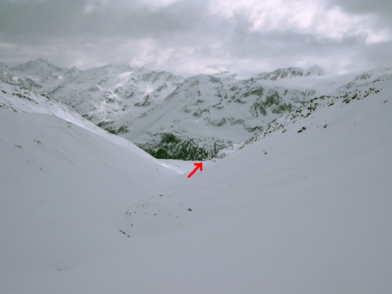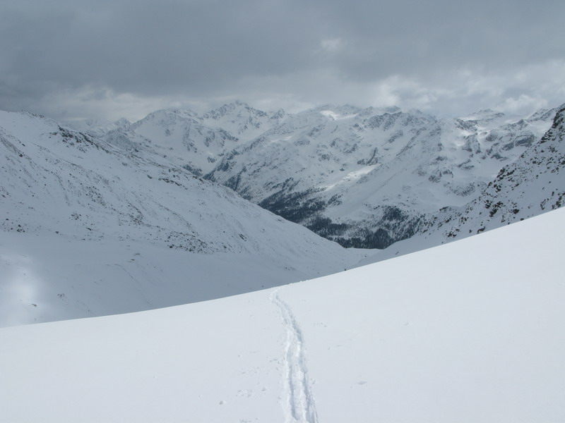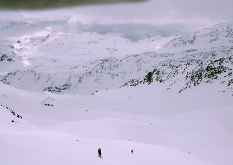 Madritschjoch (3123m.) je bránou do rovnomennej doliny. Tu už lanovky nie sú - ideálne miesto na skialp. Lyžujem pomaly dole, viditeľnosť je na ****. Do diaľky vidím, ale nevidím dva metre pred seba. Všetko splýva dokopy. Narazím do preveja - nevidel som ho, ale nejak som to ustál. Stáva sa mi dokonca, že si myslím, že už stojím, ale lyže idú ďalej...