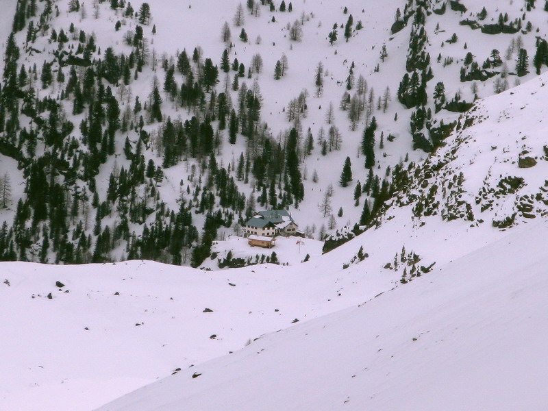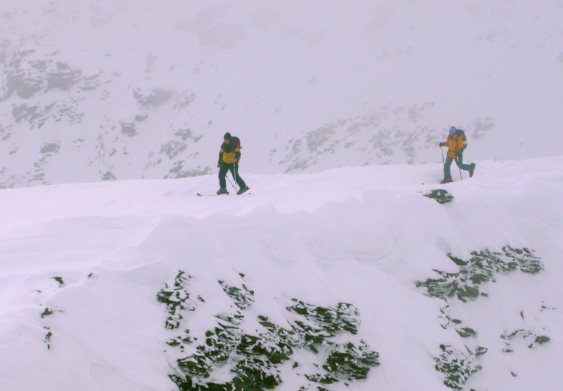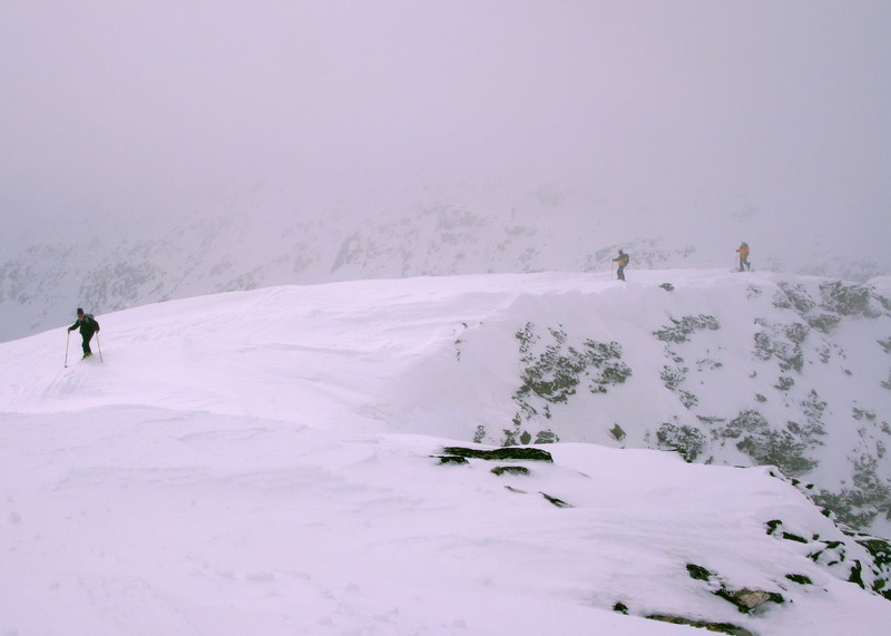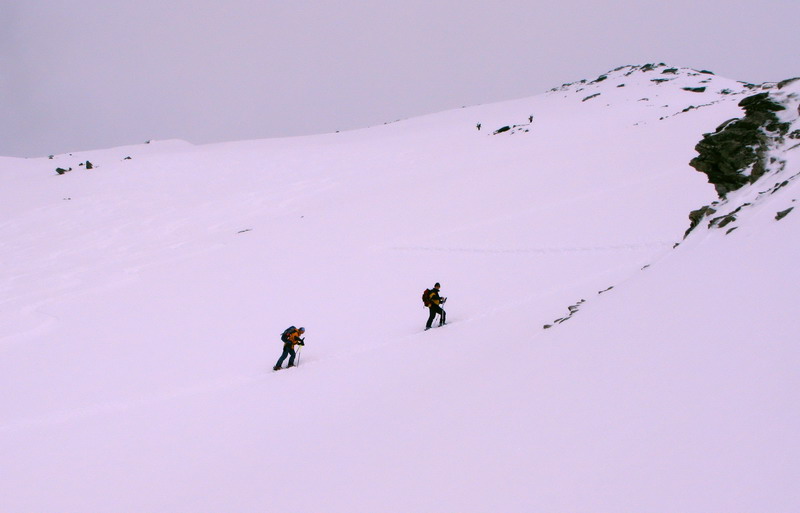 Pomaly naberám výšku a slnko presvitá stále viac. Tesne pod hrebeňom začujem hlasy, pozriem hore a uvidím oproti lyžovať skupinku ľudí. Prešli okolo, ani nepozdravili. Mali veľké batohy a na sebe ešte aj sedačky. Prichádzam do sedla a obzerám sa, odkiaľ prišli. Stopa ide z dola, neboli teda ani na vrchole.