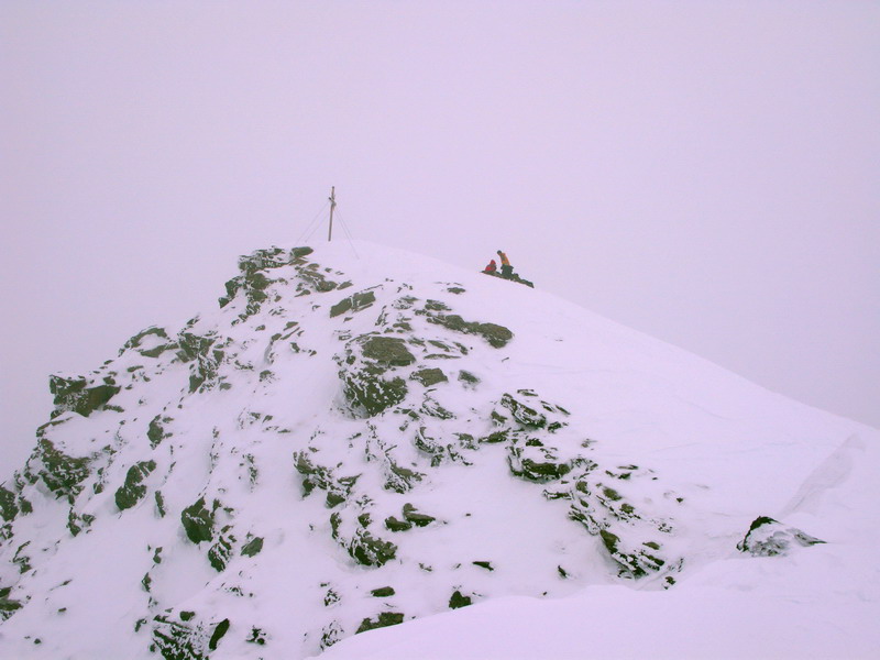 Uvidím ďalších ľudí, mieriacich si to na vrchol. Vyrazili z Zufallhute a na vrchol šlapú dolinou Butzental. Madritschspitze bude zrejme hlavný cieľ, pre ľudí z tej chaty. A tak sa tu chodí aj v horšom počasí. Potešil som sa stope a za chvíľu som hore. Bohužiaľ viditeľnosť sa znovu zhoršila. Vrchol je práve na rozhraní prevaľujúcich sa mrakov. Musím byť spokojný, som na mojej 26 trojtisícovke, prvej novej túto zimu.