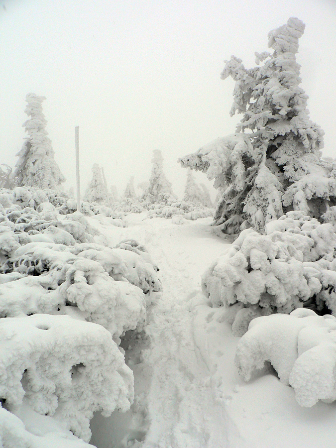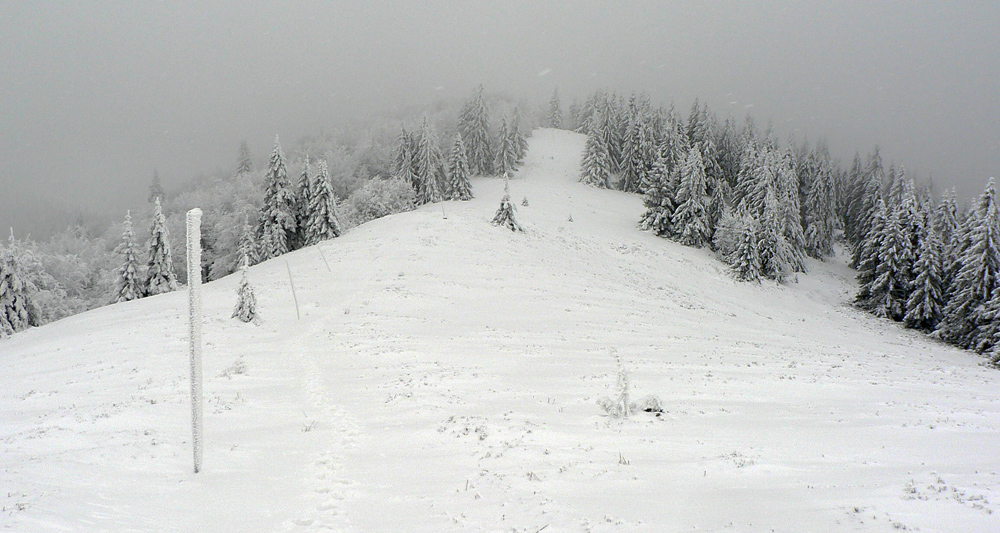 Na hrebeni mlieko a severák, idem obzrieť aspoň na juh kúsok. Smerom na Vidlicu štrikovačka pomedzi kosodrevinu – na druhú stranu smerom na Minčol by som nechcel ísť, tam sa treba asi plaziť, keď tu je takto: