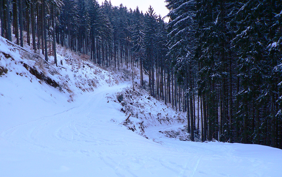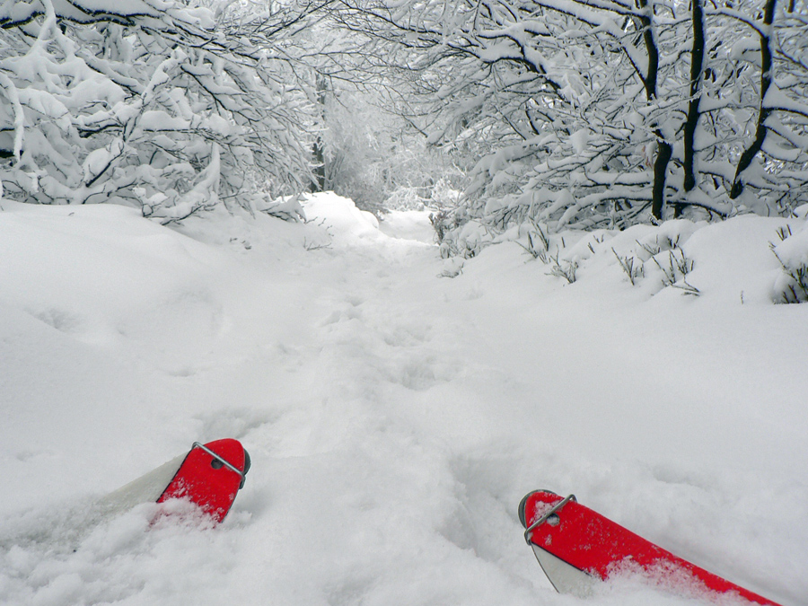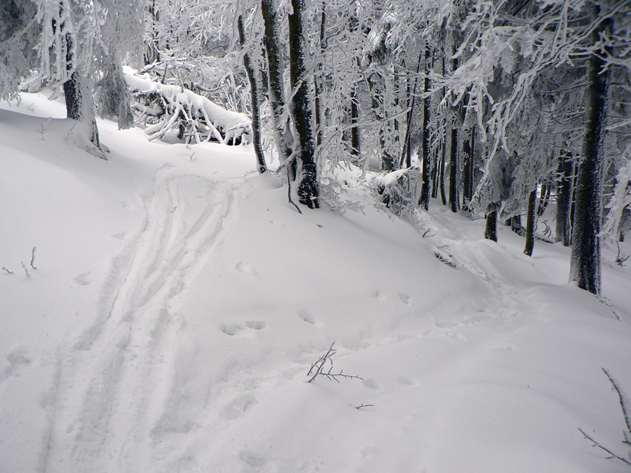 Po vlastných stopách, ktoré nad lesom už aj zavialo, blúdim od tyče k tyči a pri vysielačoch pásy dole. Dobrá lyžovačka až na asfaltku, po jej krajnici komfortná, nepoštrkovaná, nerozrytá stopa až k serpentínam a až po delo v pohode, bez obavy o sklznice:
