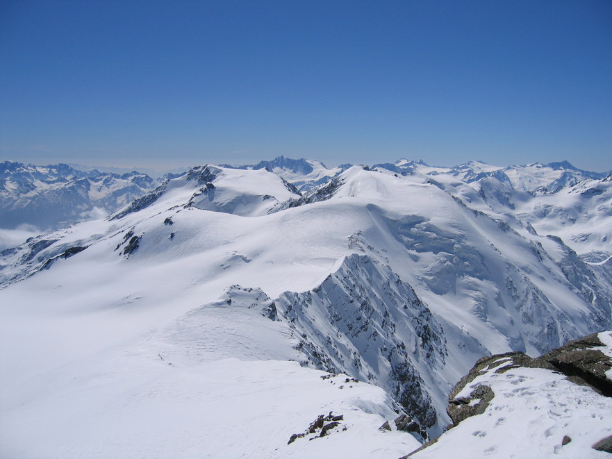 Tam som sa poobzeral, čo ďalej. Videl som ako vystupujú ľudia na Konigspitze, ale ako mi pohľad padol na Cevedale, tak bolo rozhodnuté. Netúžil som hneď na prvý krát po nejakých extrémoch. Cevedale (3769m) - ďalšia klasika mi ponúkla krásnu pohodovú túru po veľkom ľadovcovom plate. A tie nekonečné výhľady... Hneď mi bolo jasné, že tu je čo riešiť a že tu nie som posledný raz.