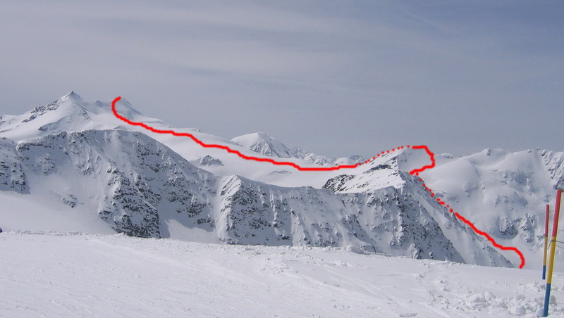 PREVÝŠENIE: Z hornej stanice lanovky (2611m.) je to na vrchol Cevedale (3769m.) cca 1200 výškových metrov. Cestu si môžete skrátiť obídením Suldenspitze zľava cez Janinger scharte (sedielko)- ušetríte asi 140v.m.