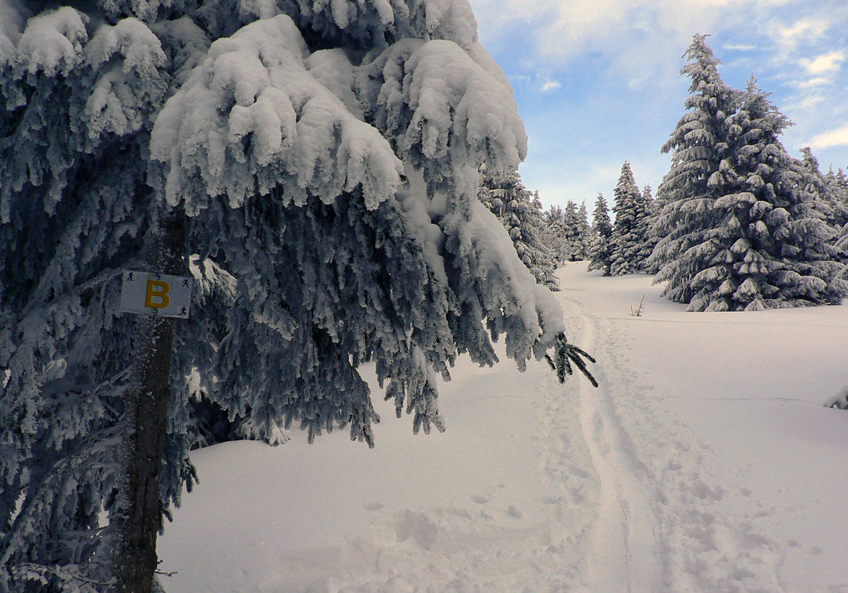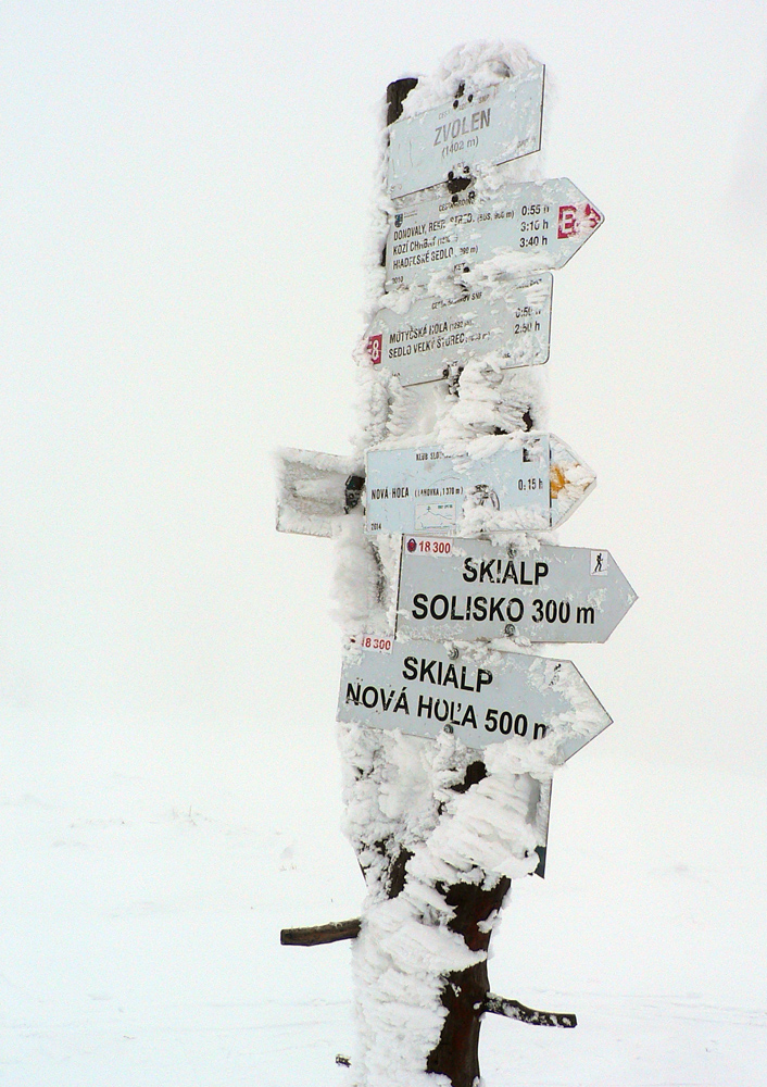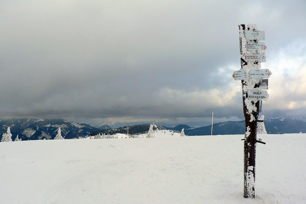 Nad vlekmi som konečne pod hrotmi palíc necítil hlinu, ale zmrznutý starý firn, v strmšom lese tesne pod Malým Zvolenom aj preveje sa vyskytli. Hore pri smerovníku už hmlisto, ale ľudsky dosť husto. Poďakoval som sa chlapom, ktorí (vraj len pre mňa) natiahli zdola čerstvú stopu (miestami aj do pol lýtok) a valil som ďalej po širokom hrebeni. Pekná tichá stopa v čerstvom, len sem tam zahrkotal ľad, kde bol sneh odfúknutý.