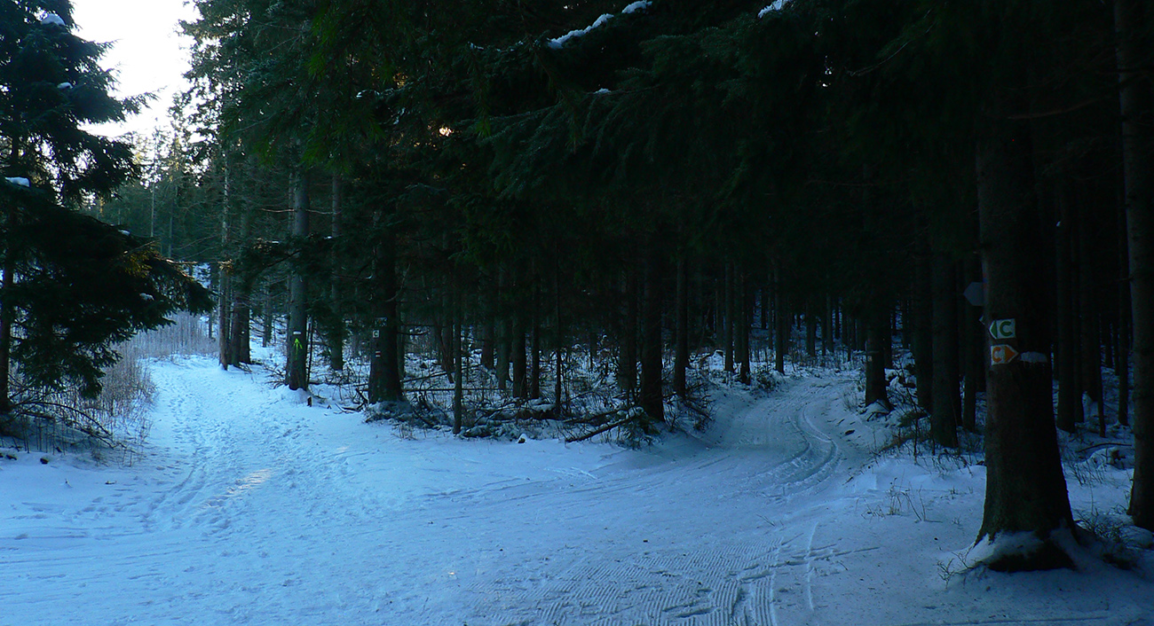 Nakoniec sa mi ale podarilo prebojovať až do Hiadeľského sedla a pošmýkal som sa po rovinke ešte asi kilometer smerom na Korytnicu (po modrej popod Prašivú). V lesoch za Poliankou na bežeckých stopách bez problému, pod Štrosmi len v strmších sklonoch trčali kamene, ale smerom do kopca sa dalo preštrikovať. Zošup po ceste k útulni pod Kečkou pohoda až na jeden, dva šutre, trčiace spod snehu. Cestou hore lesom na Kečku v závere známe kamenné schodíky, tiež štrikovateľné.