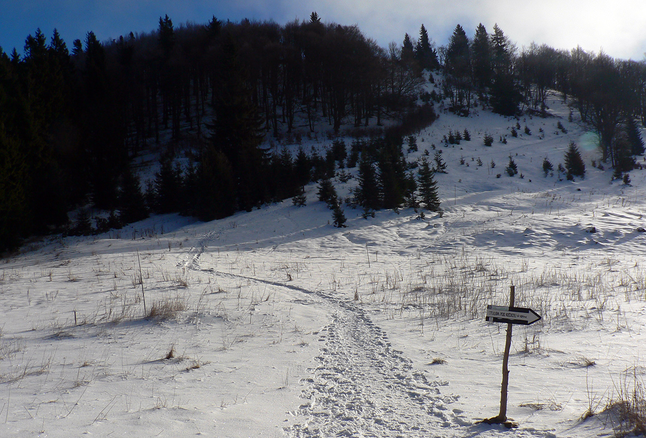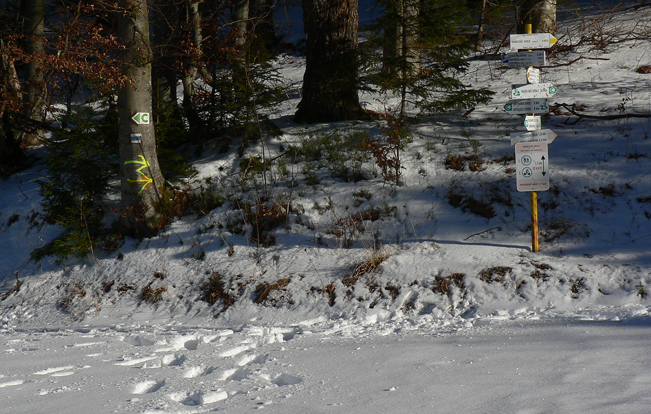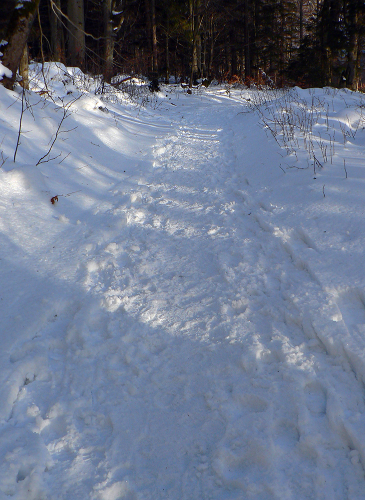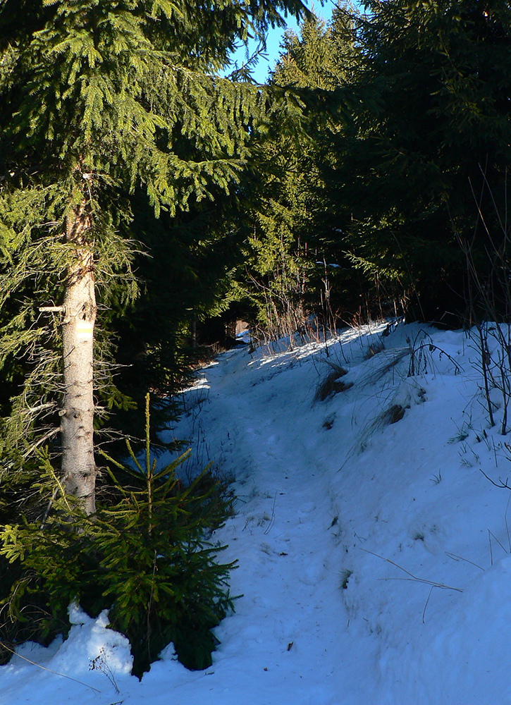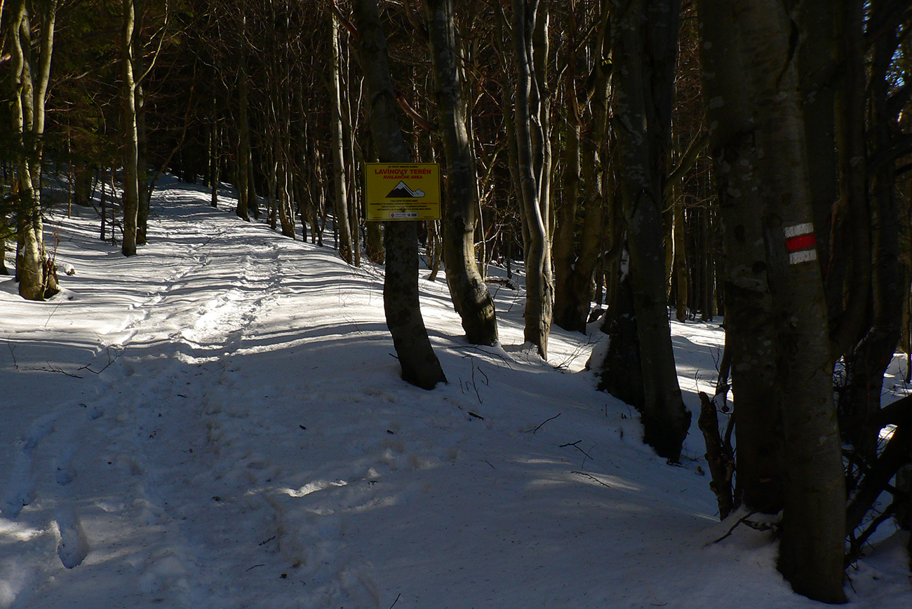 Najtragickejšie na pohľad to vyzeralo z Kečky smerom ku Koziemu chrbtu, ale žliabok s chodníkom pekne snehom vyrovnaný a udupaný, miestami aj povedľa sa dalo, tak celkom pohoda. Kozí chrbát samozrejme nula, ale jeho traverz po žltej až na výnimky dobrý – lebo na svahoch pod stromami síce snehu málo, ale vietor ten zárez chodníka snehom pekne zarovnal. Len raz som prenášal – tam kde prameň cez cestu tečie.