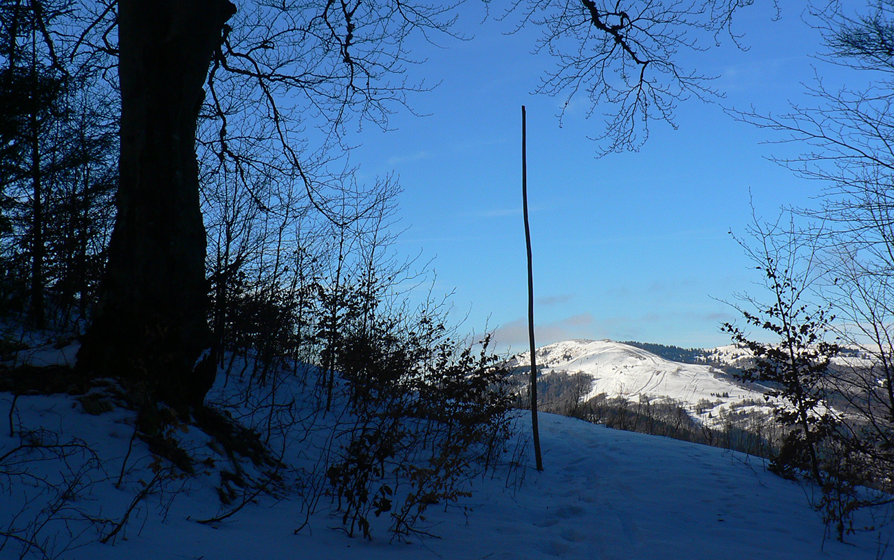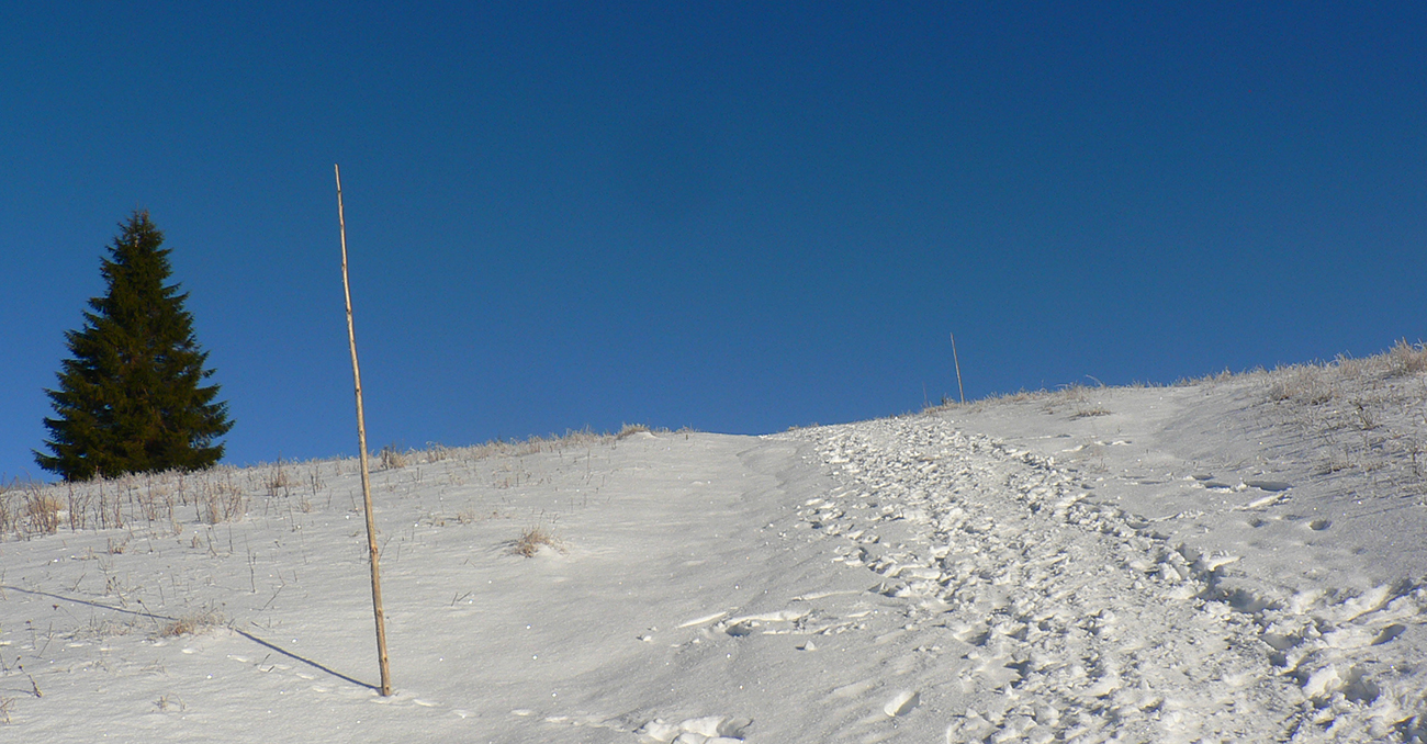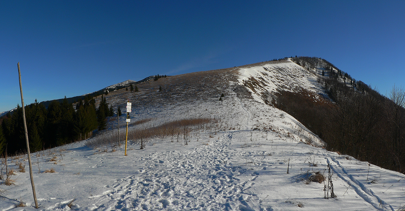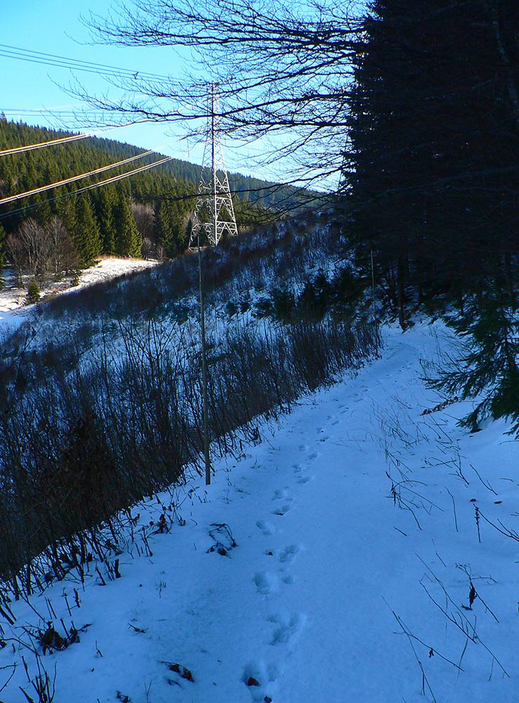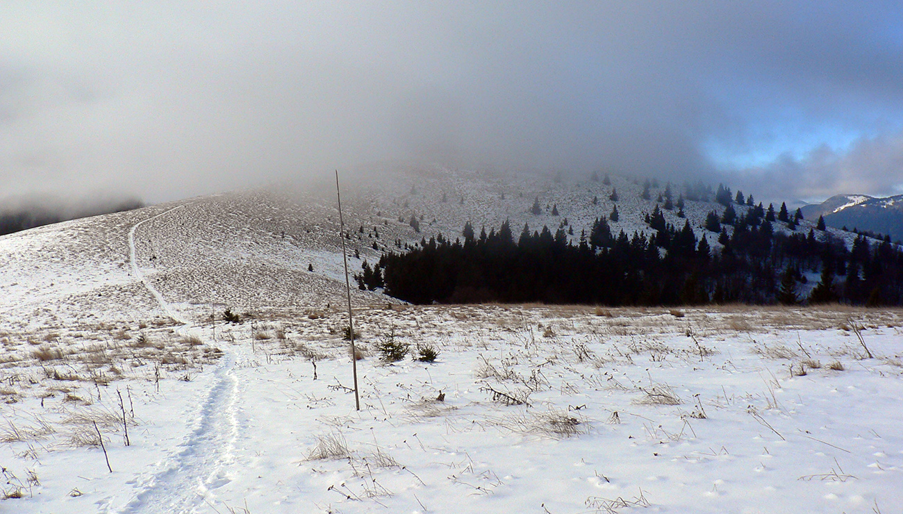 Najtragickejšie na pohľad to vyzeralo z Kečky smerom ku Koziemu chrbtu, ale žliabok s chodníkom pekne snehom vyrovnaný a udupaný, miestami aj povedľa sa dalo, tak celkom pohoda. Kozí chrbát samozrejme nula, ale jeho traverz po žltej až na výnimky dobrý – lebo na svahoch pod stromami síce snehu málo, ale vietor ten zárez chodníka snehom pekne zarovnal. Len raz som prenášal – tam kde prameň cez cestu tečie.