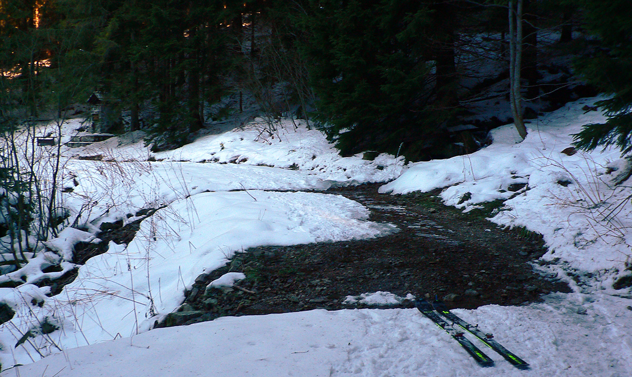 Ešte pokus po modrej smer Korytnica – po takom kilometri (kúsok za pamätníkom) ma prestalo baviť prenášať lyže cez potoky a odtopené úseky cesty, tak som to otočil. Z Hiadeľského sedla som ešte poobzeral, že pod Prašivú by sa zrejme dalo dostať, aj na Kozí chrbát, ale to ma odradila predstava spiatočnej cesty dole kopcom s lyžami na chrbte.