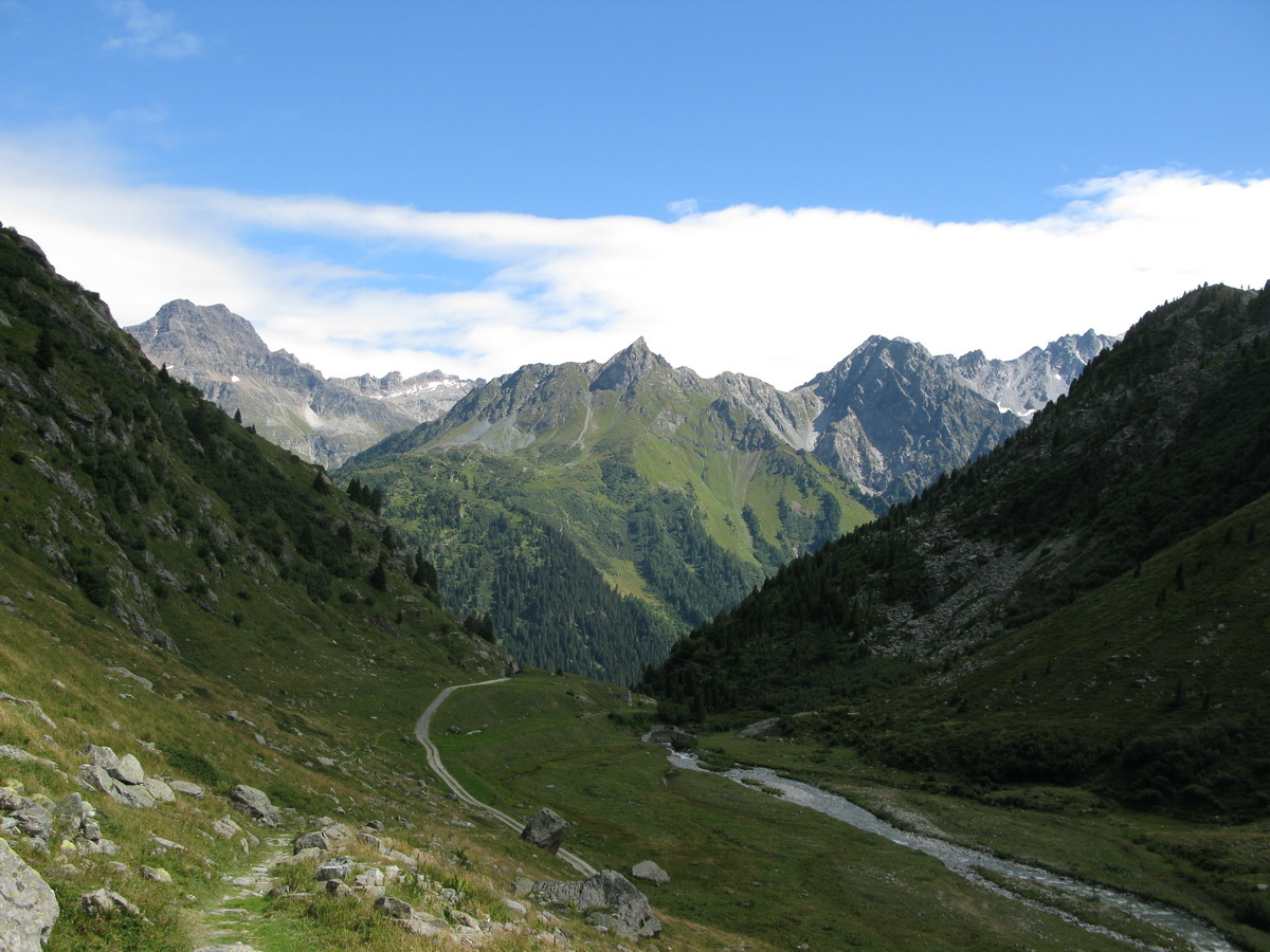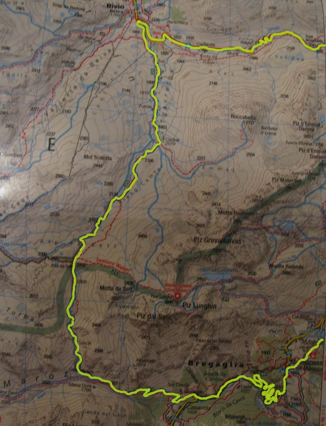 Do sedla som sa dostal pohodlne v sedle. Pofotil som pekné výhľady a šup ho dole. Už zakrátko sa cestička zmenila na pekný a miestami aj ťažký singlzjazd. Paráda!! V závere ostré serpentíny vydláždené kameňmi, to už bolo na hrane a veru som aj párkrát zosadnúť musel. Nad dedinkou Casaccia odbočka doľava na značenú cyklotrasu ušetrí výškové metre. Pri starom kostole som sa napojil na asfaltku a nasledovali serpentíny na passo Maloja (1818m). Hore som vyšiel v celkom zachovalom stave, a tak som si ešte vyrazil oťuknúť začiatok doliny Val Forno.