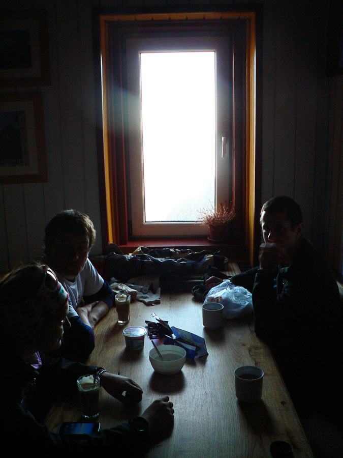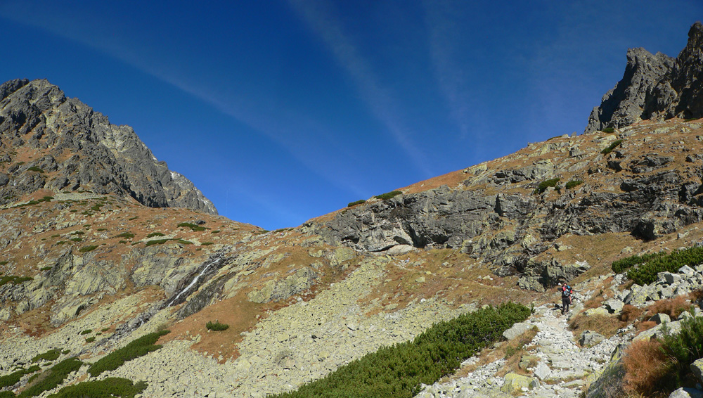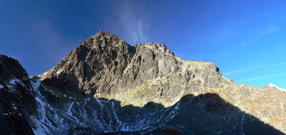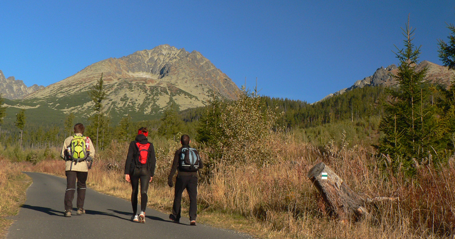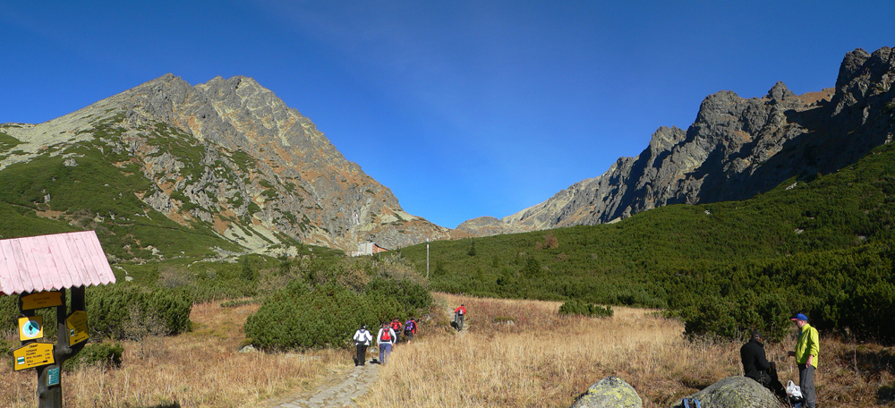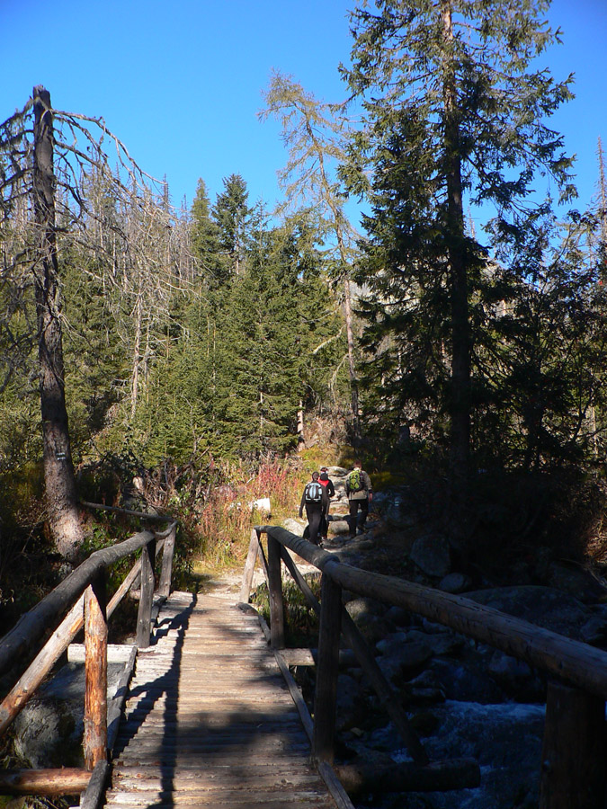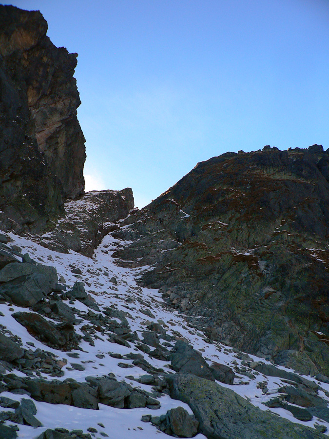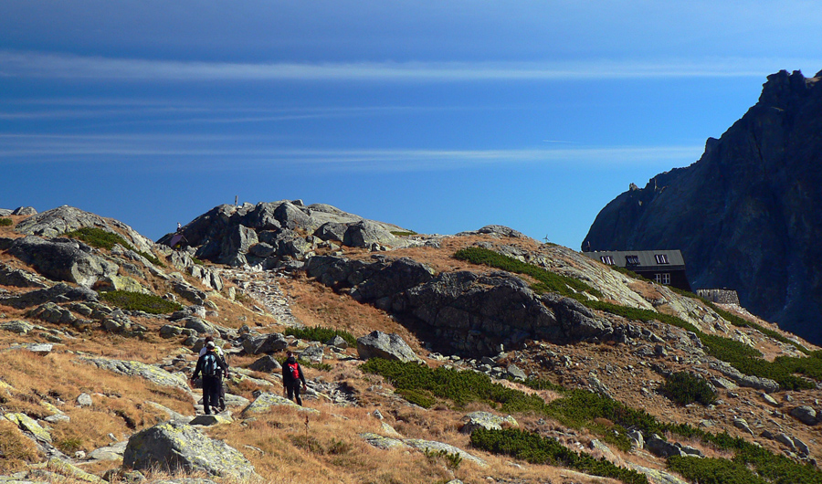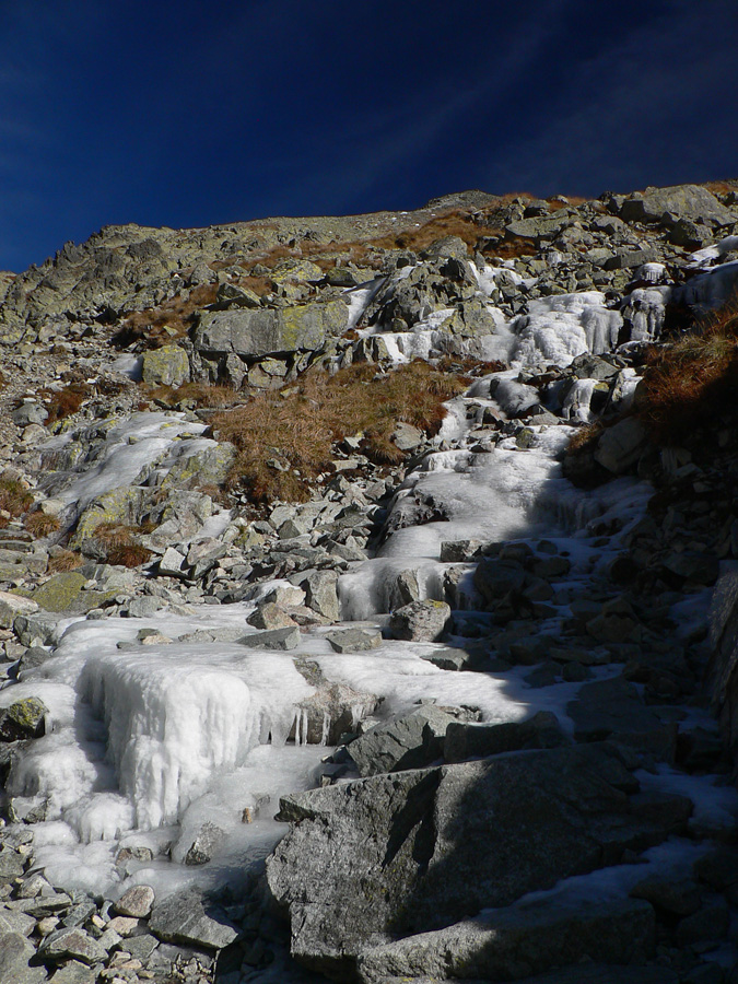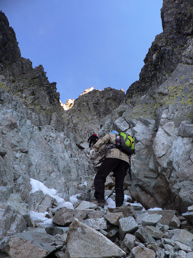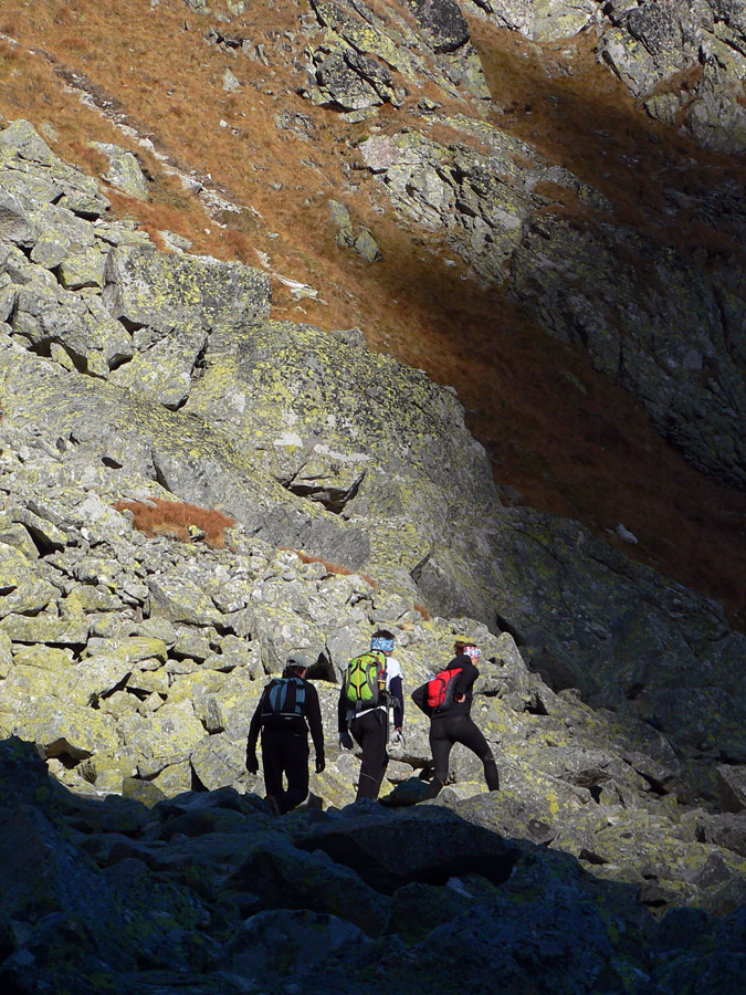 A tak sa šlo dolu – pomaličky, s pauzami na obchádzanie, zo skalky na skalku. Do hlbokého a zamrznutého popoludňajšieho tieňa nám škodoradostne odnaproti svietili Lomničák s Kežmarákom. Ale potom sa zas bežalo ako u besných. Našťastie krátko, lebo to už rozvoniavala kávička a čajíčky z Téryny. A tam sme akosi ešte na dlhšie zakempovali. Zrazu len piata odbila! A to prídeme za tmy dole či ako? Jasné že čelovky sme nemali, veď načo v októbri, že?