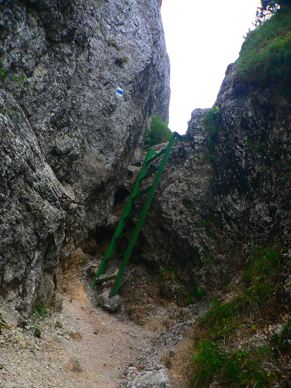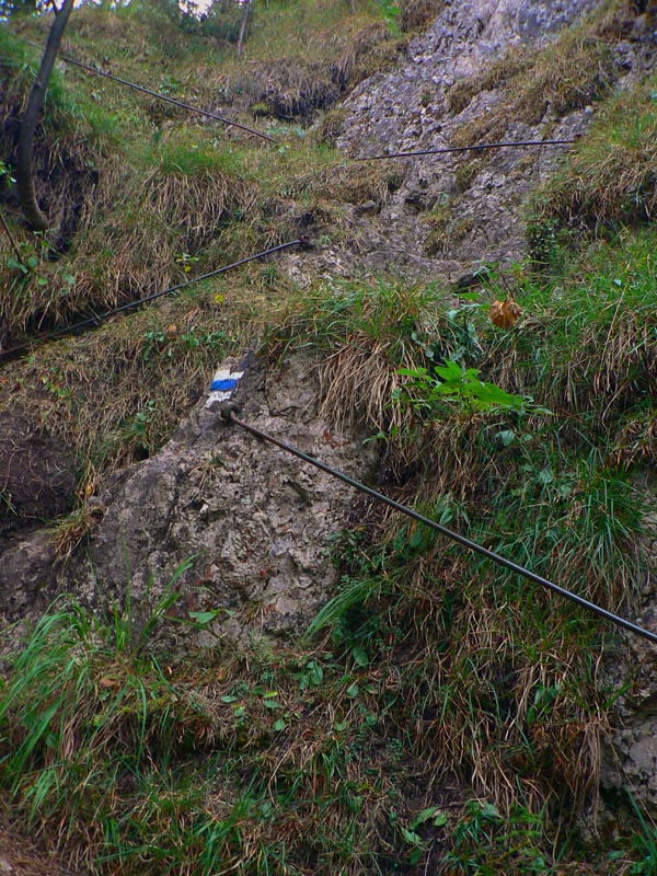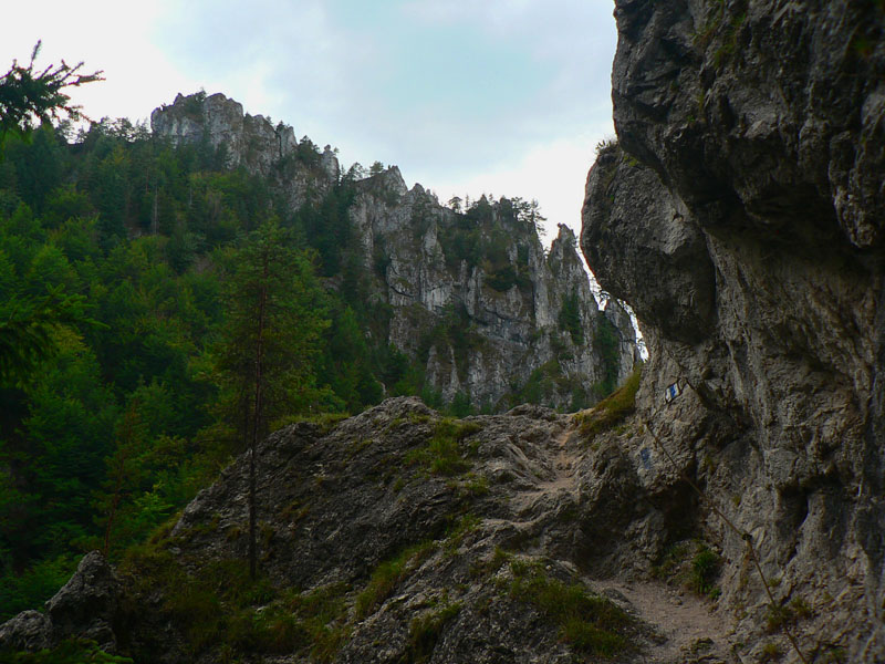 Nasleduje poriadne prudký zostup dolu z Bobot k asfaltke a rovnako prudký výstup na Malé nocľahy v masíve Sokolia. Zo dve krátke reťaze na pomoc, do Sokolia aj schodíky, ale hlavne veľa skál, veží, vežičiek nad hlavou a pod nohami ešte viac voľnej sute. Radosť padať :-) Len na to že sme v NPR Tiesňavy, dosť zaskočí pohľad na výsek s elektrickým vedením - priamo pomedzi skalné veže. Slovenská realita...