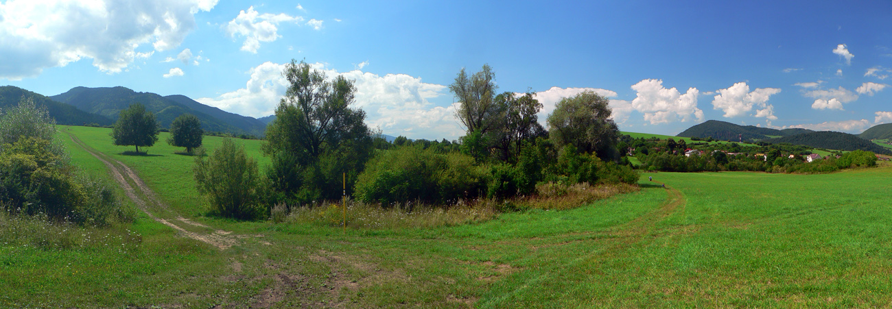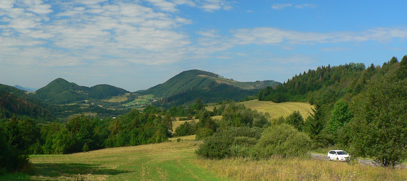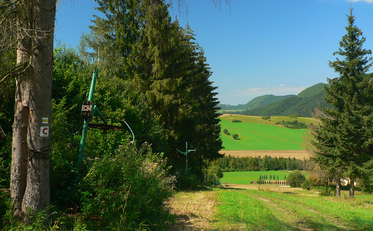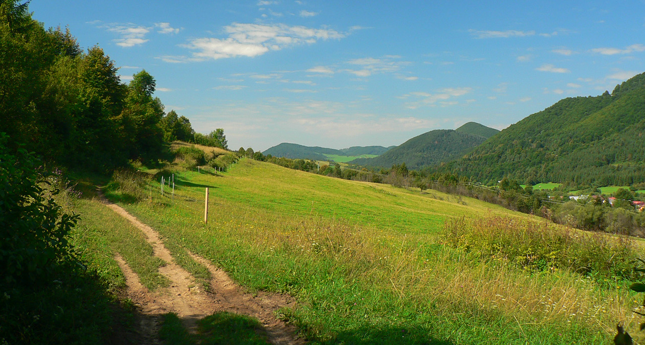 Takže na začiatok do Lysice po asfaltke a odtiaľ po žltej cez osadu Chabadovci. Len za dedinou, nad osadou Svetlov, treba bajk potlačiť, z cesty ostal hlboko erodovaný výmoľ. Ale už ho reparujú. Druhé krátke potlačenie nad osadou Ďurčovci – zas kombinácia strmého sklonu a erózie cesty. Potom už pohodová „hrebeňovka“, čiže široká cesta až do sedla Lutiška, so širokými výhľadmi z lúk.
