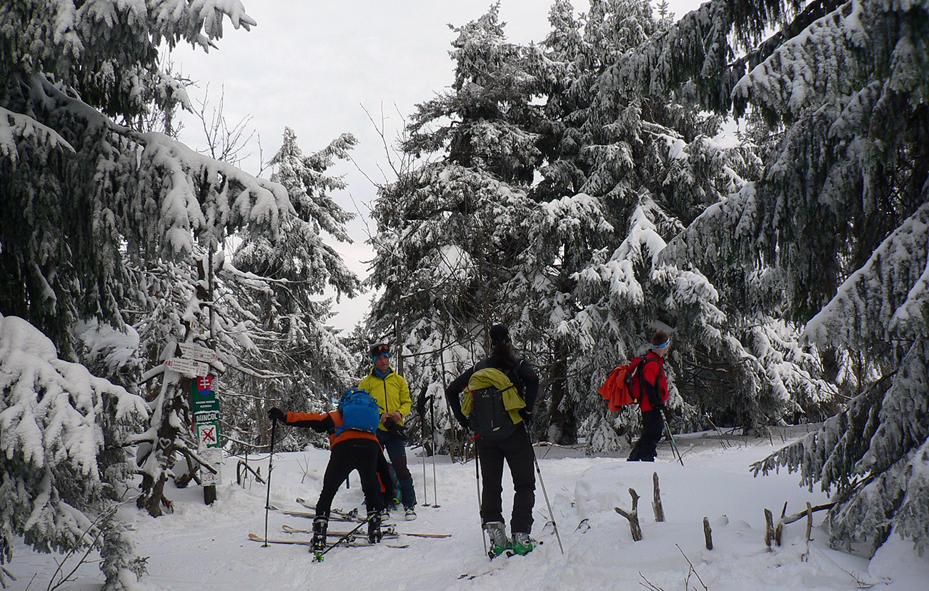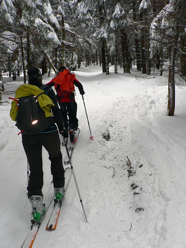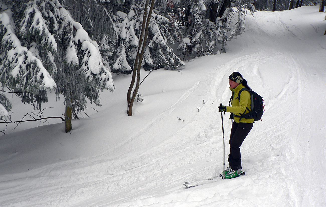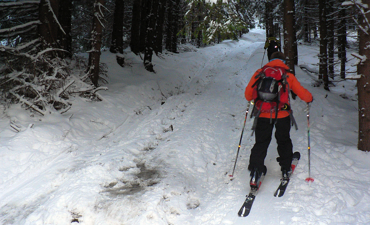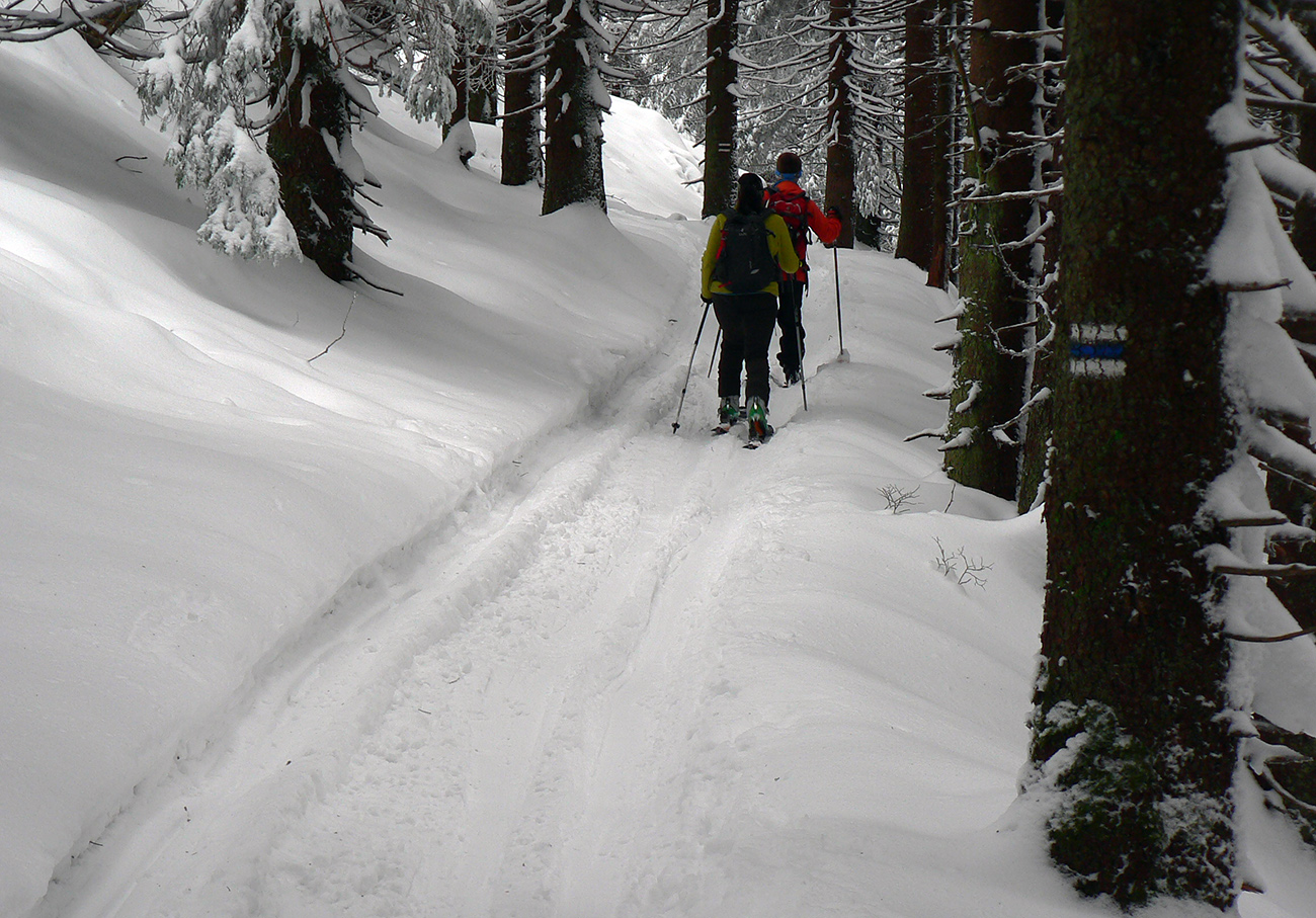 Sme hore, medzi Kubínskou hoľou a Minčolom – viditeľnosť ďaleká, aj keď pod mrakom. Nefúka, je to dnes paráda! Stopa do Príslopu viditeľná, ale dnes ešte nepreleštená. My ideme opačne. Pekne po modrej na Vasiľovskú hoľu a polyžovať dole k polievke. Hrebeňová lúka pod Minčolom (tráva ešte trčí) a prvý zošup lesom - je krátky, tak na rozcvičenie. Snehu dosť aj na brzdenie pluhom.