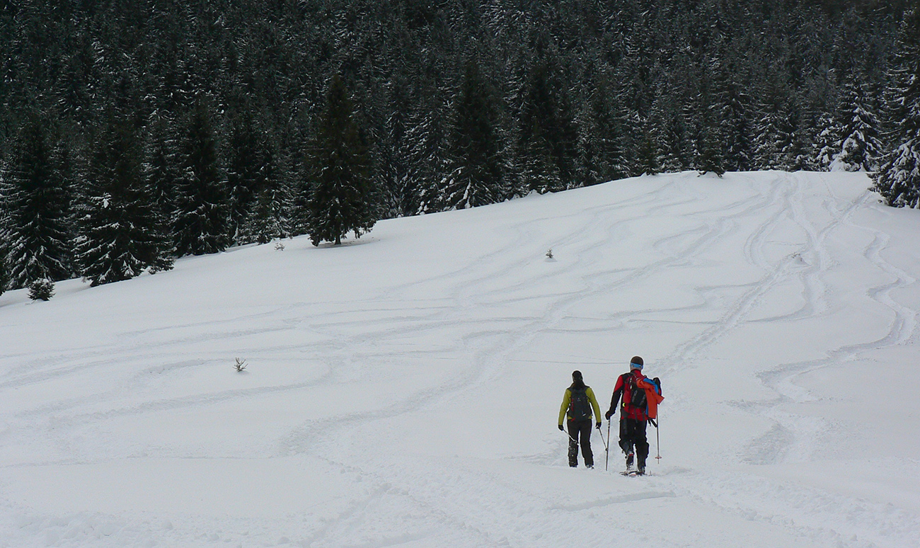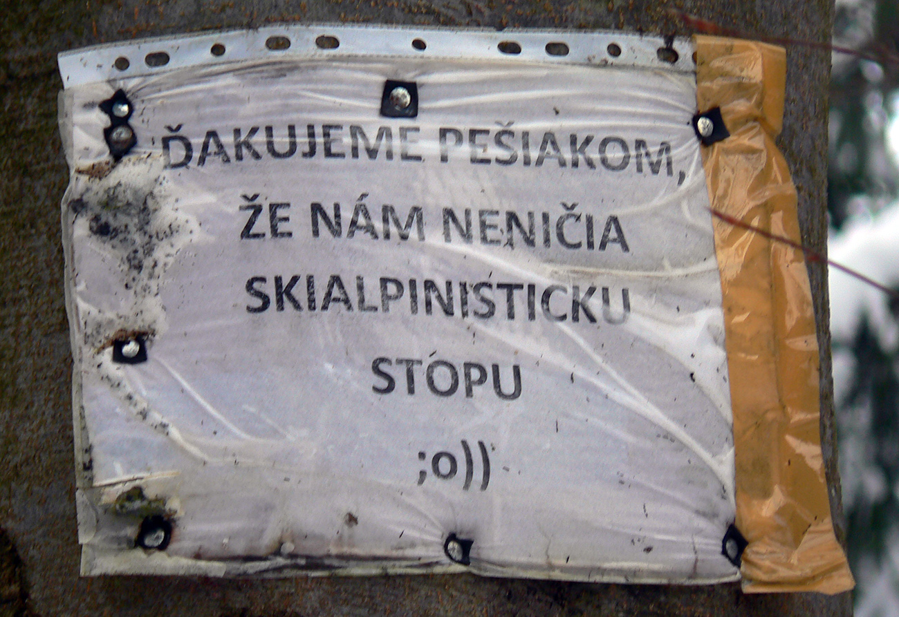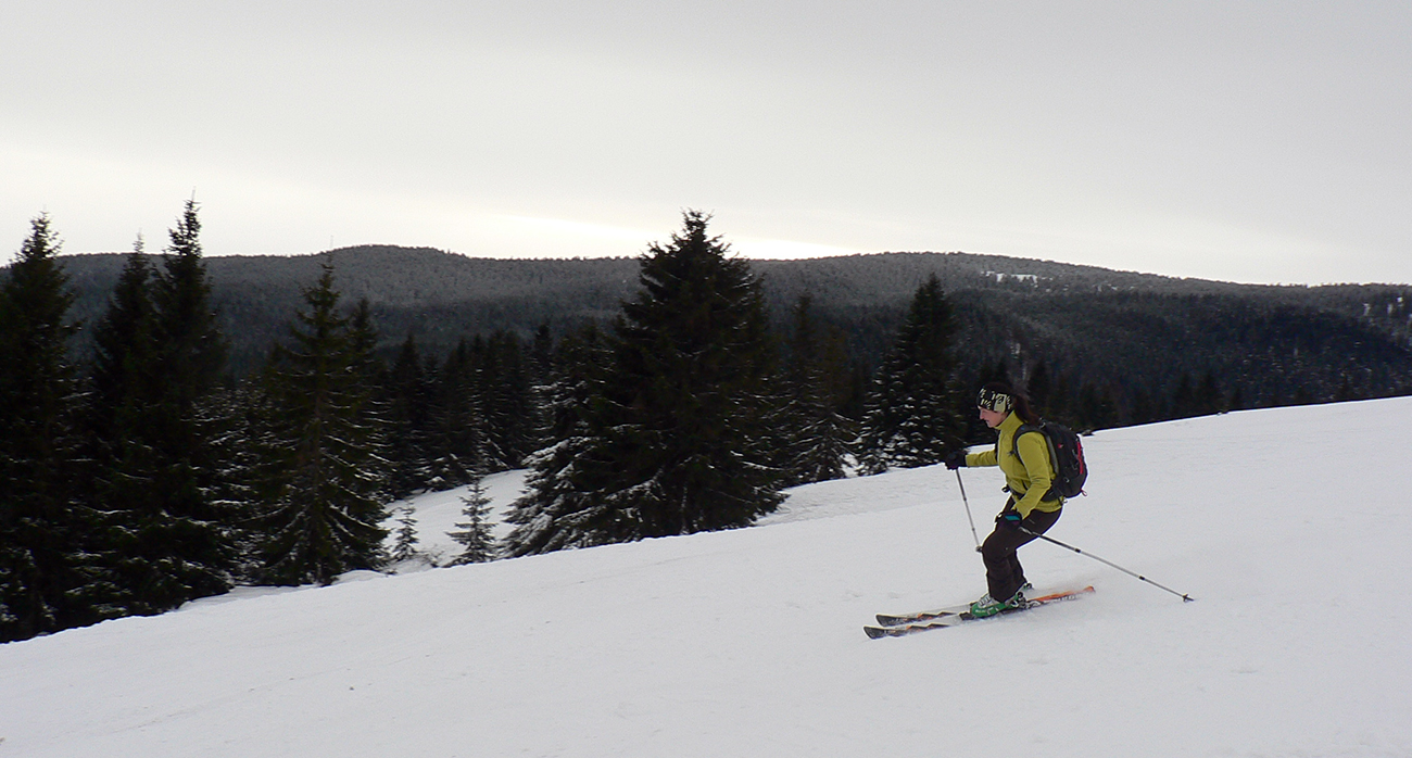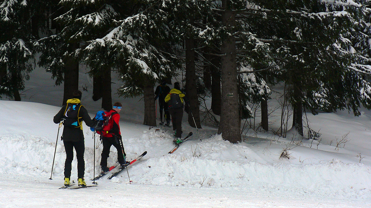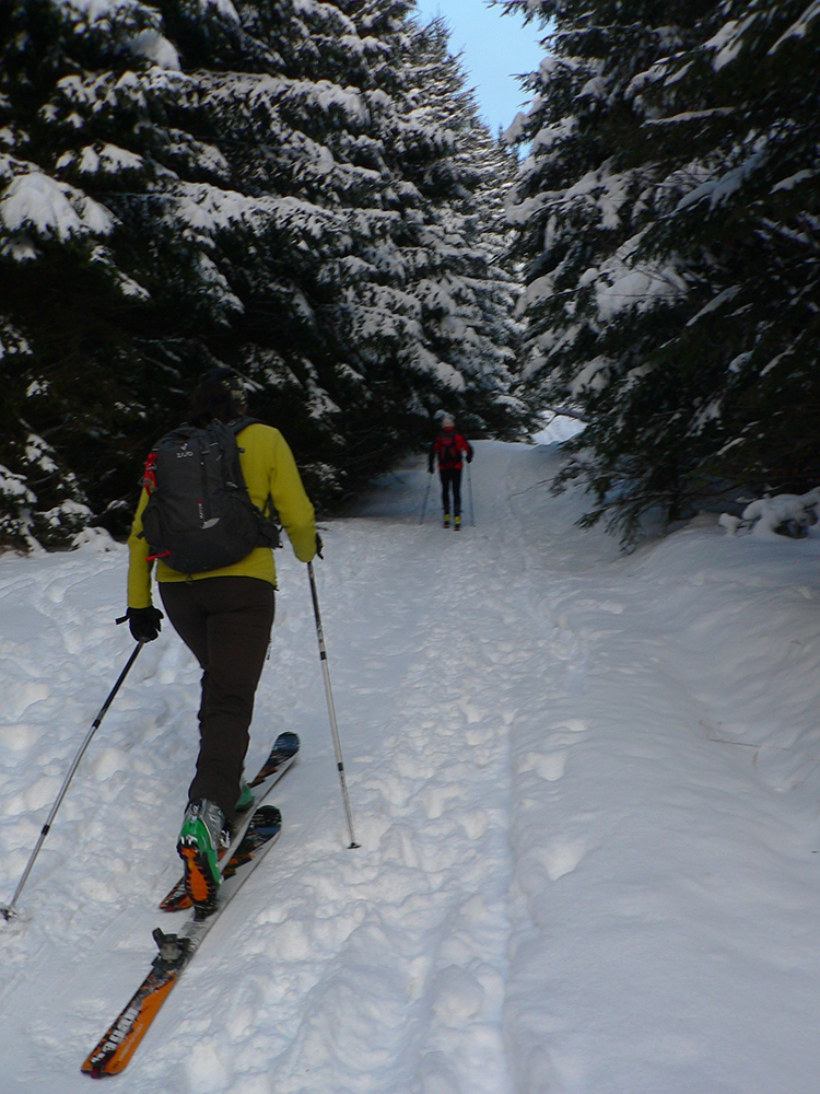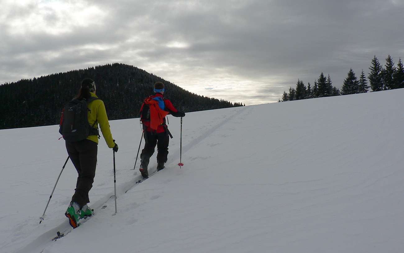 Sme hore, medzi Kubínskou hoľou a Minčolom – viditeľnosť ďaleká, aj keď pod mrakom. Nefúka, je to dnes paráda! Stopa do Príslopu viditeľná, ale dnes ešte nepreleštená. My ideme opačne. Pekne po modrej na Vasiľovskú hoľu a polyžovať dole k polievke. Hrebeňová lúka pod Minčolom (tráva ešte trčí) a prvý zošup lesom - je krátky, tak na rozcvičenie. Snehu dosť aj na brzdenie pluhom.