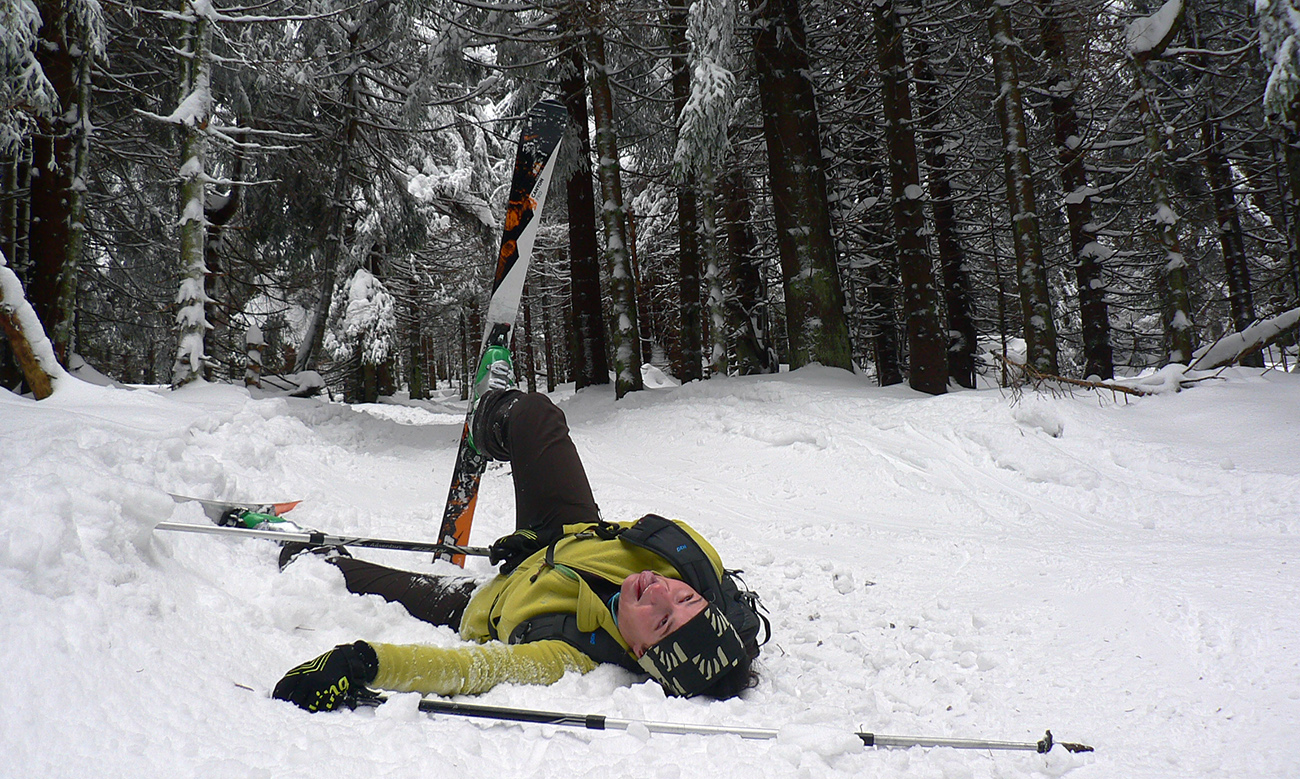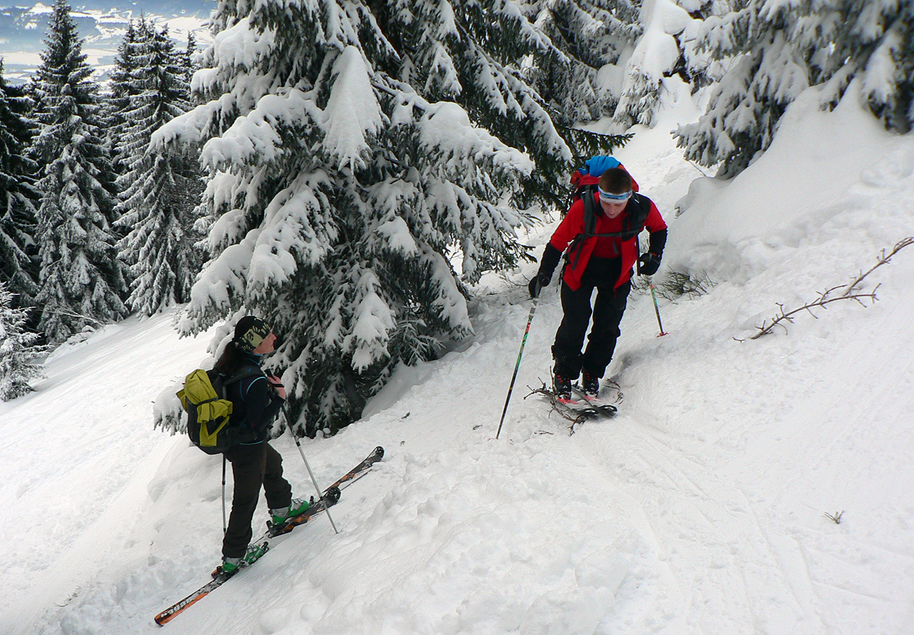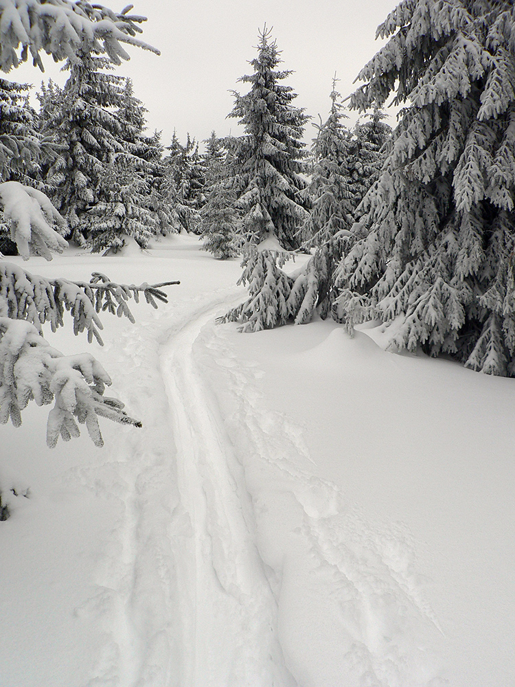 Čím vyššie, tým hlbšie koľajničky, tu na Orave ozaj nasnežilo pekne! Skratky lesom komfortne vycikcakované, diaľnica k chate komfortne poratrakovaná, cikcaky frírajdovým lesom pod hrebeňom (väčšinou) komfortne naklonené. Prví púdroví jazdci už sa spúšťajú okolo nás, po kolená v prašane, pochvaľujú si. Aj keď niekde za nimi presvitajú jafury.