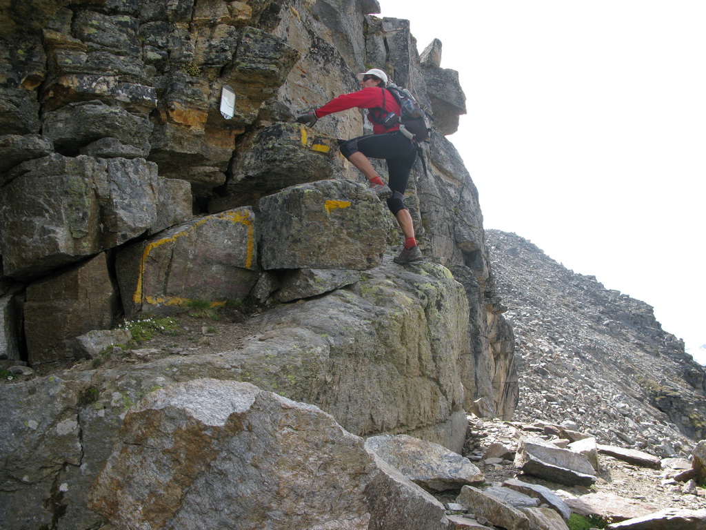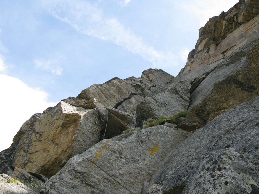 Po prelezení asi 20-metrového strmého úseku sa terén zmierni a postupuje sa suťovým poľom. Trasa je značená žltou farbou, ktorá je na niektorých miestach už dosť vyblednutá. Odporúčam preto mať hlavu hore. Prípadné odbočenie zo značenej trasy by sa nemuselo skončiť dobre. Hlavne v hornej časti, kde treba traverzovať vežičky sprava popod hrebeň, je značenie na nezaplatenie.