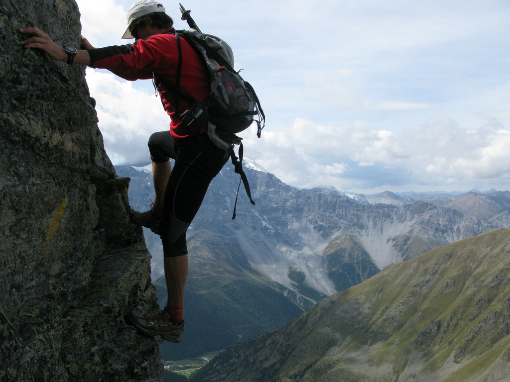 "Ale to musíš liezť na istotu štvorku!" povedal mi pred časom horský vodca Kurt, keď som mu porozprával o jednom z mojich plánov. Trvalo to teda chvíľu, kým som sa postavil pod nástup, pripravený na Westgrat. Dôvodom však nebola obtiažnosť, ale dôvod, že do Suldenu nechodím kôli horám... :-) Najťažší úsek celého hrebeňa je hneď na nástupe zaistený tenkým oceľovým lankom, prevlečeným cez skobky. Nie je to žiadna originálna ferrata, rukavice podstatne zlepšia kontakt ruky z lanom.