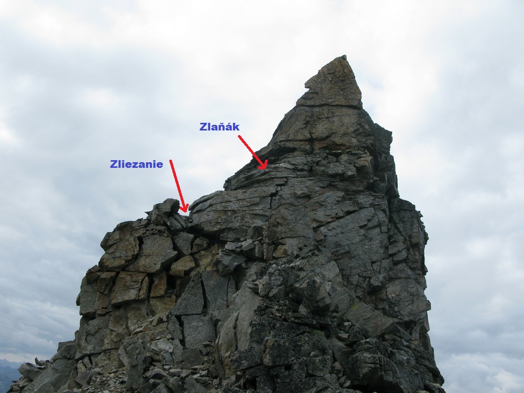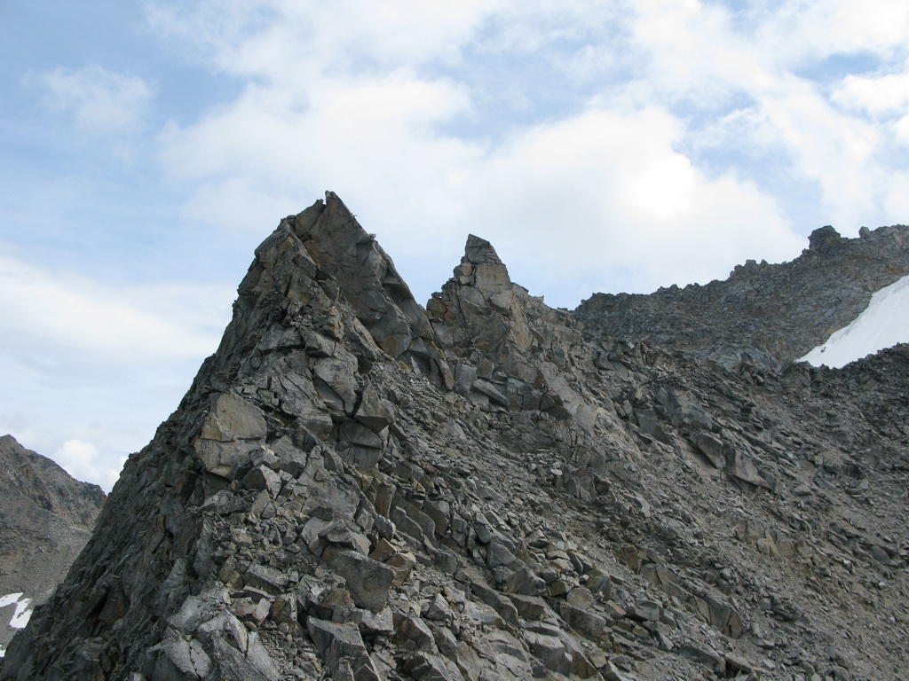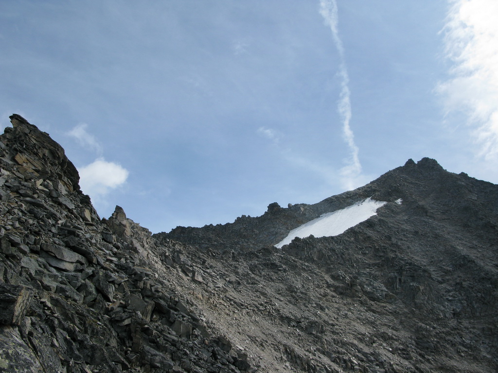 Po prekonaní nepríjemného zliezania, našťastie tiež opatreného záchytným balkónom, ešte síce nasleduje delikátny hrebienok, ale stupy a chyty sú tam, kde majú byť. A keď aj hlava je tiež... tak by nemal byť problém. Záverečný hrebienok z jednej strany olizuje snehové pole zmenšujúceho sa ľadovca severnej steny. Musel som ísť dokonca aj dva metre po snehu. Skaly sú tu na sebe naukladané tak, akoby sa mali každú chvíľu zosypať - takže pozor!