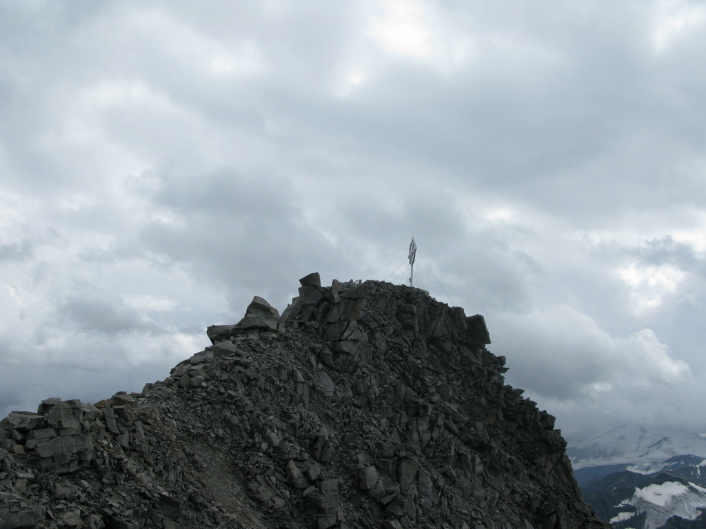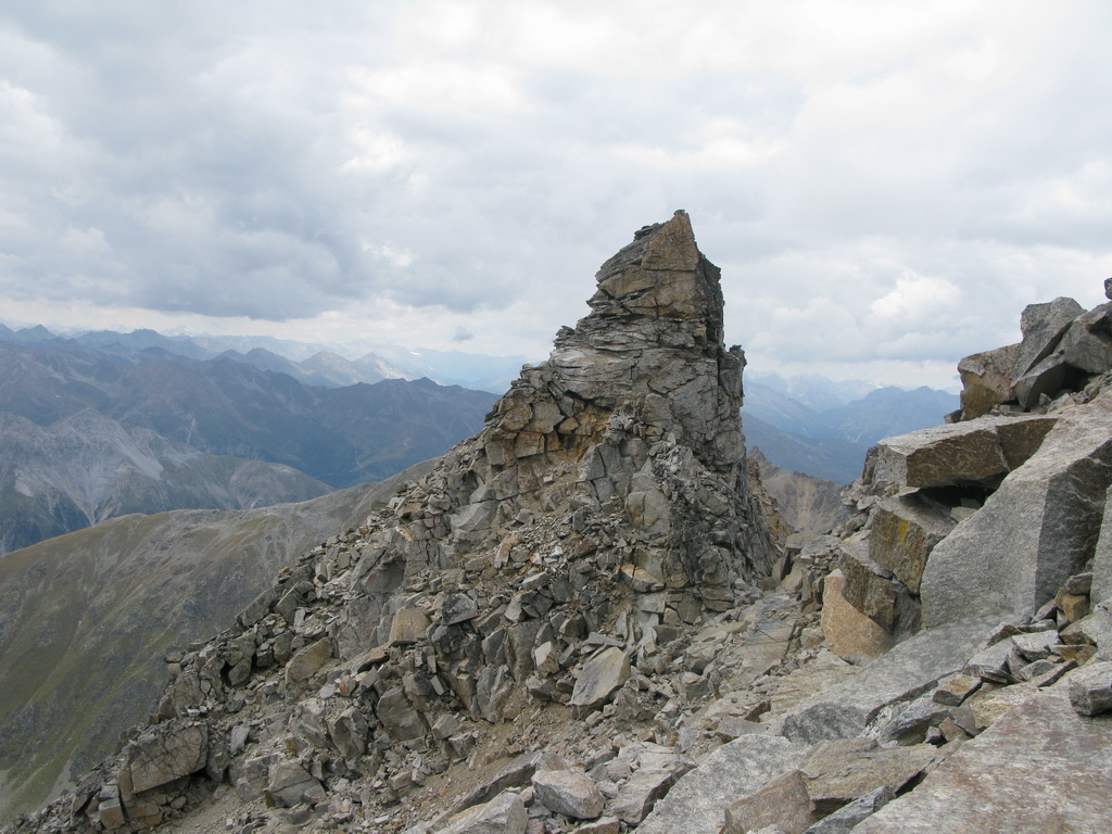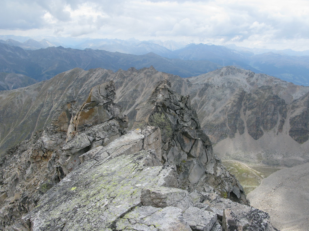 Doliezam na hrebeň. Vertainspitze má dva vrcholy. Pod tým západným je tabuľka. Mladý domáci chalan sa tu zabil asi pred dvoma rokmi. Hrebeň smerom na Angelusscharte je už naozaj ako mínové pole. Ten radšej zo svojich plánov vypustím.