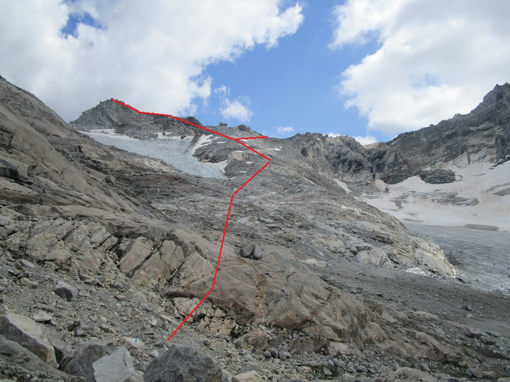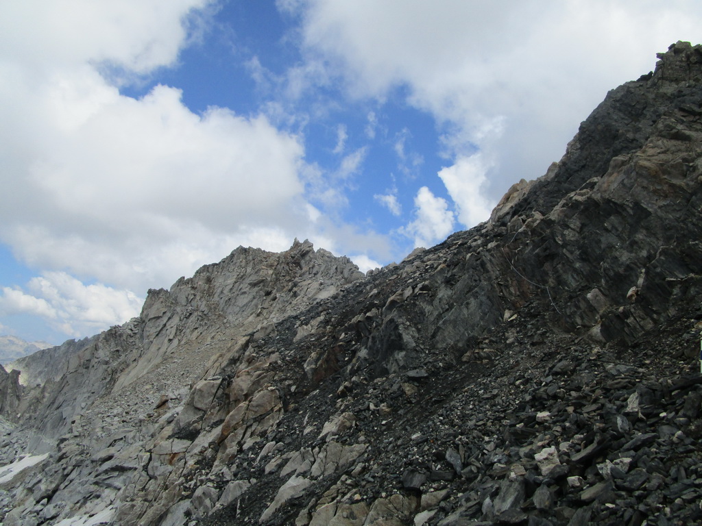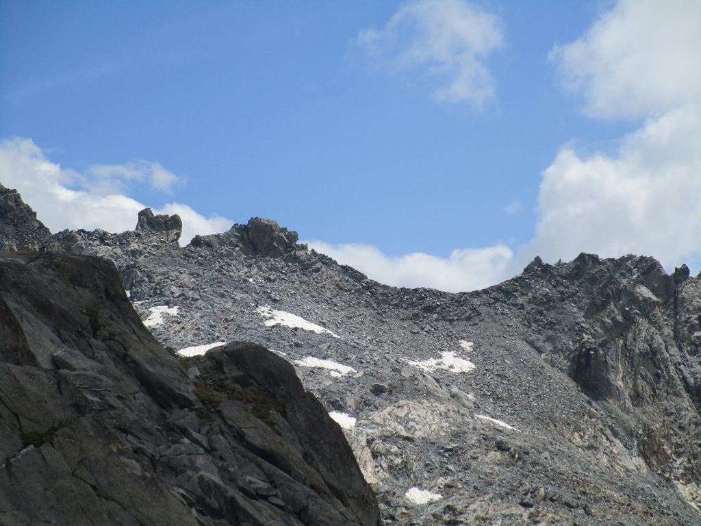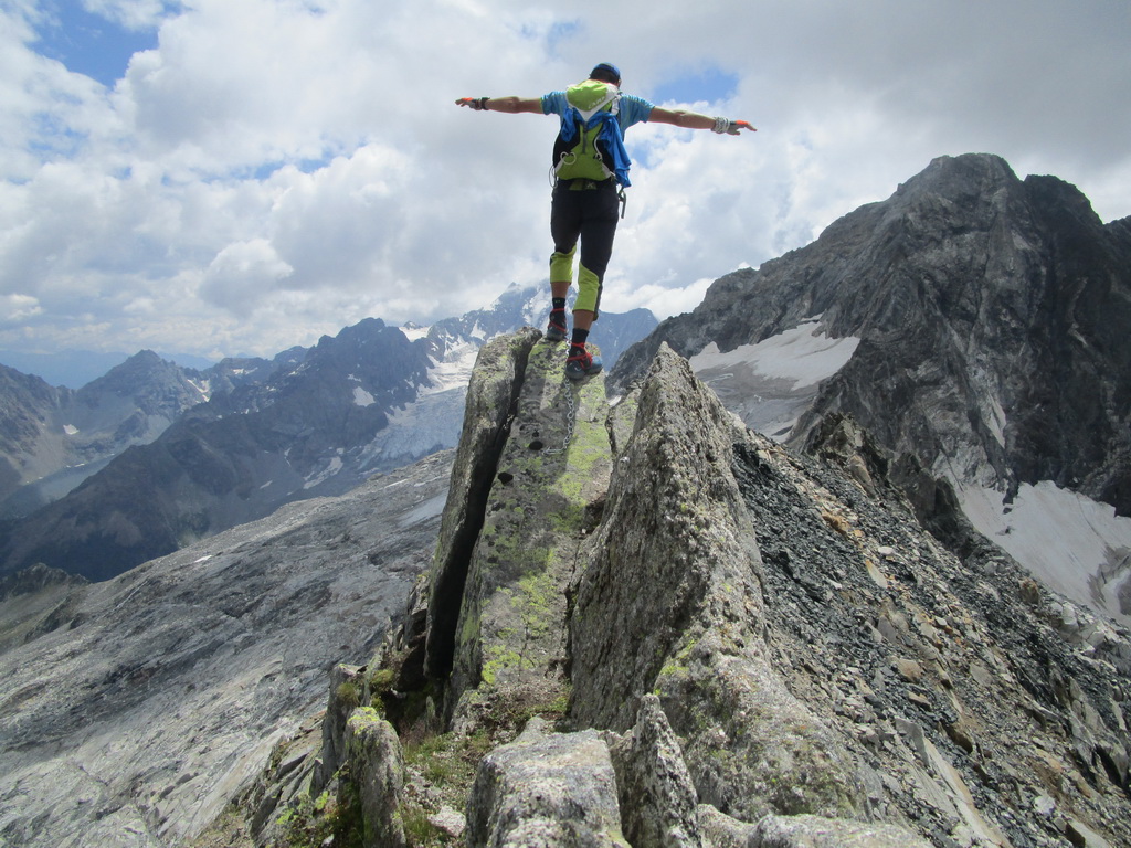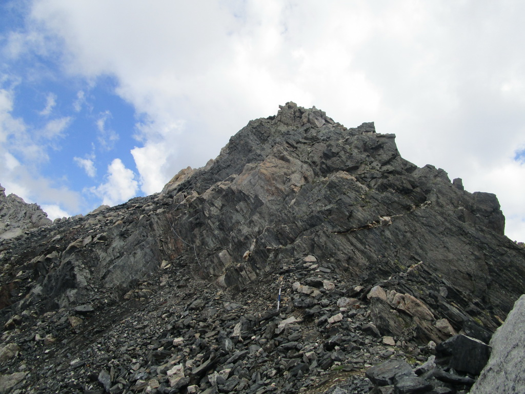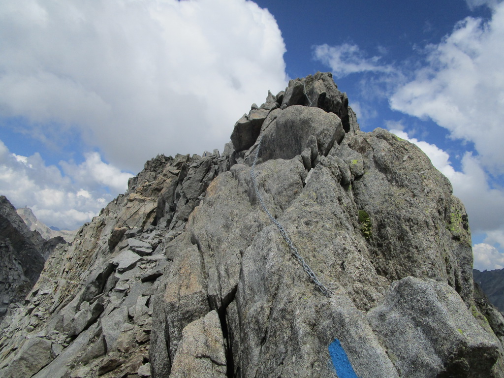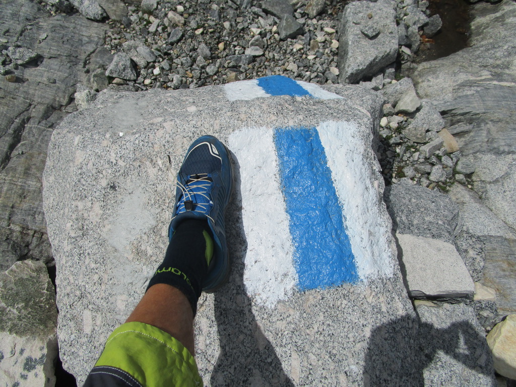 Vyrážam s pozdravom, že vidíme sa za pár hodín... Začiatok vedie po už známej trase na Monte Rosso, ktorú Beat dokončil minulý rok a report z nej si nájdete dole pod článkom. V miestach kde značka odbáča smerom hore na vrchol odbočuje doprava nová modrá značka. Tá ma zavedie až na Passo Vazzeda ale tesne pod ním tu je vyznačená odbočka doľava na vrchol Cima di Val Bona. Pod vrcholom pekný hrebienok, najkrajšie úseky zaistené reťazami.