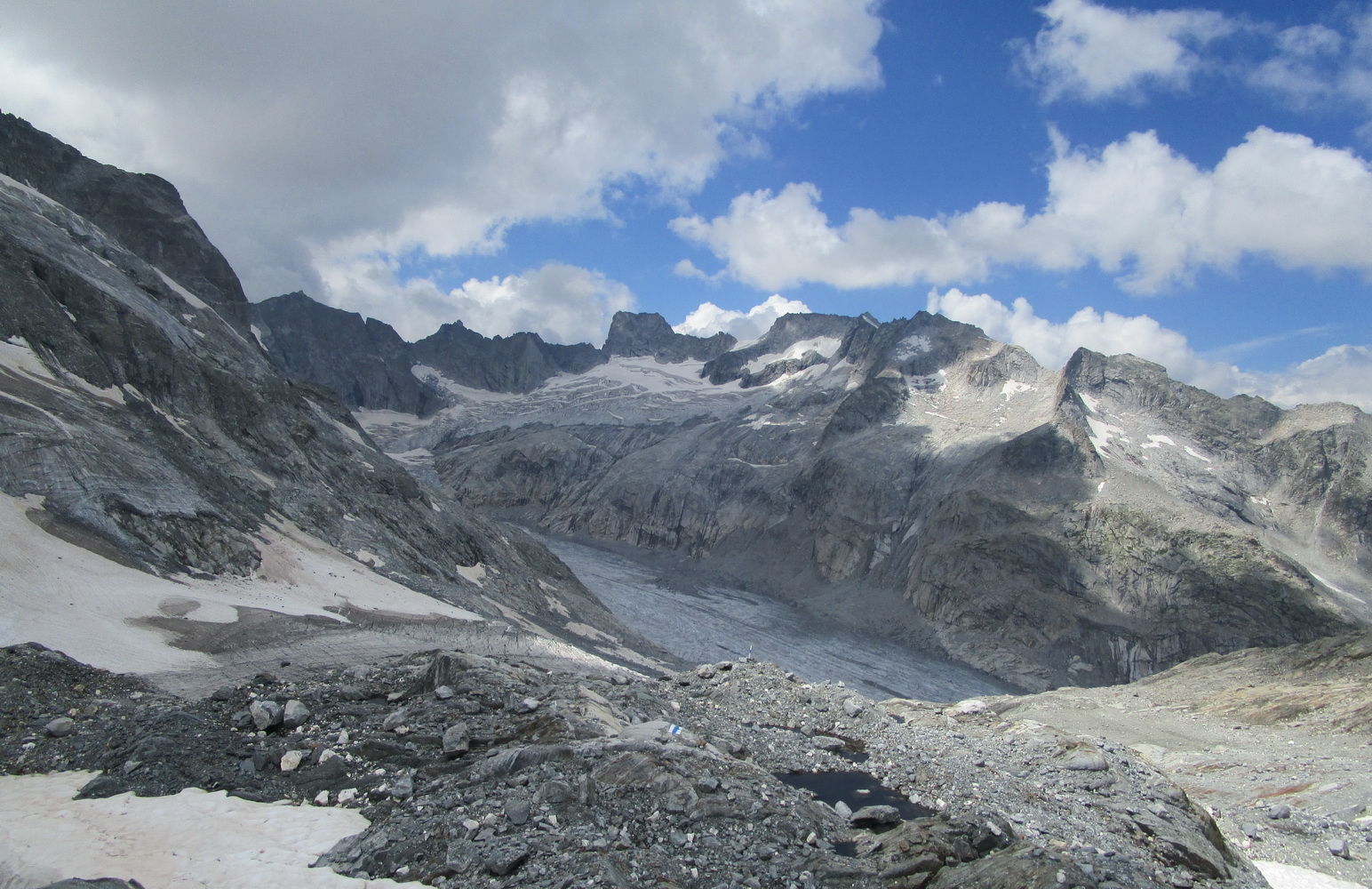 Uzatváram okruh pri chate. Ľadovcový tunel ešte stojí ale už sa mi nechce ísť až ku nemu spraviť fotky. Horúčava urobila svoje. Dopĺňam tekutiny, čaká ma ešte návrat dole.