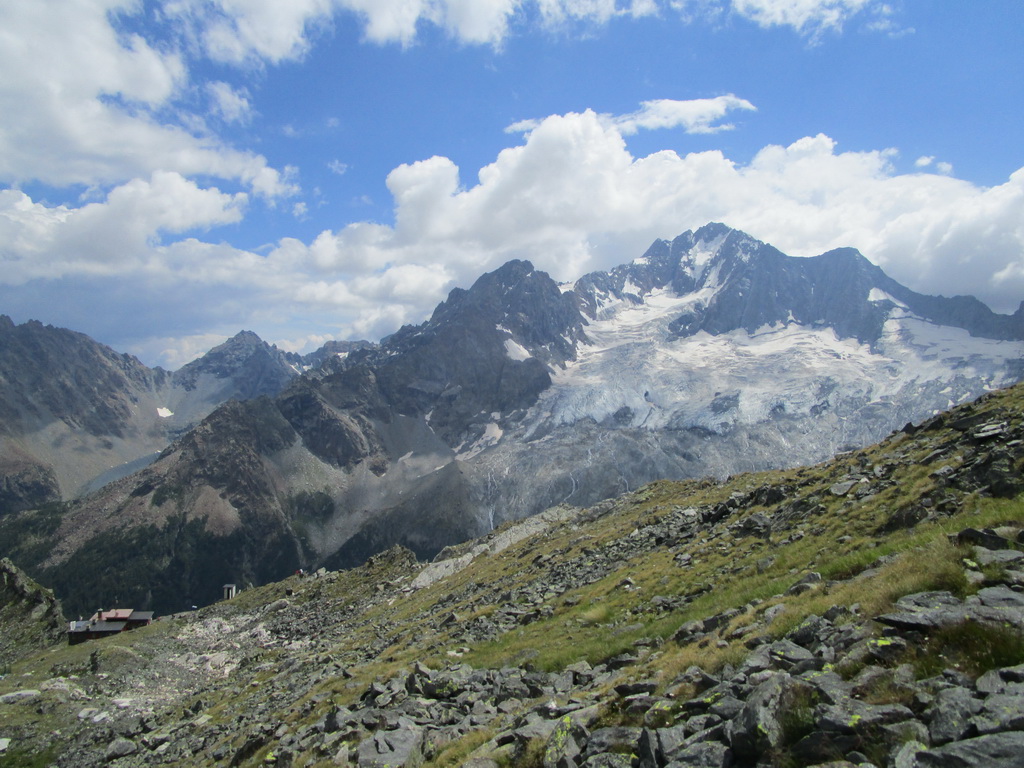 Výhľady sú parádne na všetky strany a je veru čo obdivovať. Na vrchole sa trošku venujem foteniu, rovnako aj pod ním pri návrate dole. Z Passo Vazzeda sa prehupnem na taliansku stranu. Po červenej značke sa dostanem až ku chate Grande Camerini. Na terase posedáva zopár talianov. Pri koláči s kolou sa dáme do reči. Dozvedám sa, že chata nemá stáleho chatára ale že ju prevádzkujú dobrovoľníci z horolezeckého oddielu. Striedajú sa každý týždeň, prípadne dva...