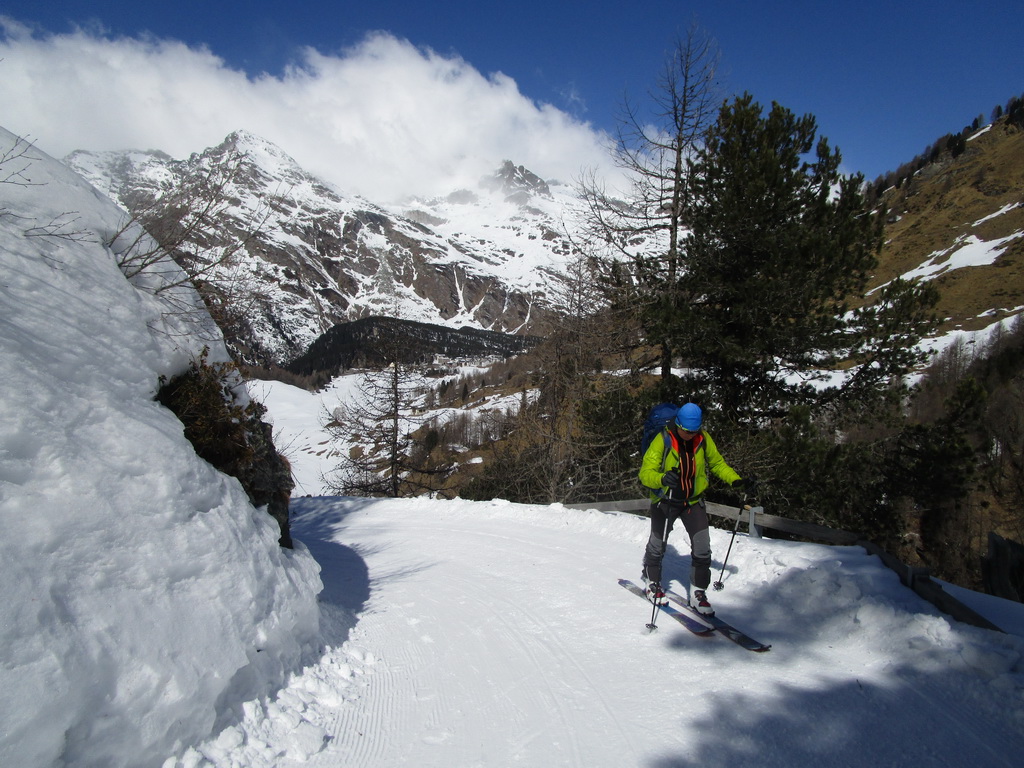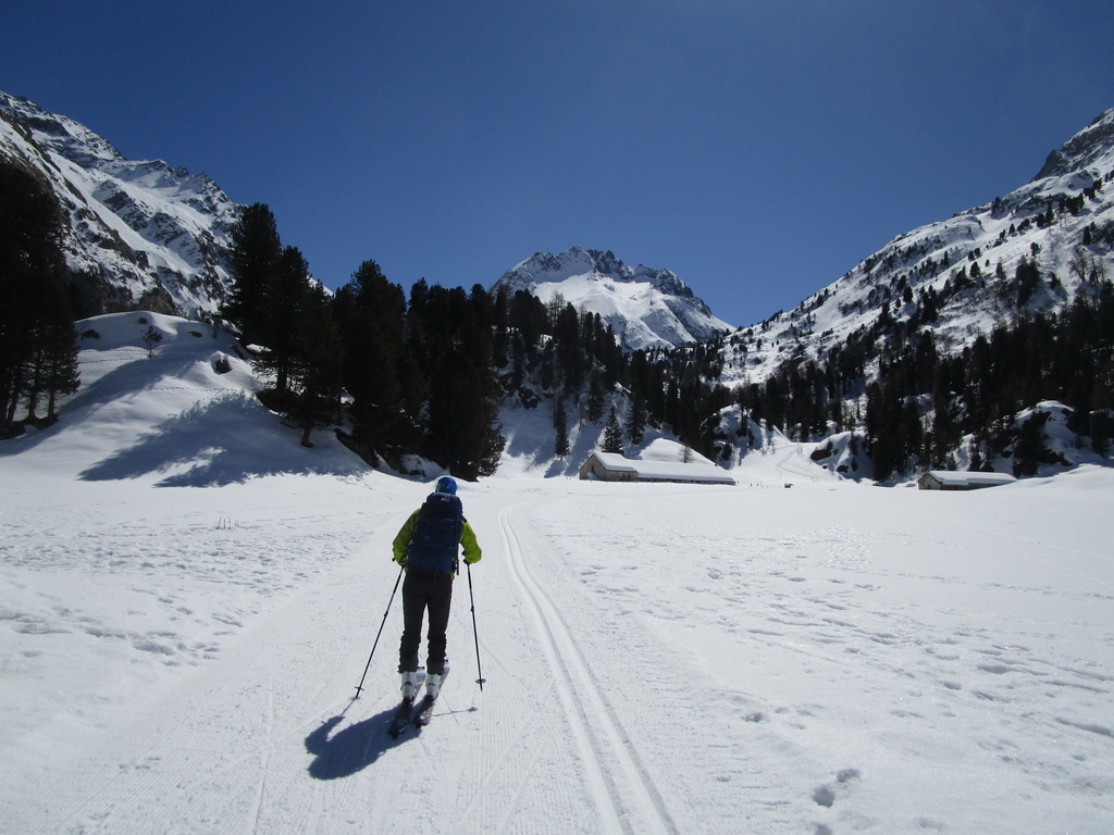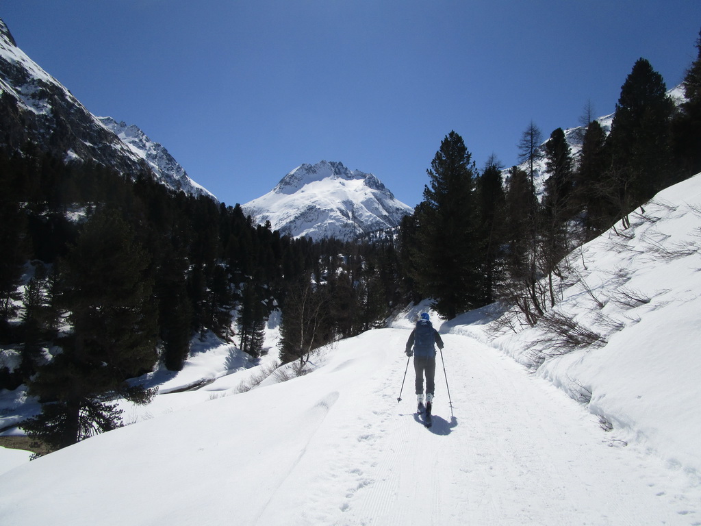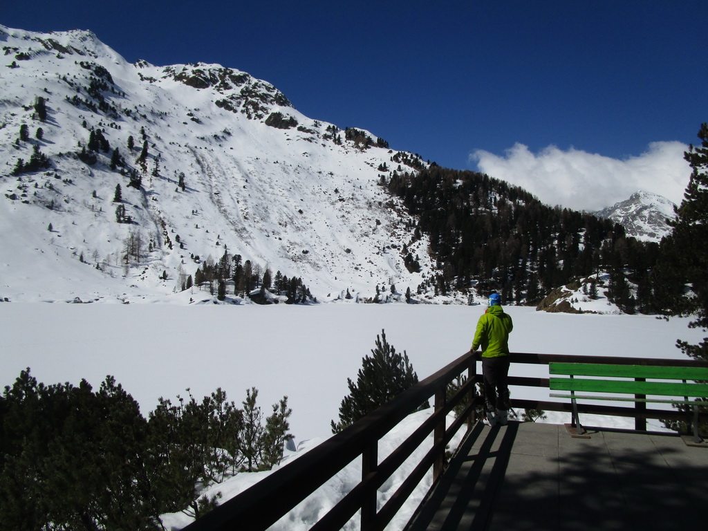 Z parkoviska vyrážame najprv po bežeckej stope popri bezpečnostnej nádrži ktorá má za úlohu v lete zastavovať prívalové dažde. Prejdeme cez mostík nad hlbokým kaňonom a pokračujeme po vyratrakovanej bežeckej stope smer Lej Cavloc. Táto v zime udržiavaná bežecká stopa (aj pre peších) nám výrazne uľahčuje postup smer Val Forno.