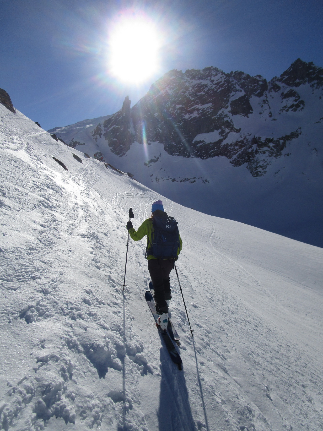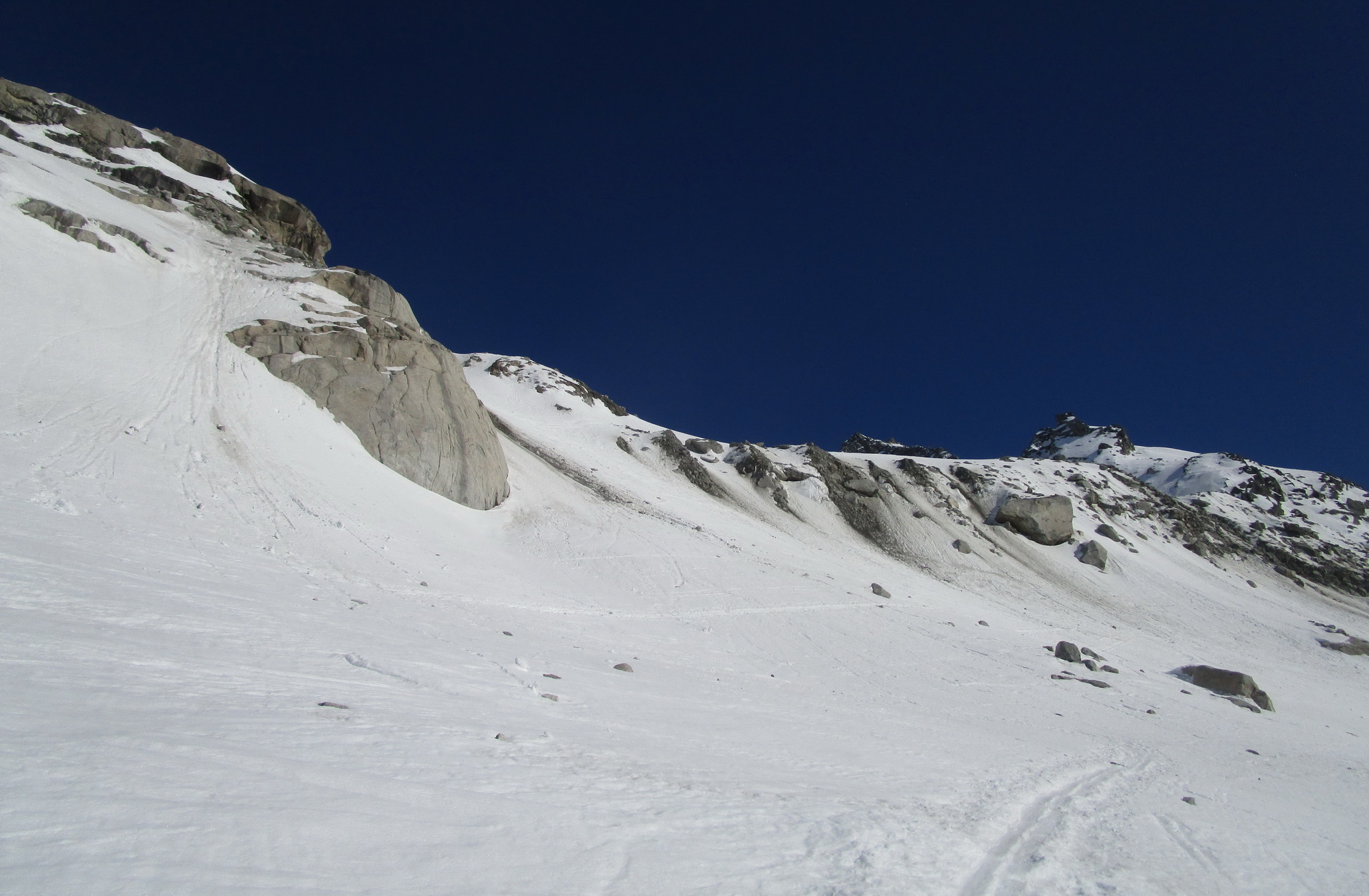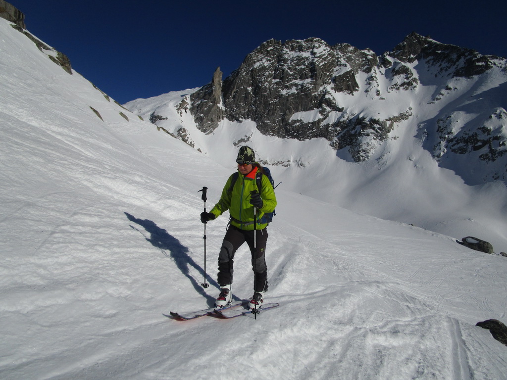 Vidíme dvoch skialpinistov ako sa trápia v strmom svahu ktorým vedie v lete chodník. Je tam tvrdo. Rozhodujeme sa, že skúsime výjsť na chatu v smere kadiaľ viedol starý letný chodník. Zaujíma ma ako to tam vyzerá, ešte som tadiaľ nešiel. Nasmeruje nás tam lyžiarska stopa. Je výrazná. Už dlho nesnežilo. Prichádzame pod svah tvorený ľadovcovou morénou. padajú tu takmer neustále kamene. Stúpame strmým žľabom a hlavy máme hore aby sme vedeli uskočiť pred prípadným kotúľajúcim sa kameňom. Našťaste to netrvá dlho a sme z ohrozenia preč.