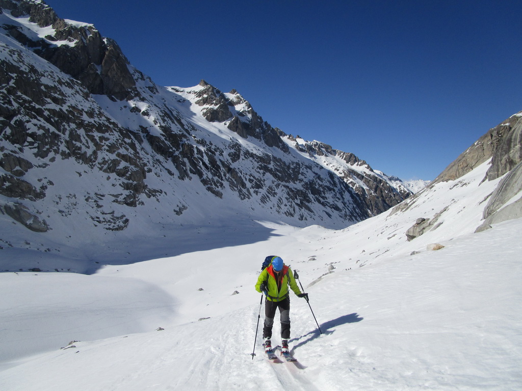 Až neskôr na chate zisťujeme, že naše sedlo sa volá passo di Val Bona. Zjazdujeme z neho na druhú stranu parádnym žlabom po mierne odtopenom firne. Mali sme šťastie. Okruh uzatvárame ešte výstupom od ľadovca hore ku chate. Snažíme sa vyhnuť padajúcim kameňom a tak sa hore vyšplháme na mačkách strmým firnovým žľabom.