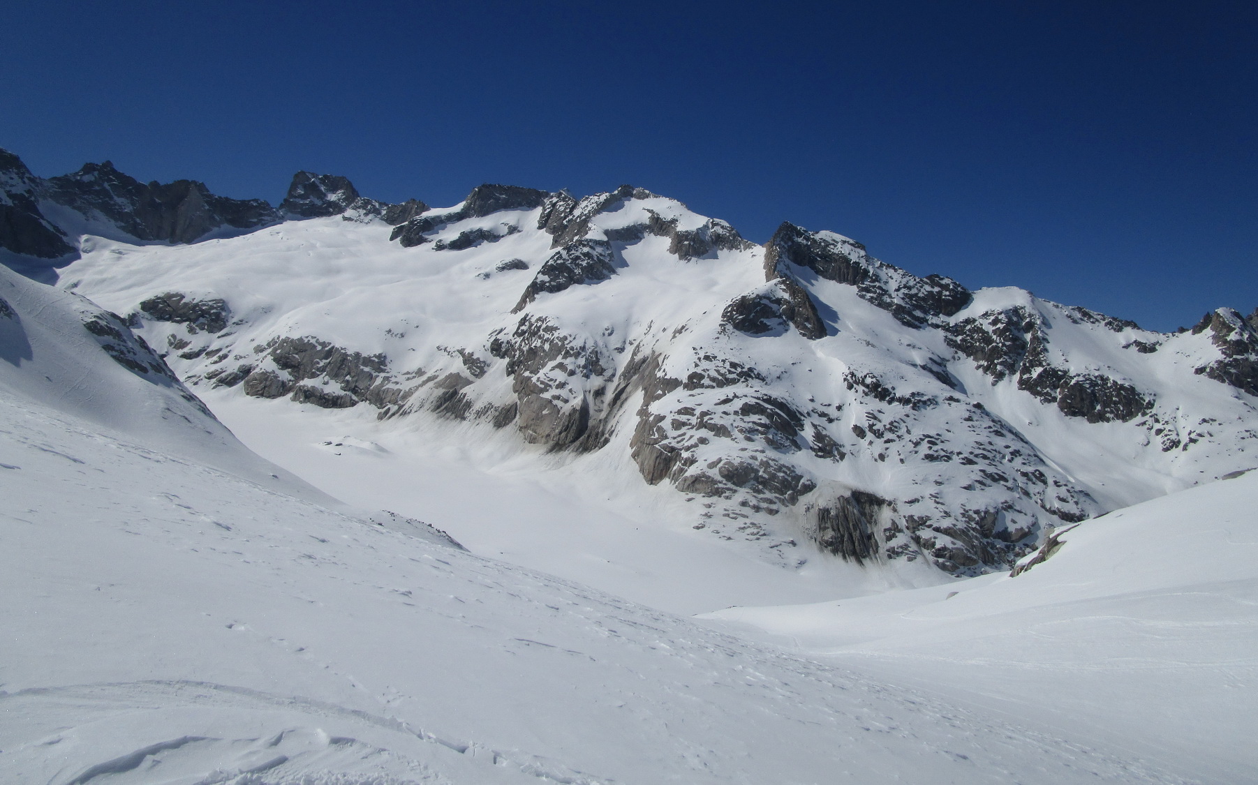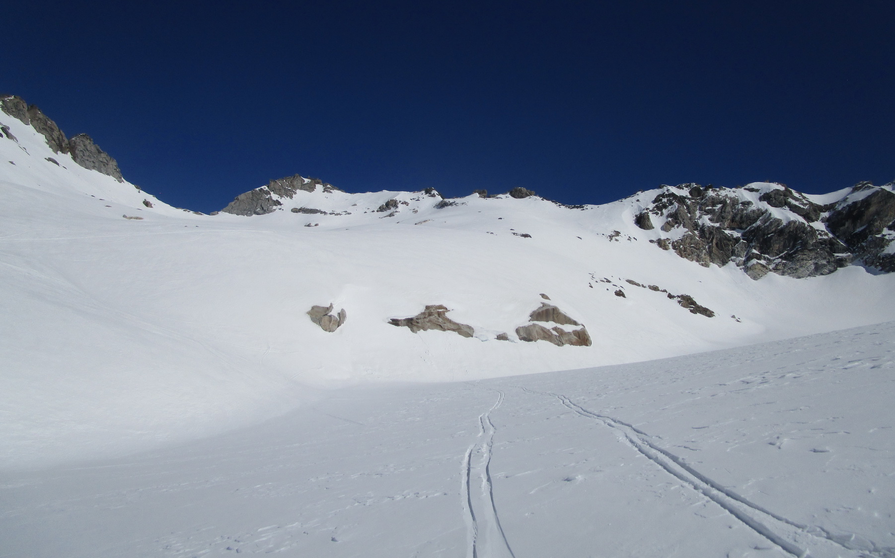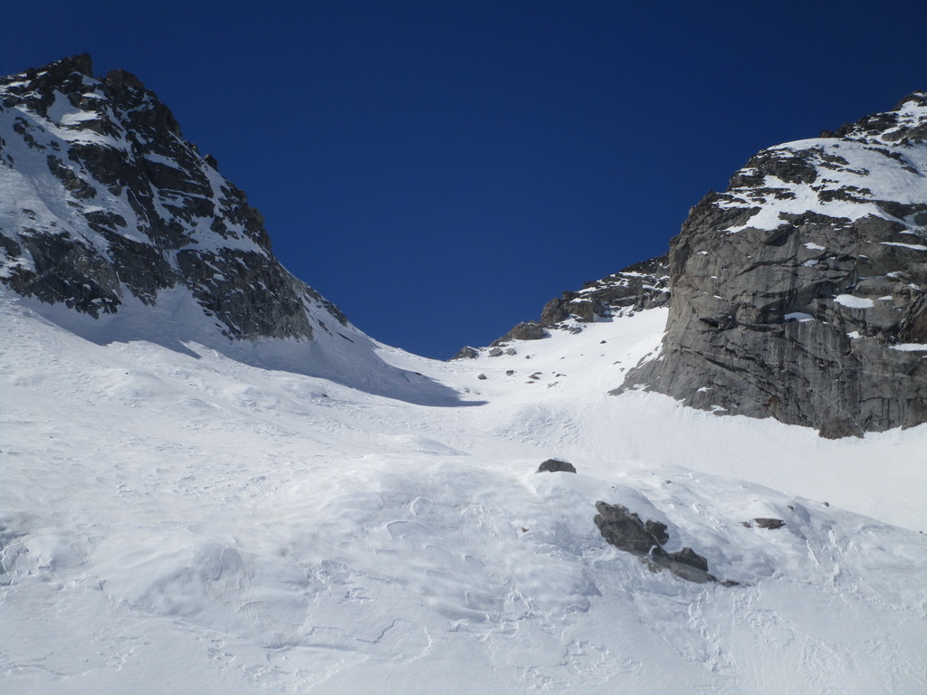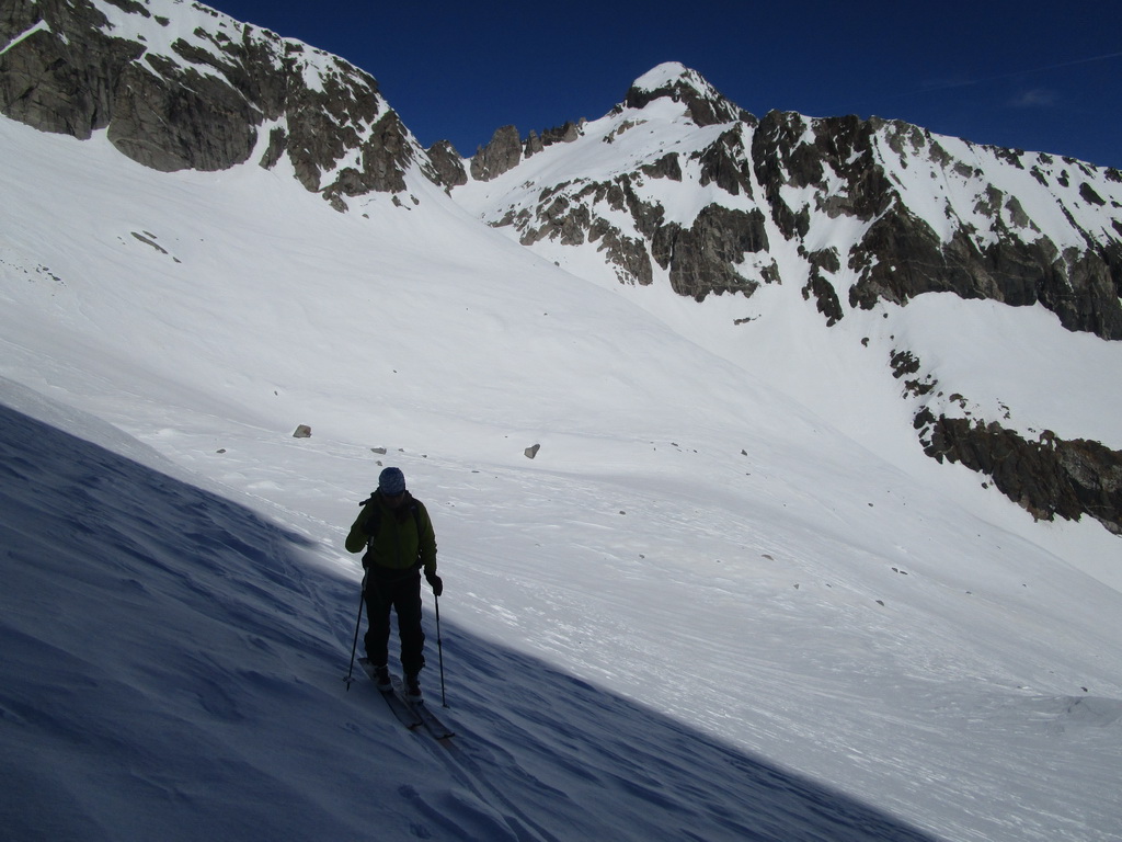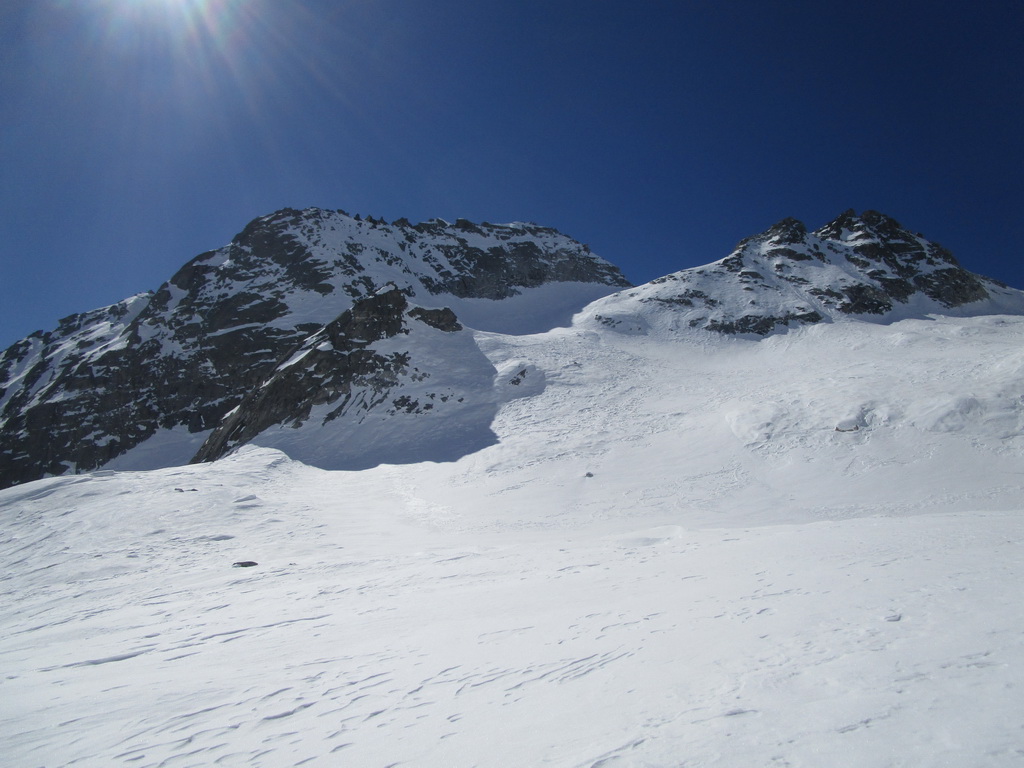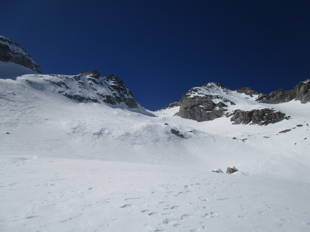 Rozhodujeme sa lyžovať zo sedla na druhú stranu do Talianska. Po asi 300 v.m. zastavujeme. Zjazd po parádnom firne. Pozeráme vpravo a vidíme dve sedlá. Podľa toho čo tu mám pobehané v lete a podľa stôp ktoré vidíme uvažujem, že by sa cez obidve sedlá dalo prejsť na druhú stranu a takto by sa mal dať urobiť okruh okolo Monte Rosso. Do sedla vychádzame s tým, že ak to na druhú stranu nepôjde stále sa môžeme vrátiť tak ako sme prišli.