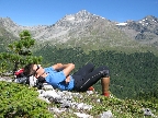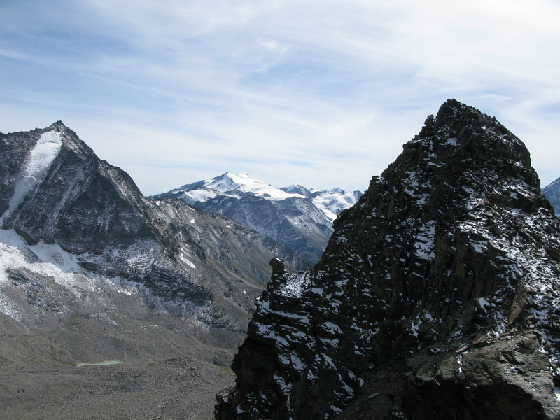 Na vrchole stretávame turistov, ktorý dnes vyrážali z chaty a vliekli so sebou celú výstroj... Máme šťastie na počasie a sme odmenení výhľadmi na dolinu Vinschgau o 2500 metrov nižšie. Pri zostupe mi Christian vysvetľuje, ako robili prechod hrebeňom Konigspitze - Zebrú - Ortler. Jednotlivé úseky mi hneď ukazuje "naživo". Výhľad máme perfektný...