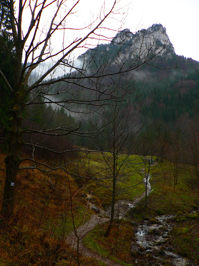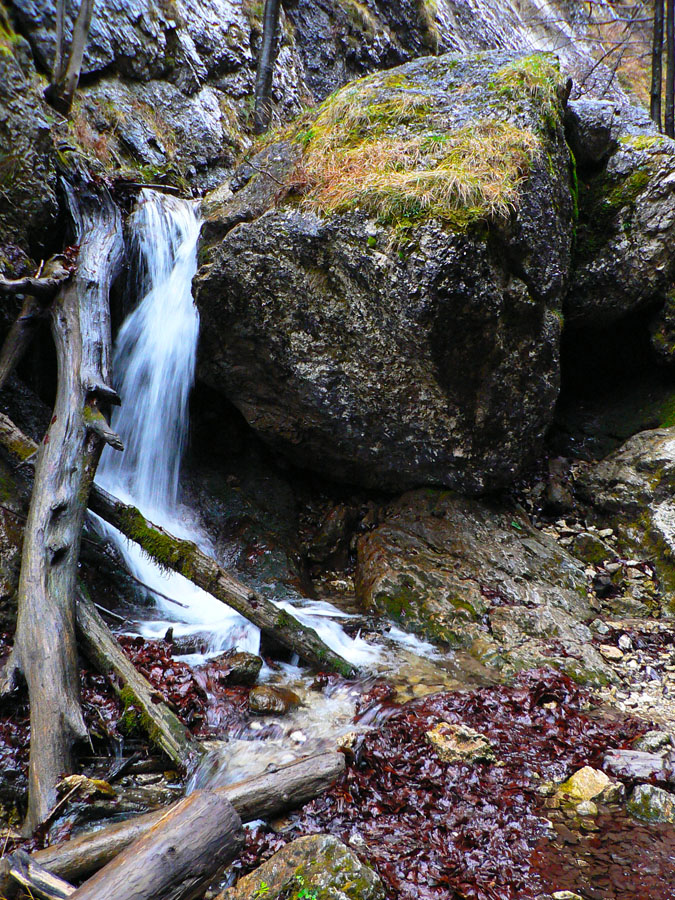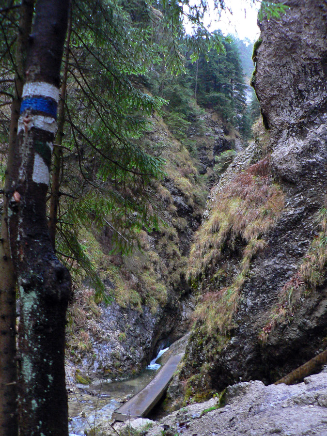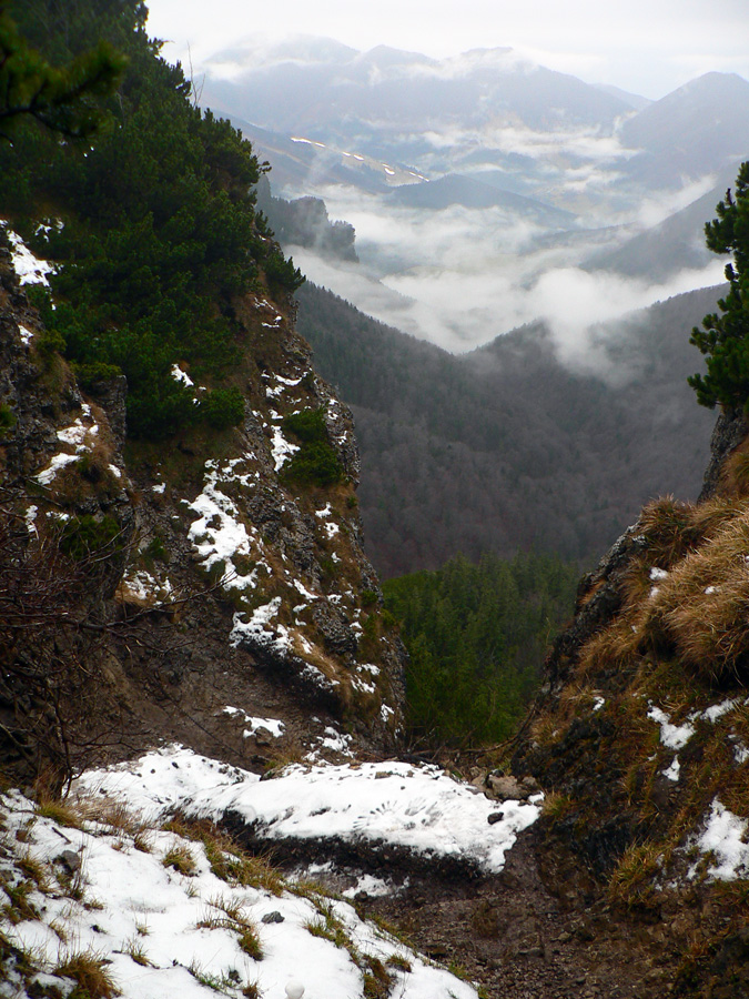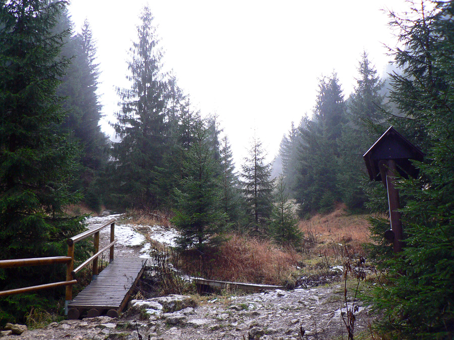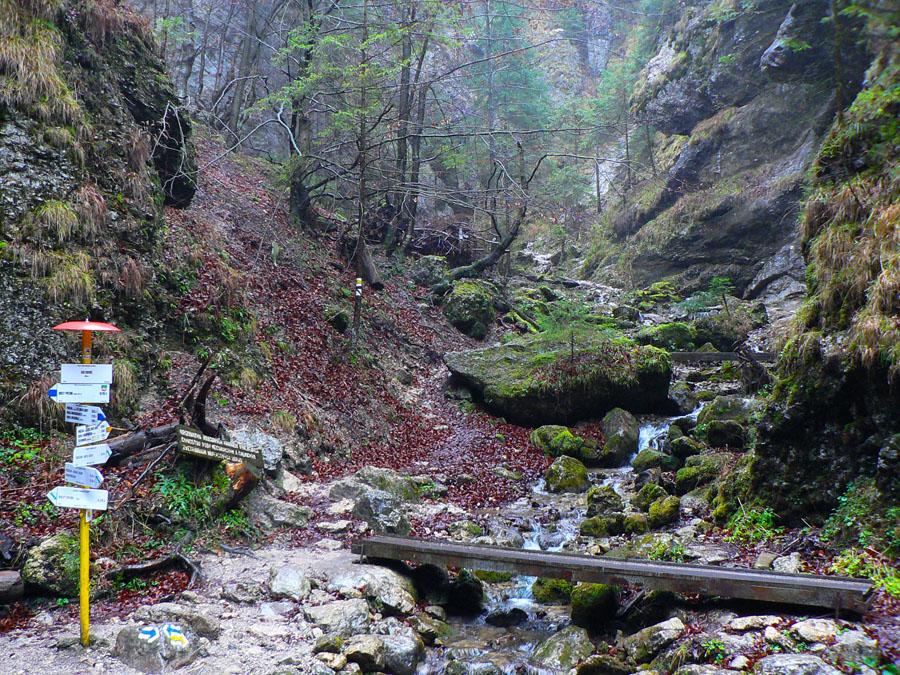 Počasie na mikulášsku sobotu vyšlo takmer ideálne hnusné: s občasným dažďom a hrebeňmi hôr v mrakoch, so zdrapmi hmiel v dolinách a s teplotou málo nad nulou. Aspoň že nefúkalo. Ale v tiesňavách pod Rozsutcom je pekne, aj keď je škaredo :-) Navyše v takomto počasí tam človek nestretne ani nohu, čo je vzácna príležitosť vychutnať si prírodu bez uhýbania, posúvania v rade - a najmä v tichu. A pre niekoho aj príležitosť zaexperimentovať si v pokoji so samospúšťou a manuálnym nastavením expozície pri fotení. Dosť užitočné pri slabom svetle, aké v „Dierach“ väčšinou panuje - a v decembrovom šere zvlášť :-) Takže som začal z Bieleho potoka od hotela, s plánom užiť si a presnoriť všetky tiesňavy. Na začiatok som prešiel po modrej Dolnými dierami na Podžiar a zišiel som nazad, ale už len k rázcestiu Ostrvné. To bola dobrá rozcvička s malým stúpaním, atraktívnymi úzkymi kaňonmi a keď tam nikoho niet, nie je problém prejsť to v oboch smeroch. V lete sú práve tu najväčšie „zápchy“, lebo ľudia chodia húfne z Bieleho potoka aj z opačnej strany, zo Štefanovej.