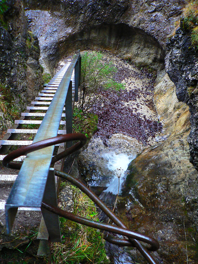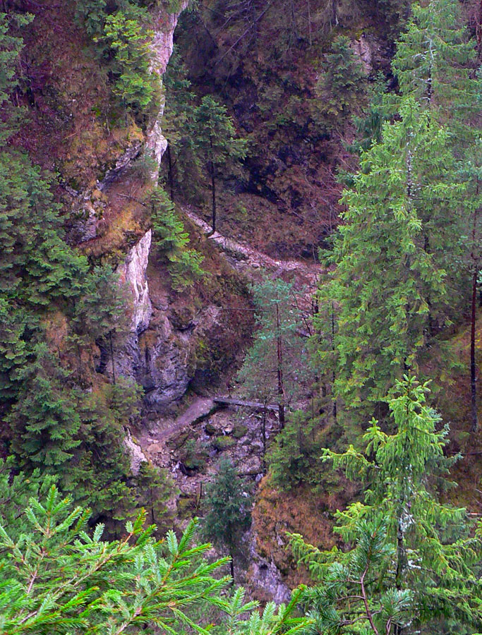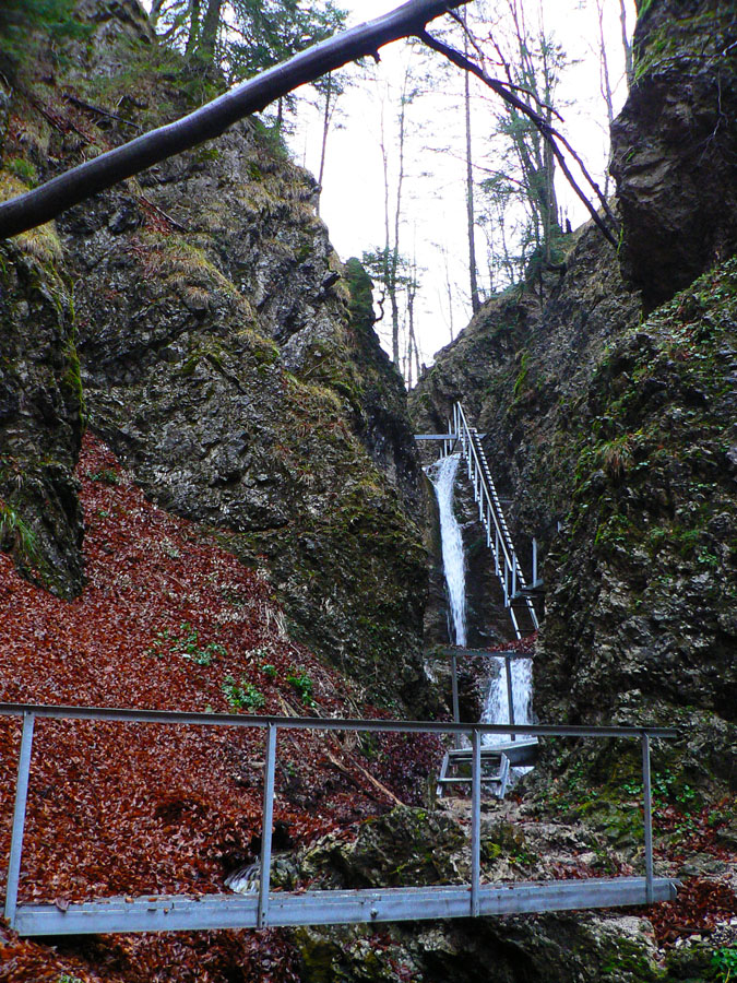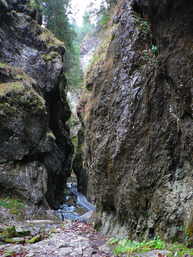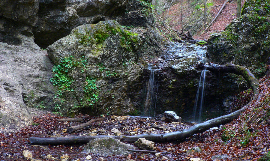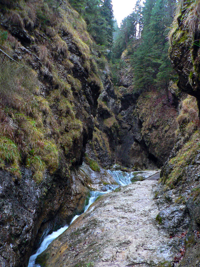 Počasie na mikulášsku sobotu vyšlo takmer ideálne hnusné: s občasným dažďom a hrebeňmi hôr v mrakoch, so zdrapmi hmiel v dolinách a s teplotou málo nad nulou. Aspoň že nefúkalo. Ale v tiesňavách pod Rozsutcom je pekne, aj keď je škaredo :-) Navyše v takomto počasí tam človek nestretne ani nohu, čo je vzácna príležitosť vychutnať si prírodu bez uhýbania, posúvania v rade - a najmä v tichu. A pre niekoho aj príležitosť zaexperimentovať si v pokoji so samospúšťou a manuálnym nastavením expozície pri fotení. Dosť užitočné pri slabom svetle, aké v „Dierach“ väčšinou panuje - a v decembrovom šere zvlášť :-) Takže som začal z Bieleho potoka od hotela, s plánom užiť si a presnoriť všetky tiesňavy. Na začiatok som prešiel po modrej Dolnými dierami na Podžiar a zišiel som nazad, ale už len k rázcestiu Ostrvné. To bola dobrá rozcvička s malým stúpaním, atraktívnymi úzkymi kaňonmi a keď tam nikoho niet, nie je problém prejsť to v oboch smeroch. V lete sú práve tu najväčšie „zápchy“, lebo ľudia chodia húfne z Bieleho potoka aj z opačnej strany, zo Štefanovej.
