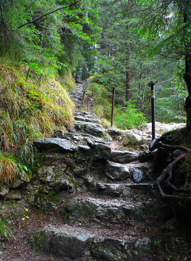 Rovnako aj smerom dole, po zelenej. Na to som sa zvlášť tešil, lebo tade som ešte nešiel. Takže som si užil najskôr pár stoviek metrov „zlaňovania“ po reťaziach (sutina alebo klzký vápenec ako smerom hore z druhej strany) a následný strmý zostup lesom do osady Podrozsutec. Potom už len posledný úsek zablatenými lúkami a lesmi, nazad k parkovisku pri hoteli, odkiaľ som ráno vyrazil.