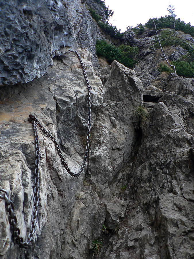 Potom ma už chodník „vypľul“ v sedle medzi Rozsutcami. Kým Veľký Rozsutec bol zahalený v mraku, malý pyšne dominoval okoliu. Presne to som potreboval. Krátky presun po lúkach a o chvíľu už som „feratoval“ po reťaziach na vrchol. Výhľady samozrejme nič moc, svetlo biedne, krajina do šeda, ale mraky dostatočne vysoko a to bralo a cesta naň stojí za to v každom počasí.